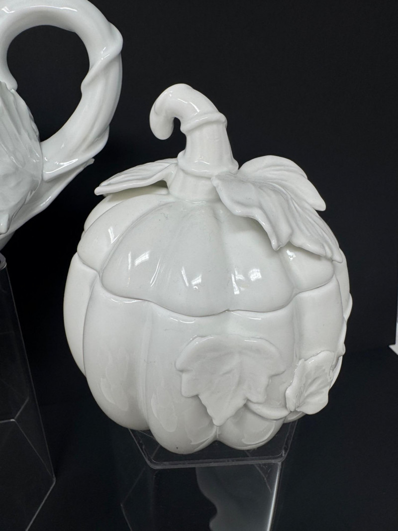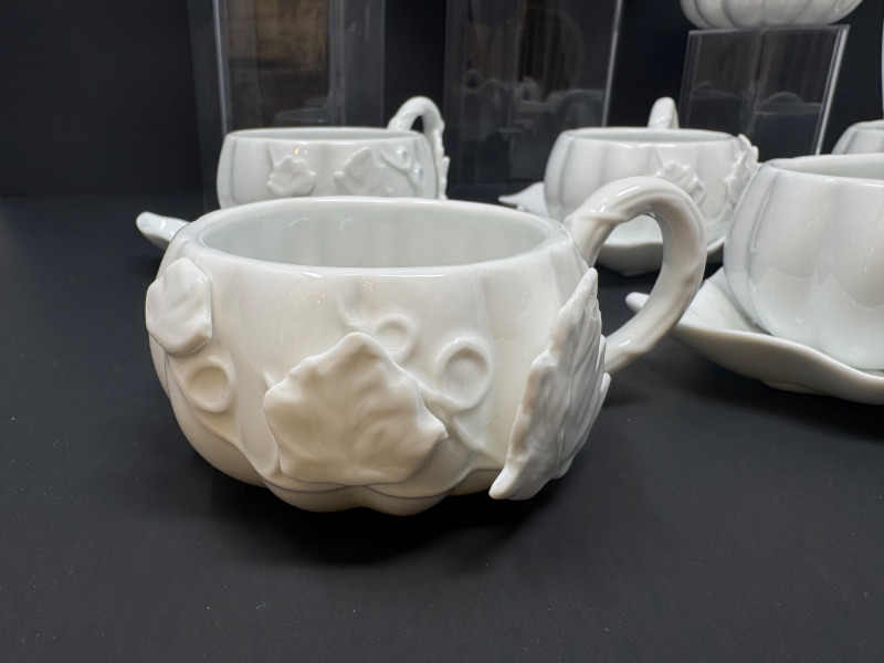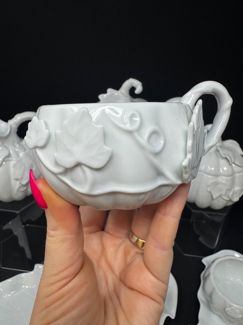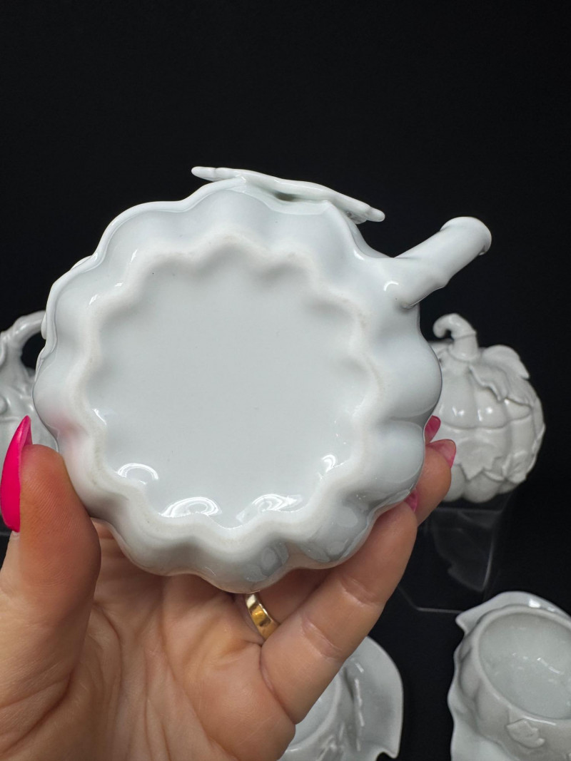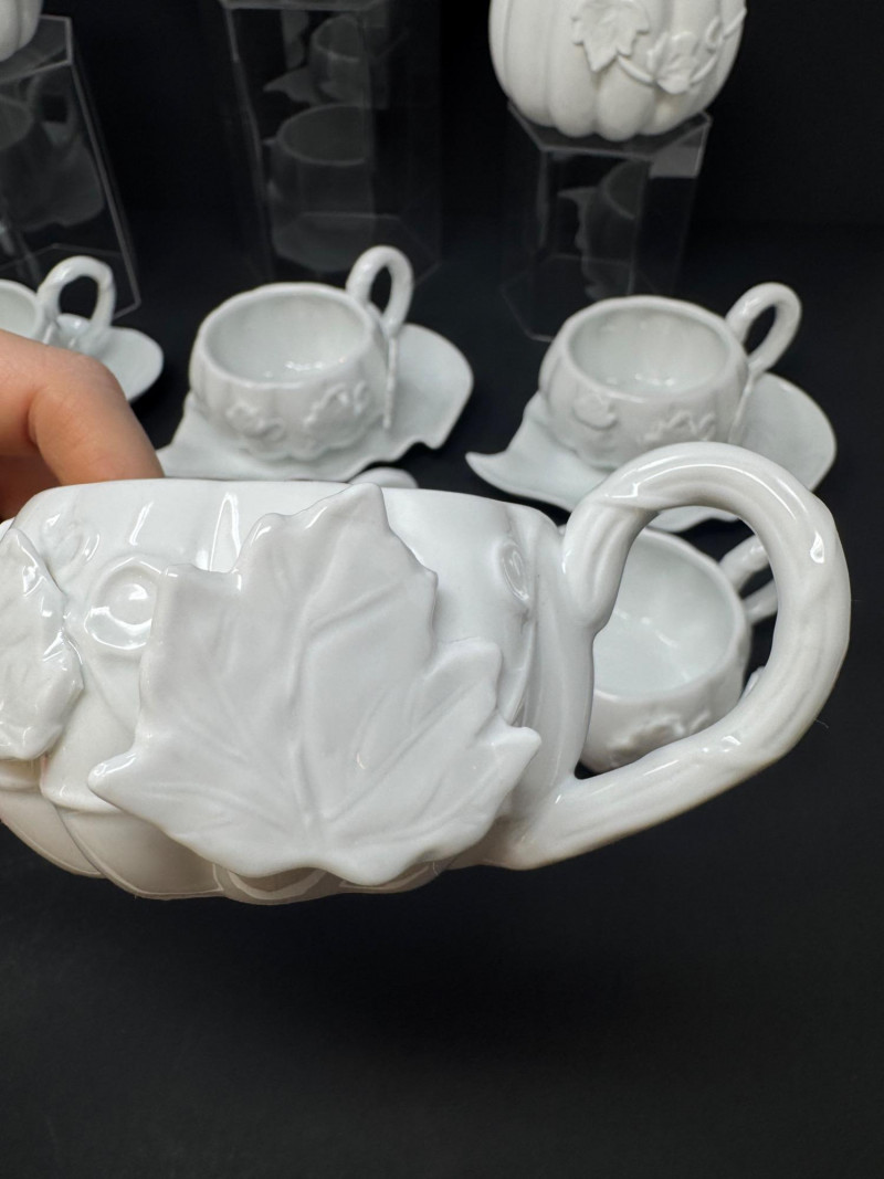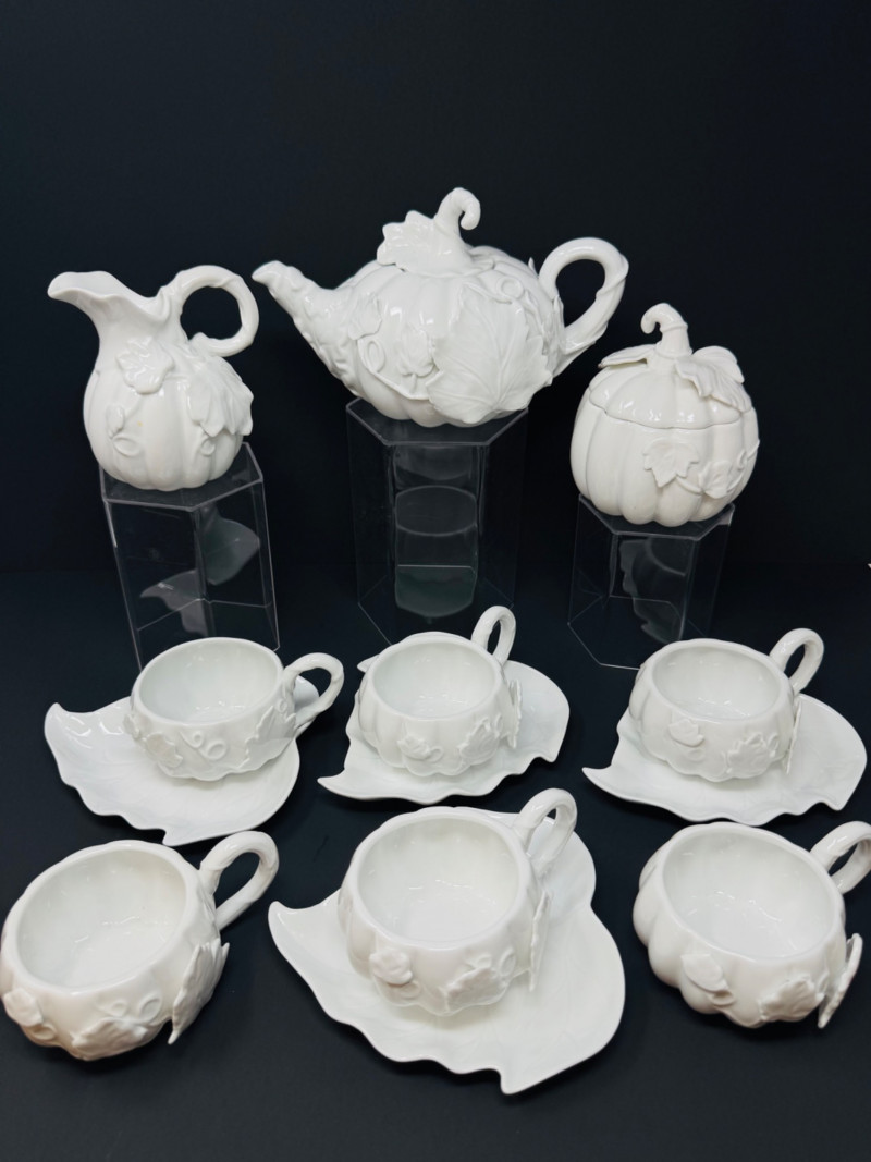 Porcelain Pumpkin & Leaf Teapot Set w/ Cups & Fall Saucer Plates. Disclaimer: Two teacups are missing saucers.