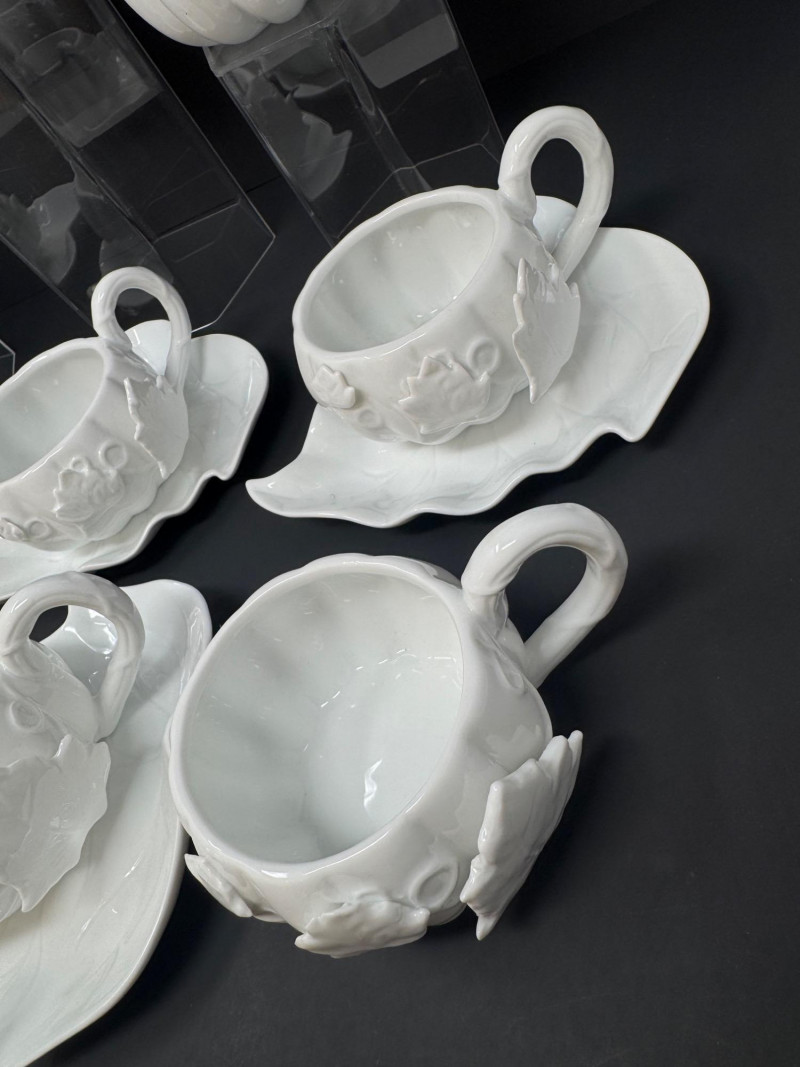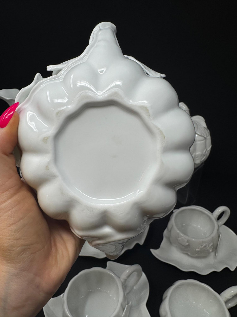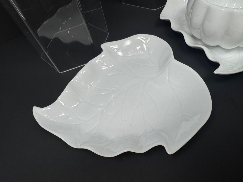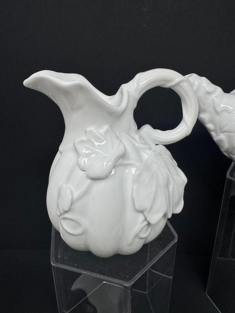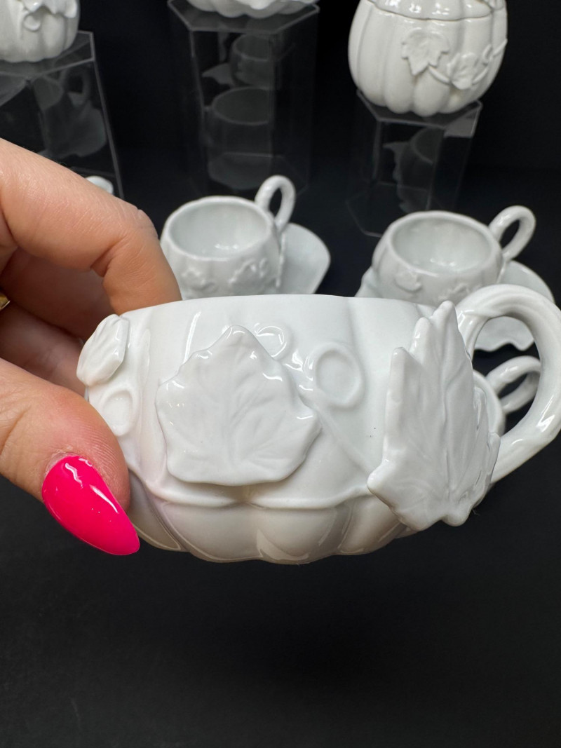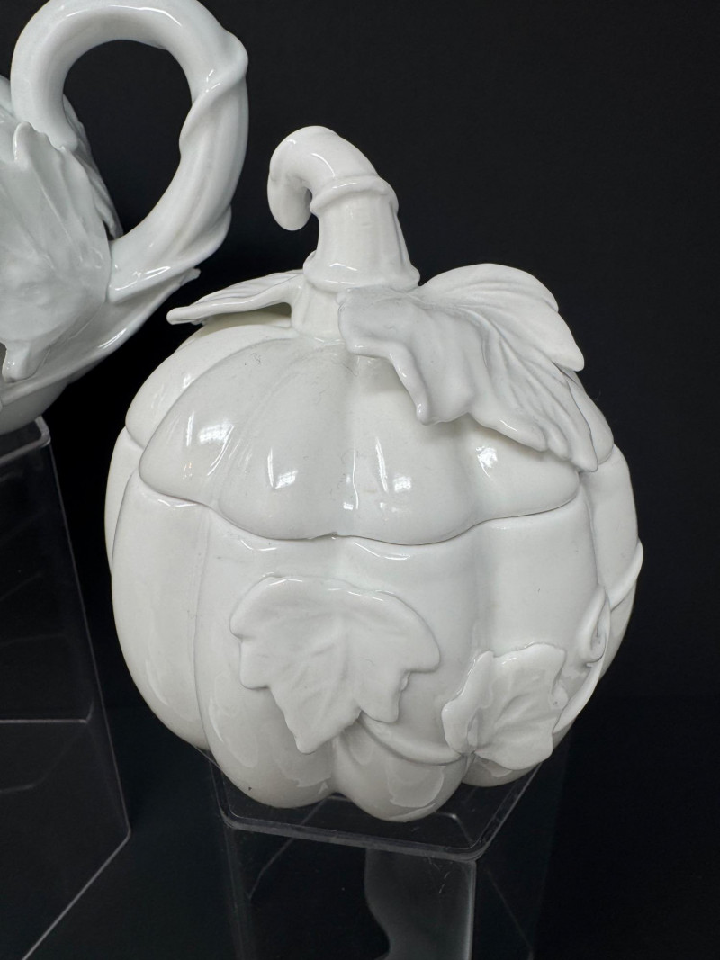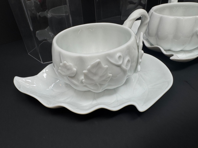 Porcelain Pumpkin & Leaf Teapot Set w/ Cups & Fall Saucer Plates. Disclaimer: Two teacups are missing saucers.