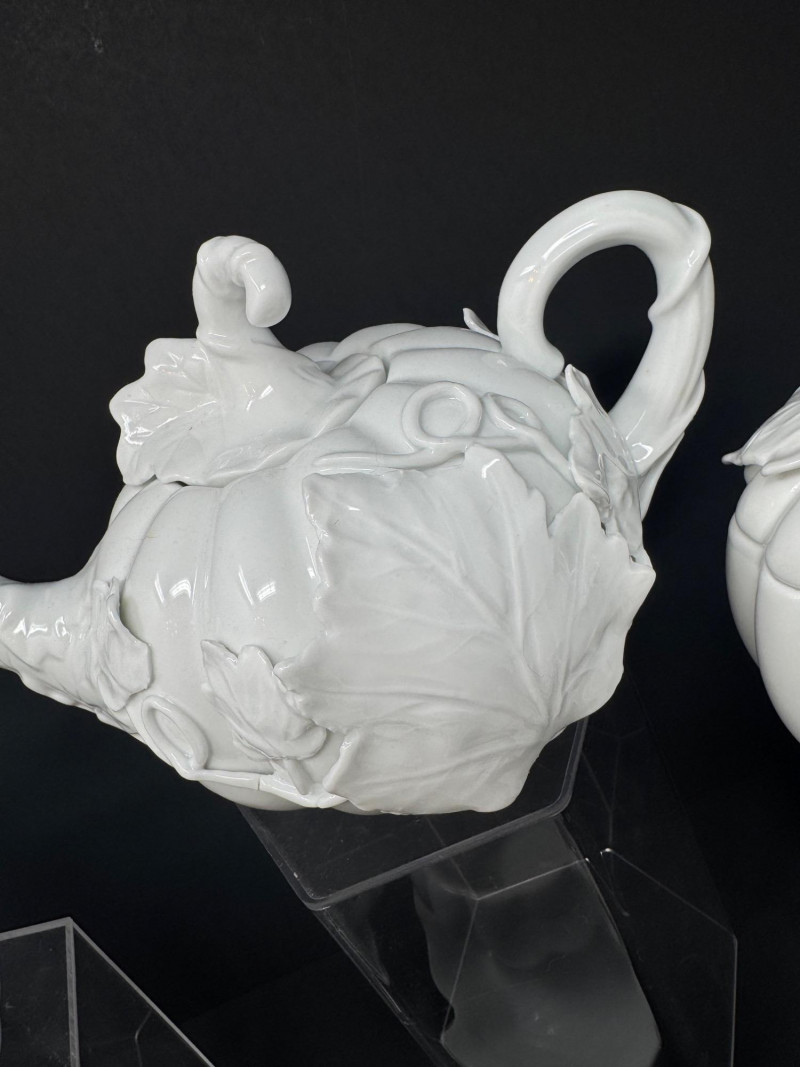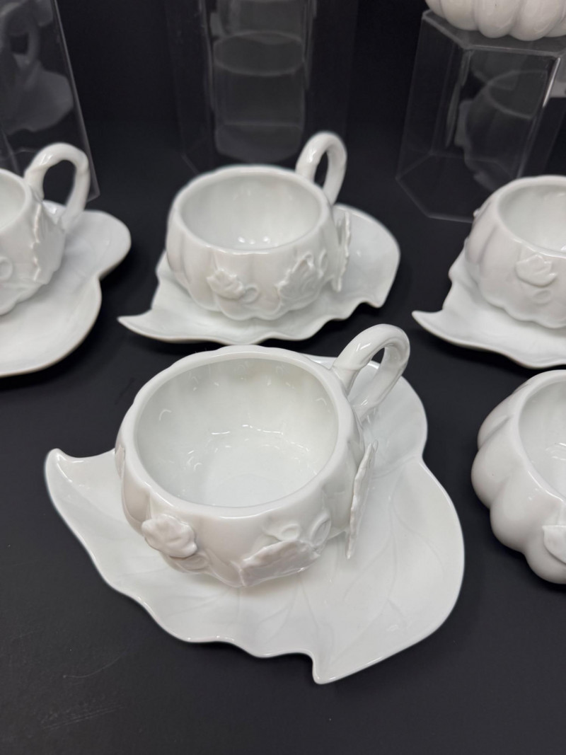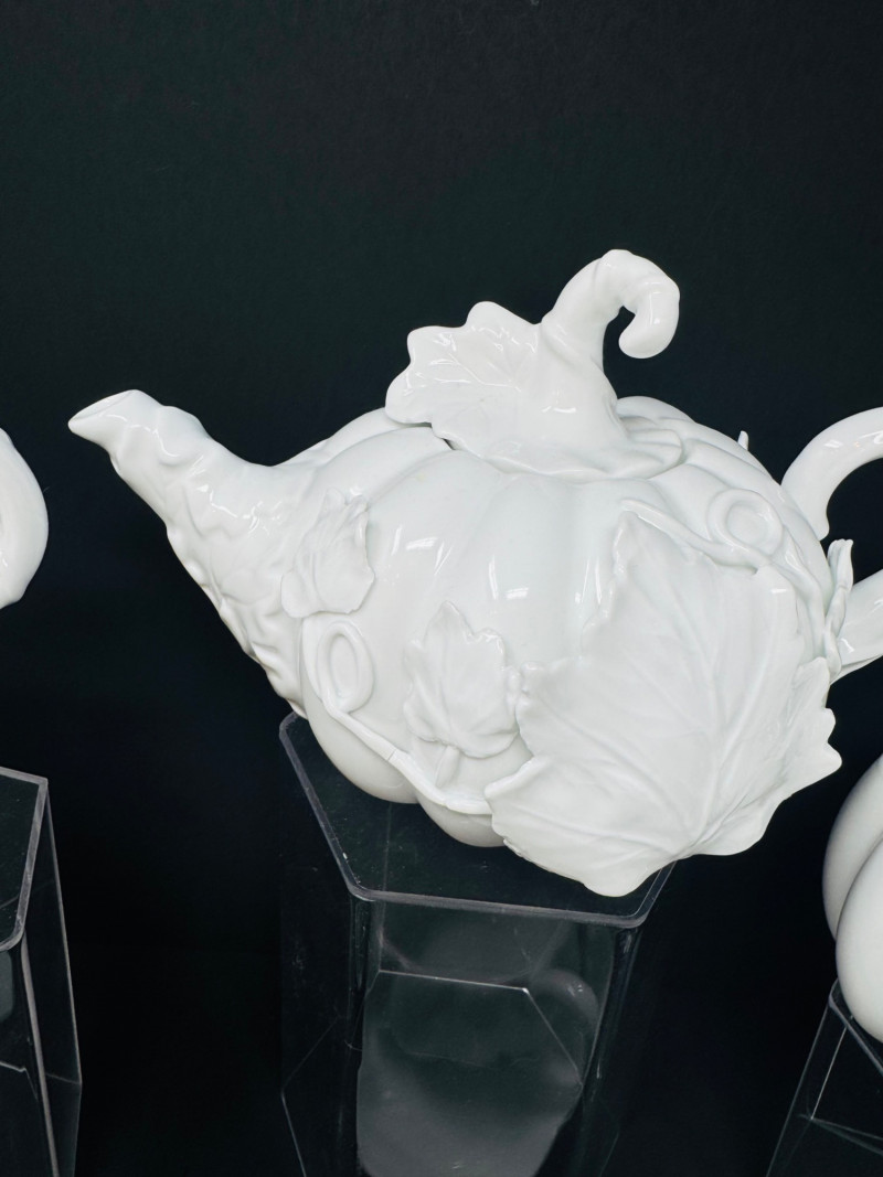 Lot # 17 - Porcelain Pumpkin & Leaf Teapot Set w/ Cups & Fall Saucer Plates