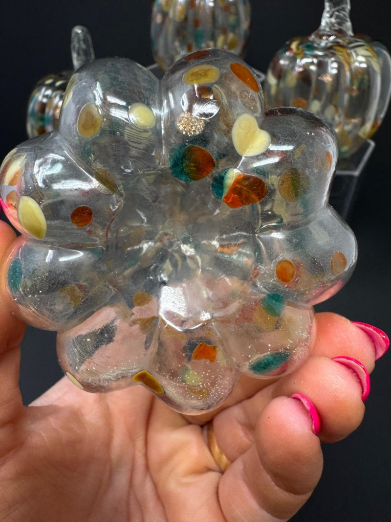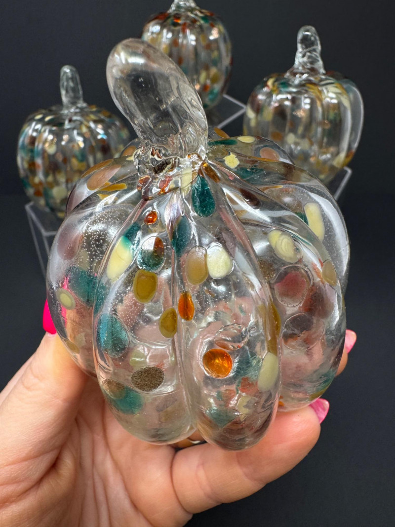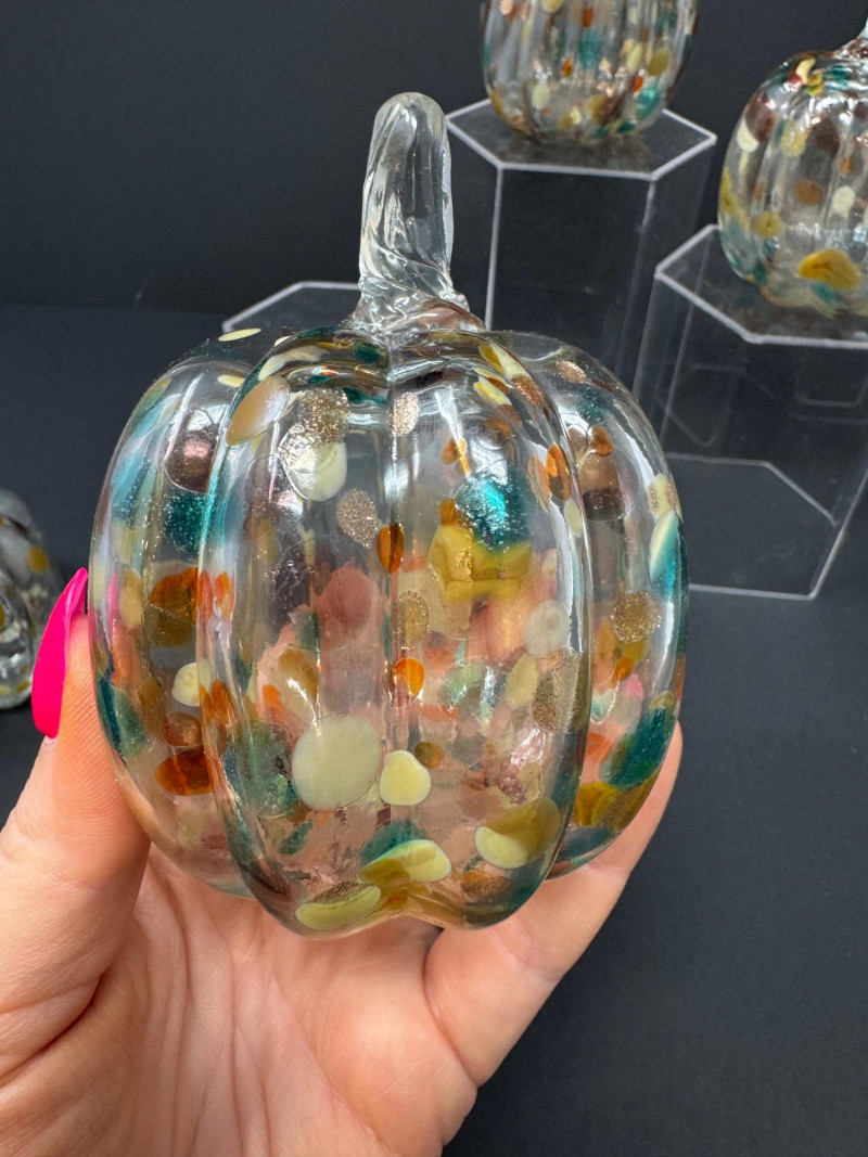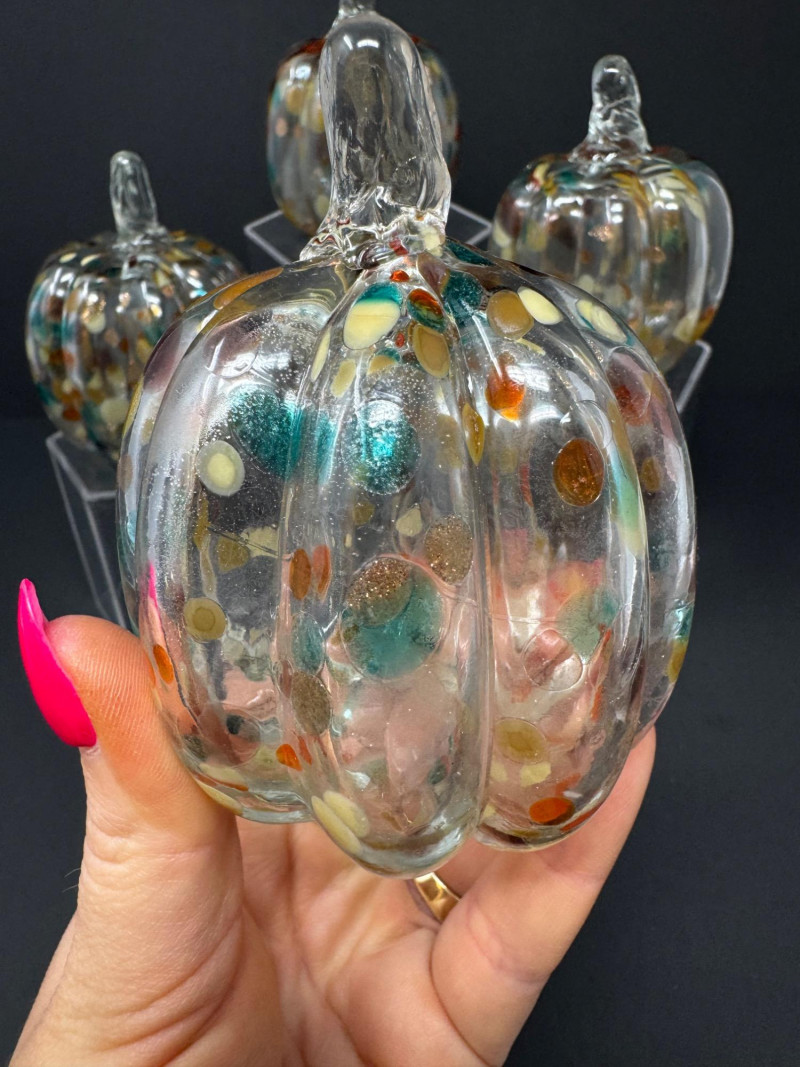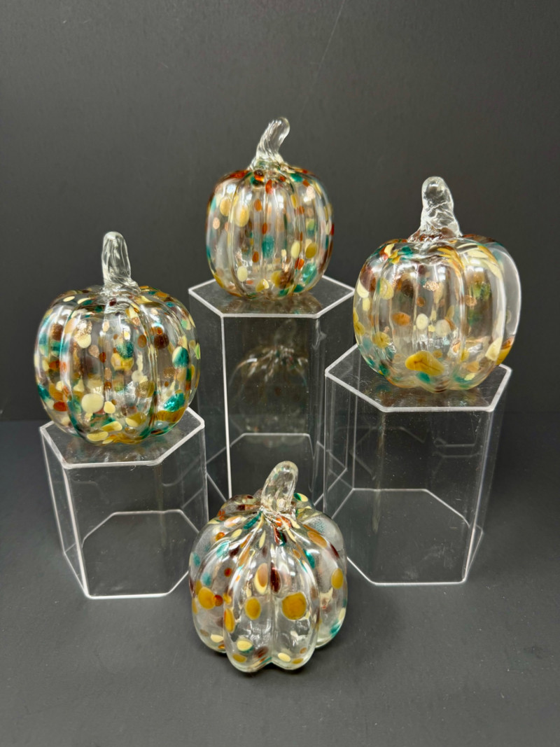 Set of 4 Hand-Blown Confetti Glass Pumpkins – Multicolor. Size 4”