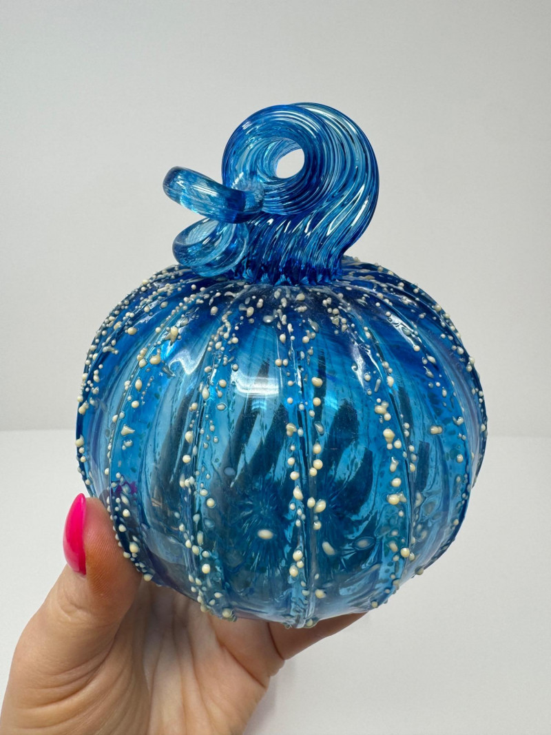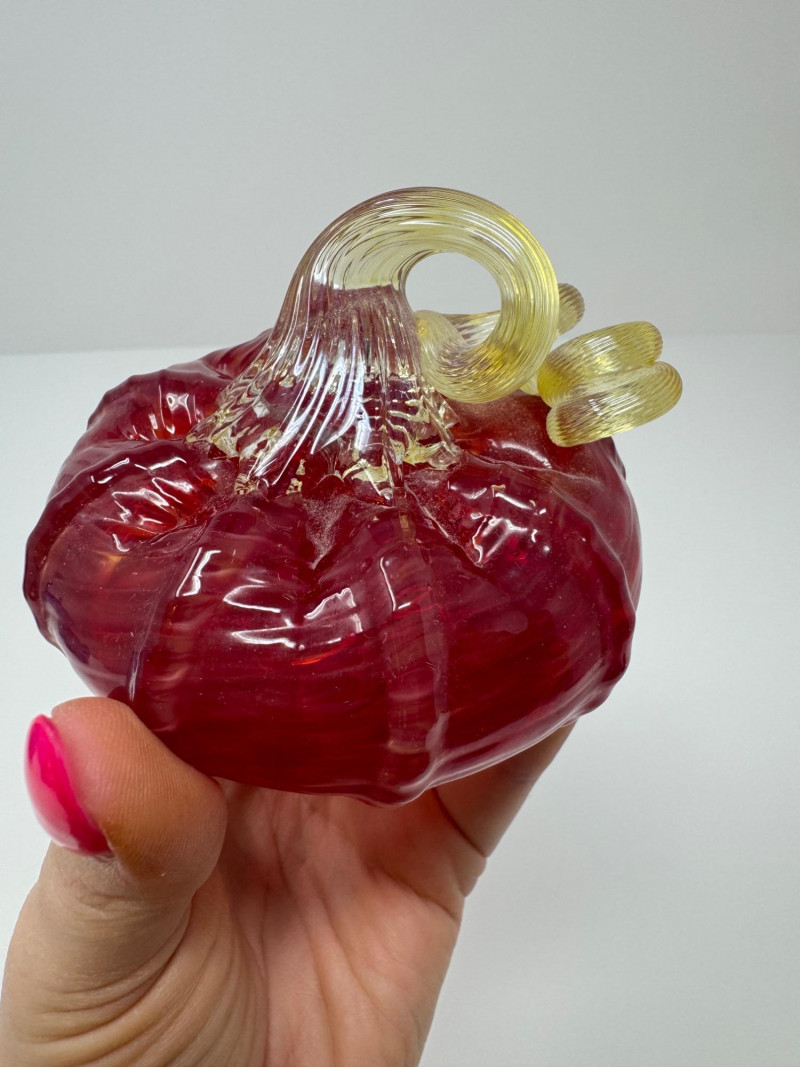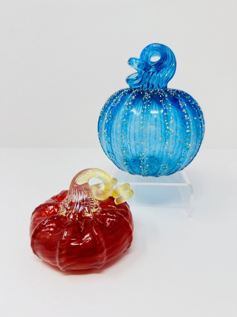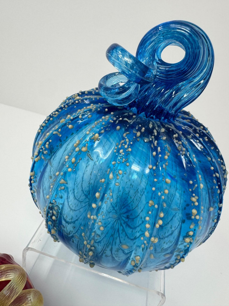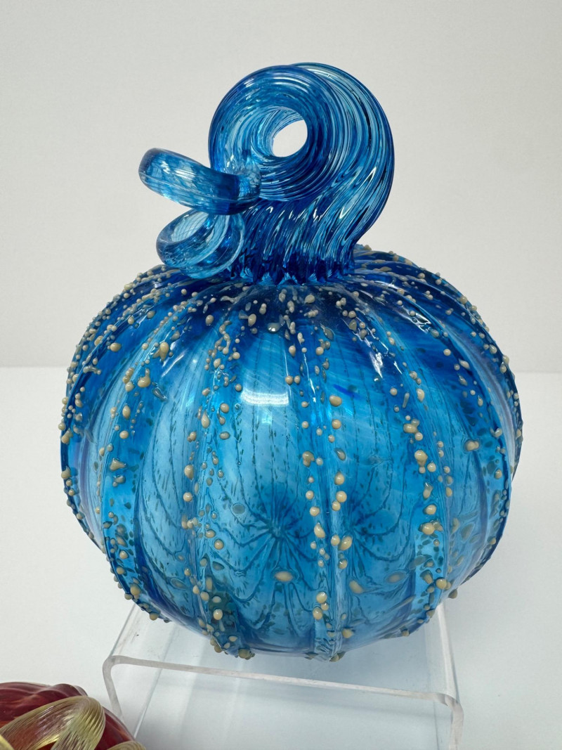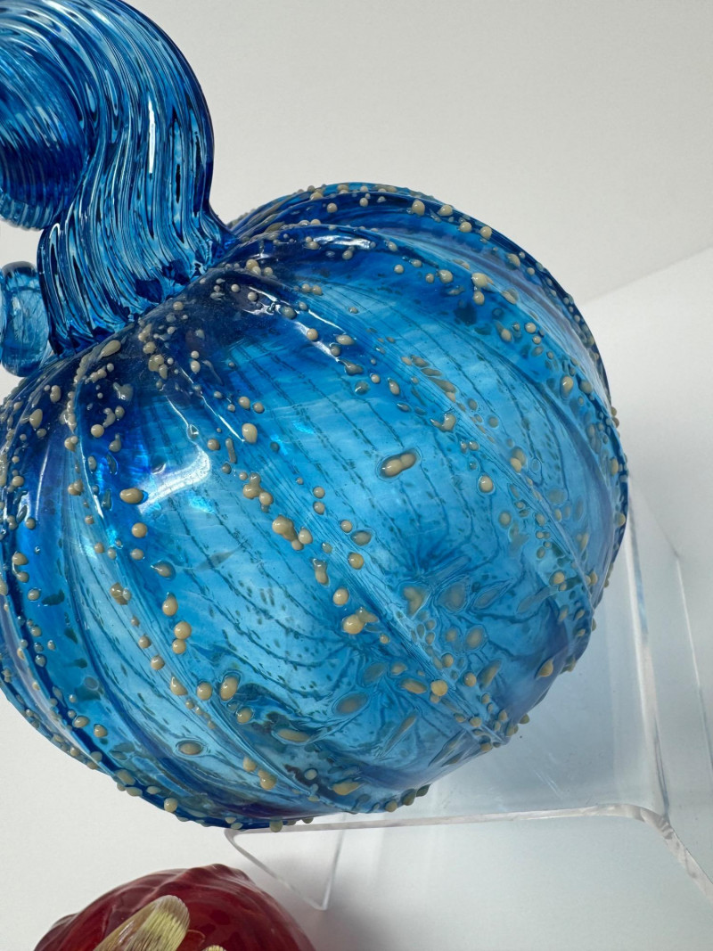 Pair Of Hand-Blown Glass Pumpkins – Red & Blue Confetti. 2.5 - 5” Red pumpkin is artist signed and dated 2012.