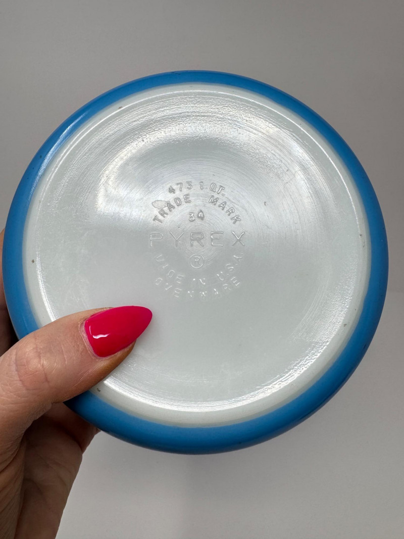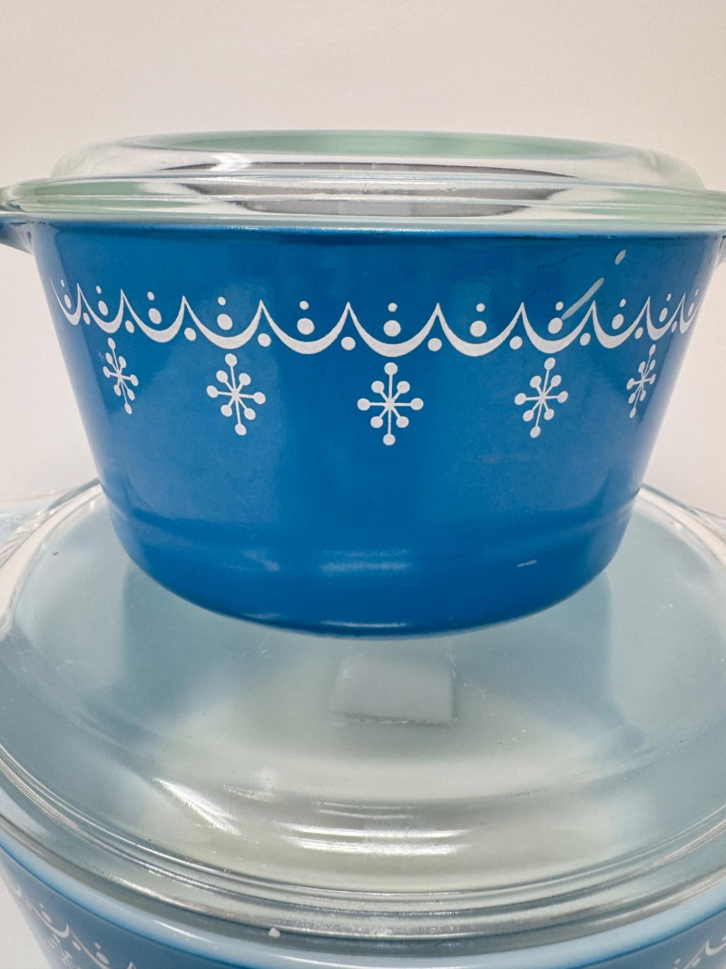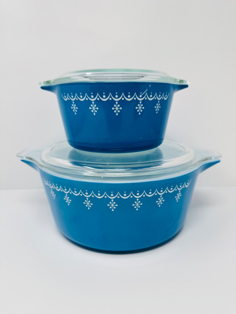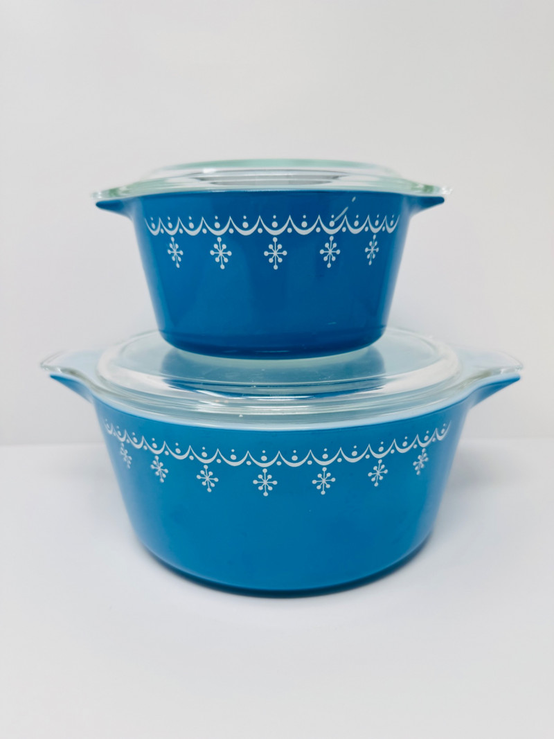 Vintage Pyrex Snowflake Blue Garland Casserole Set w/ Lids, 1 & 2.5 Qt.