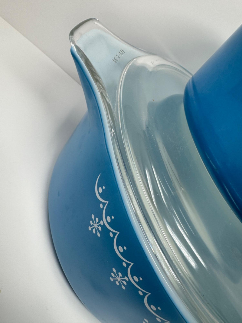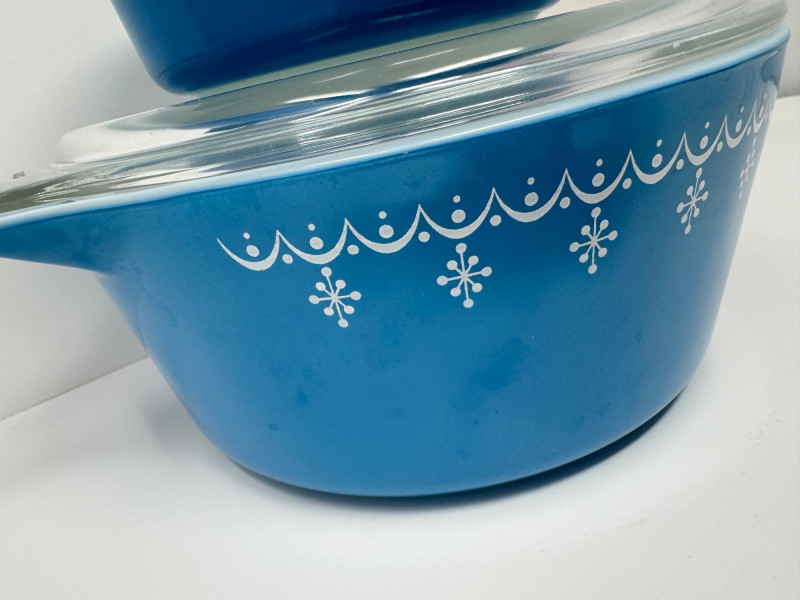 Lot # 32 - Vintage Pyrex Snowflake Blue Garland Casserole Set w/ Lids, 1 & 2.5 Qt