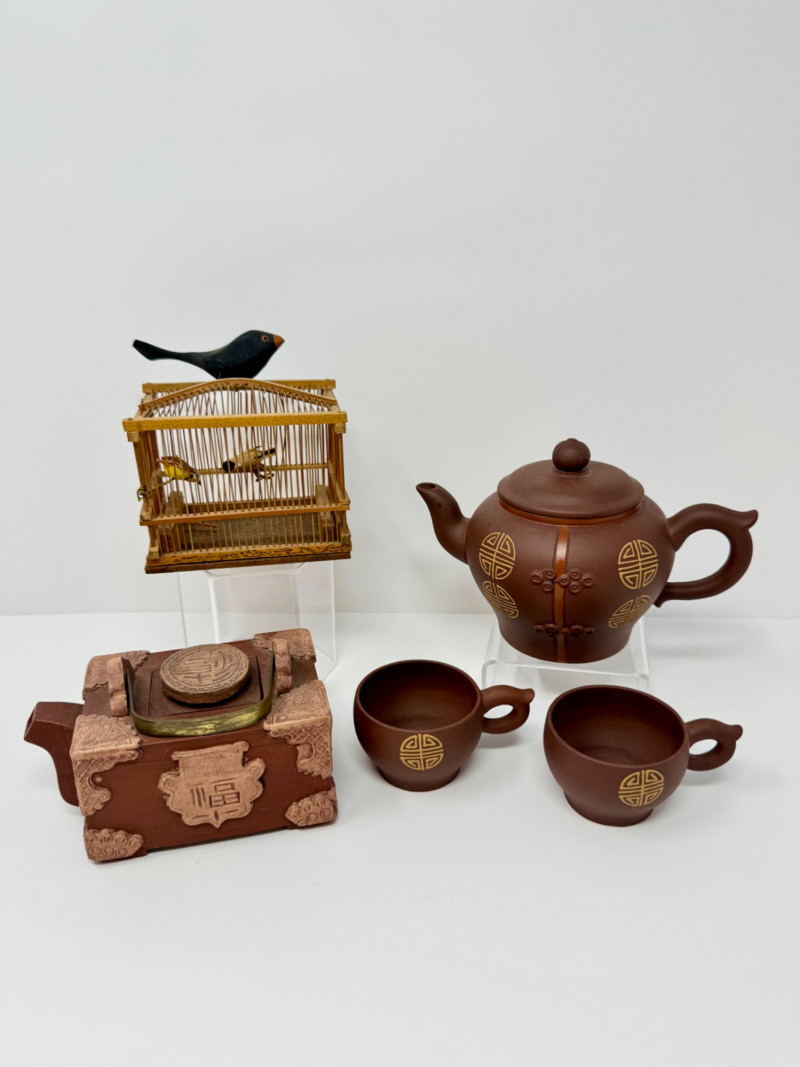 Chinese Yixing Teapots, Cups & Decorative Birdcage.