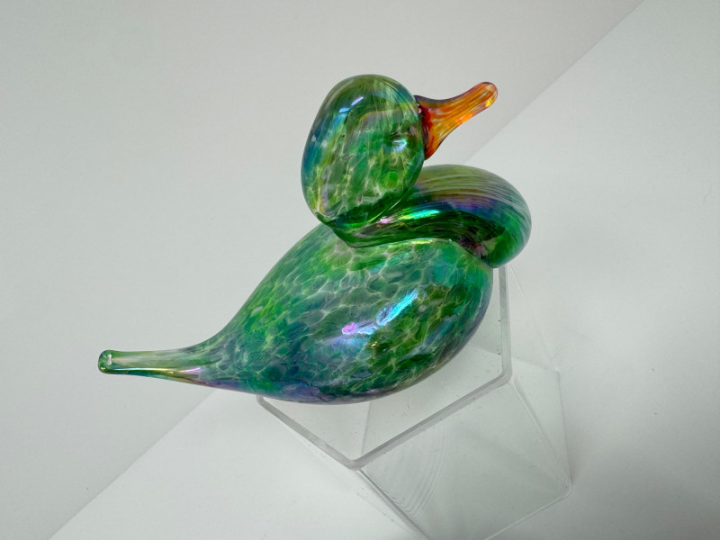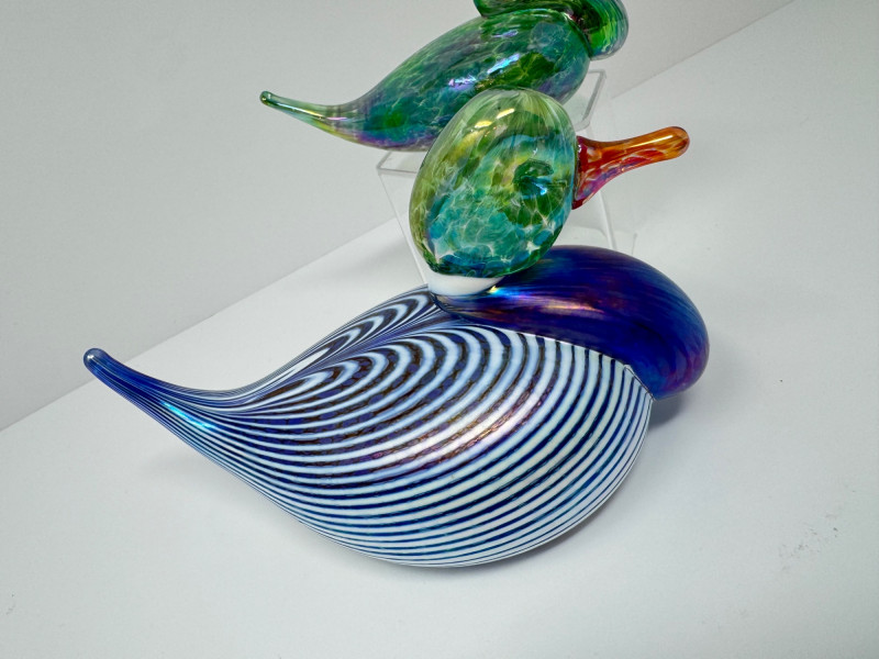 Lot # 50 - Signed Ash Glass Ducks – Iridescent Blue & Green Figurines