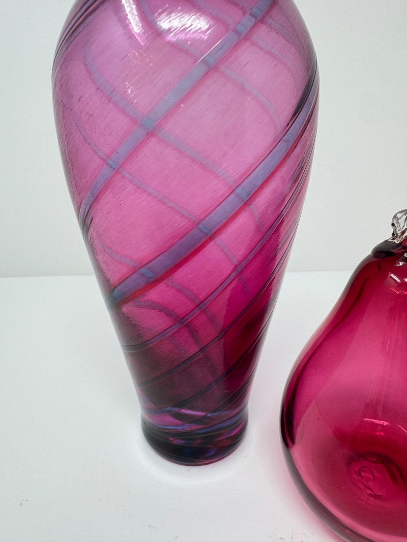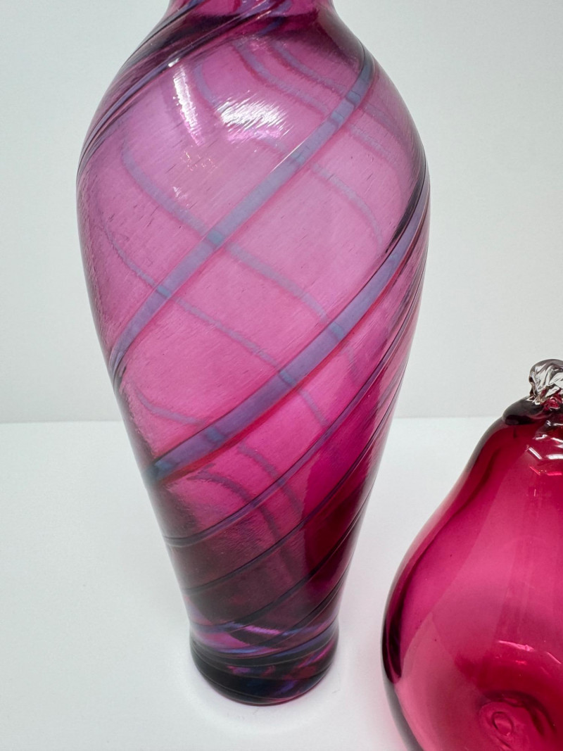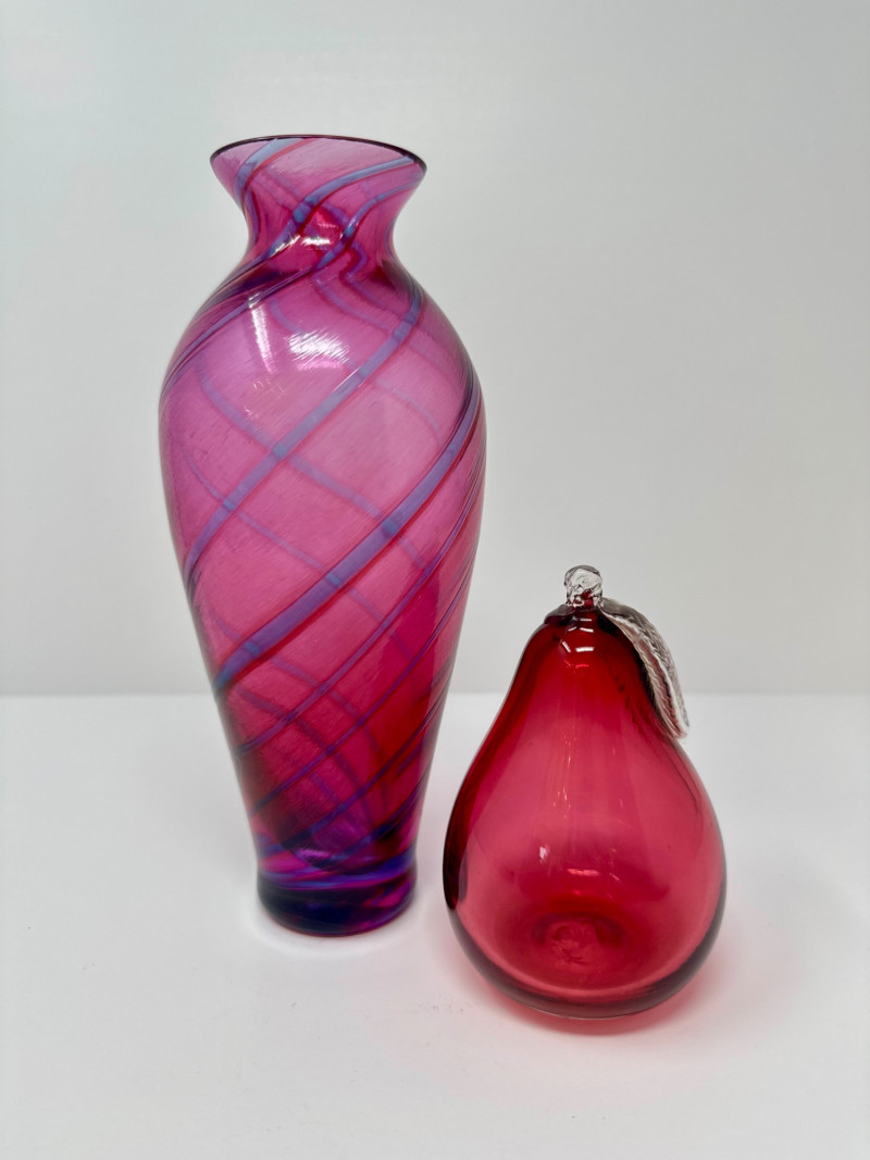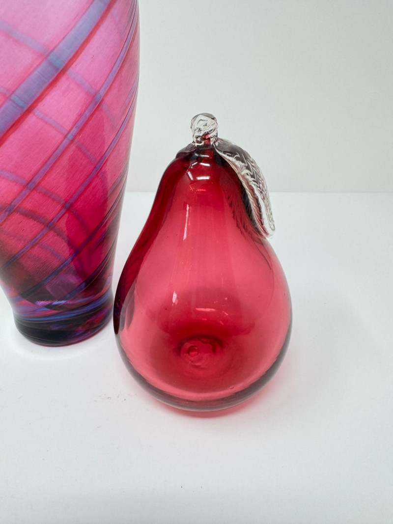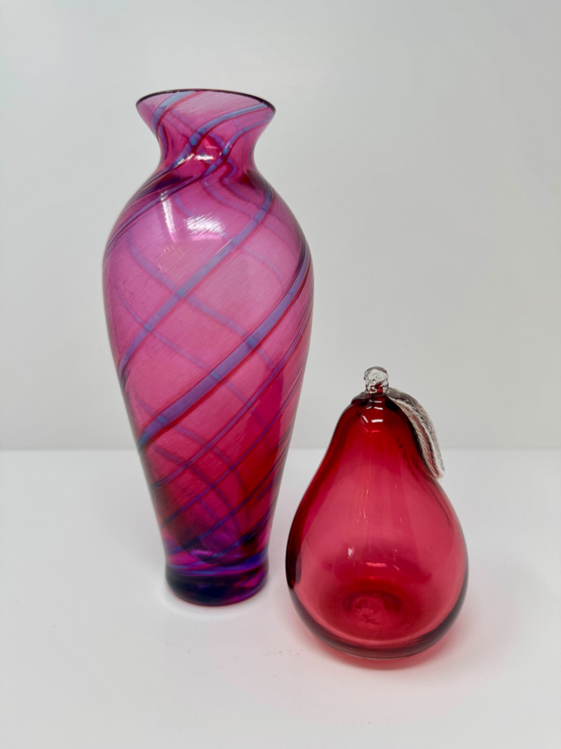Lot # 61 - Hand-Blown Glass Vase w/ a Twisted Design & Cranberry Glass Pear