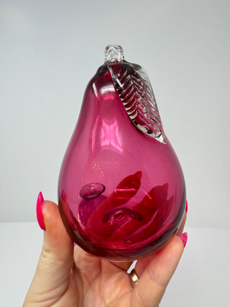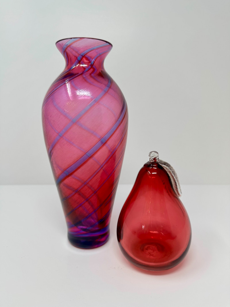 Hand-Blown Glass Vase w/ a Twisted Design & Cranberry Glass Pear. 4.5 - 8.5”