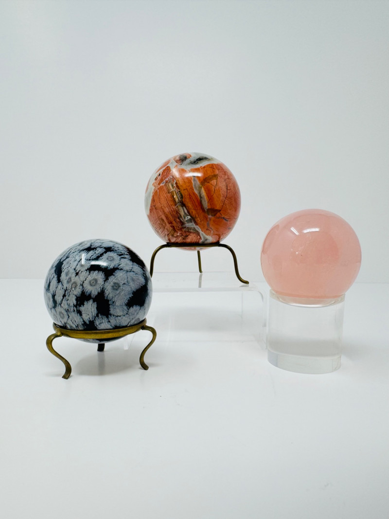 Lot # 62 - Set of 3 Polished Stone Spheres – Likely Rose Quartz, Obsidian, Jasper