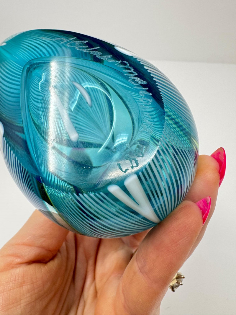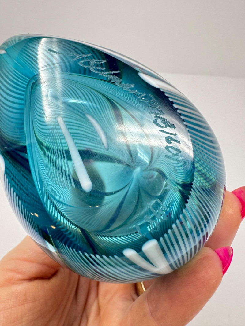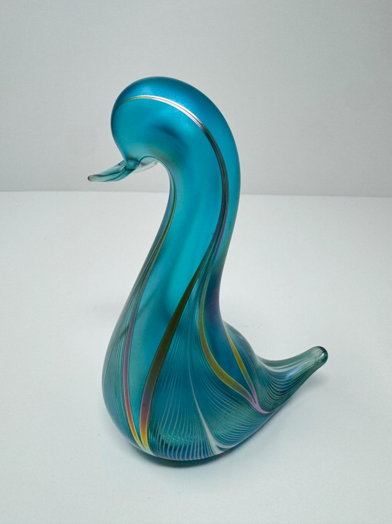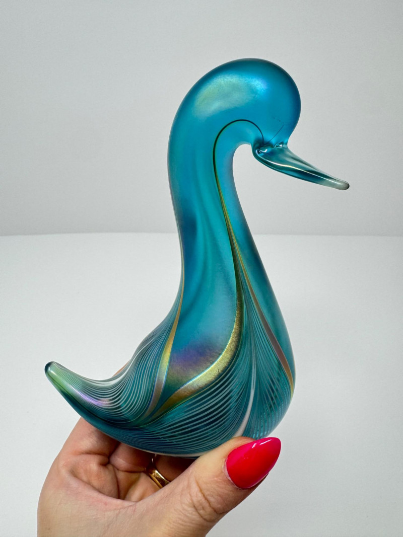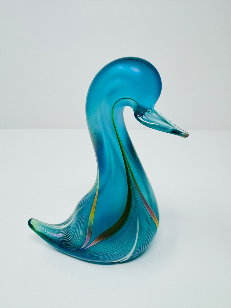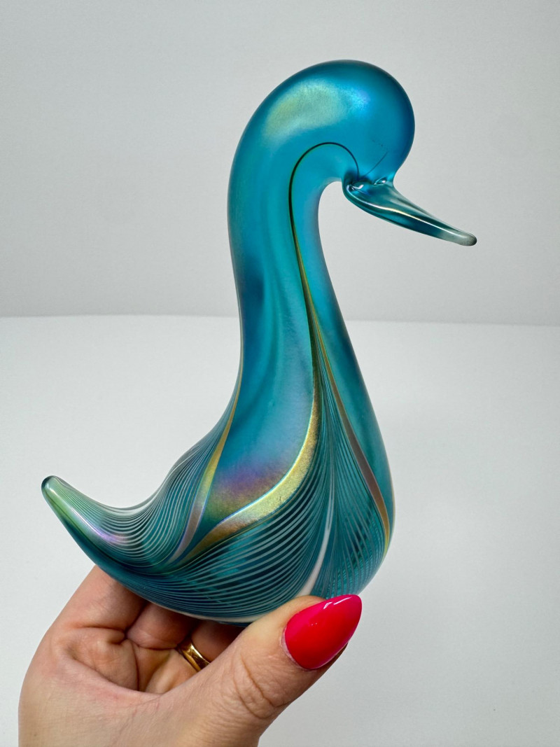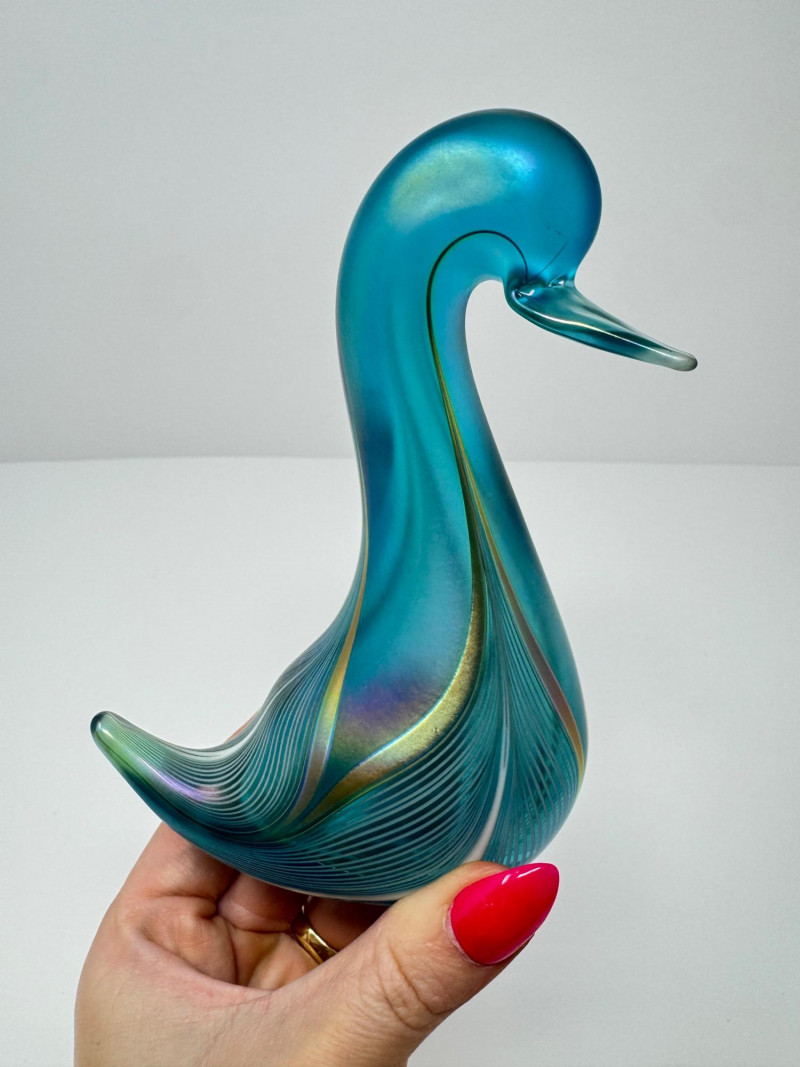 Signed Studio Art Glass Duck Sculpture – Aqua Blue Swirl. Measures approx. 6” tall