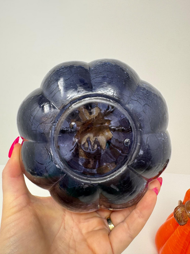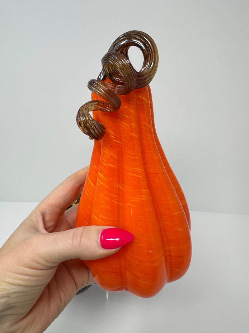 Blown Glass Pumpkins – Orange Gourd & Dark Partial-Molded, Brown Stems. 5-7.5”