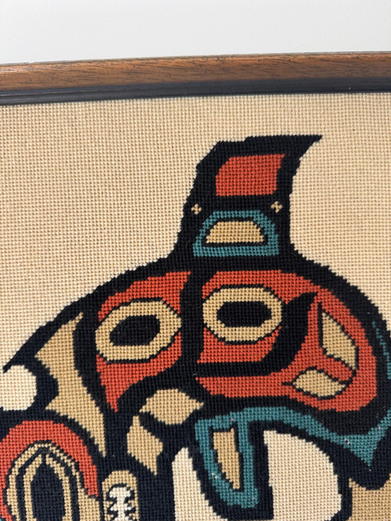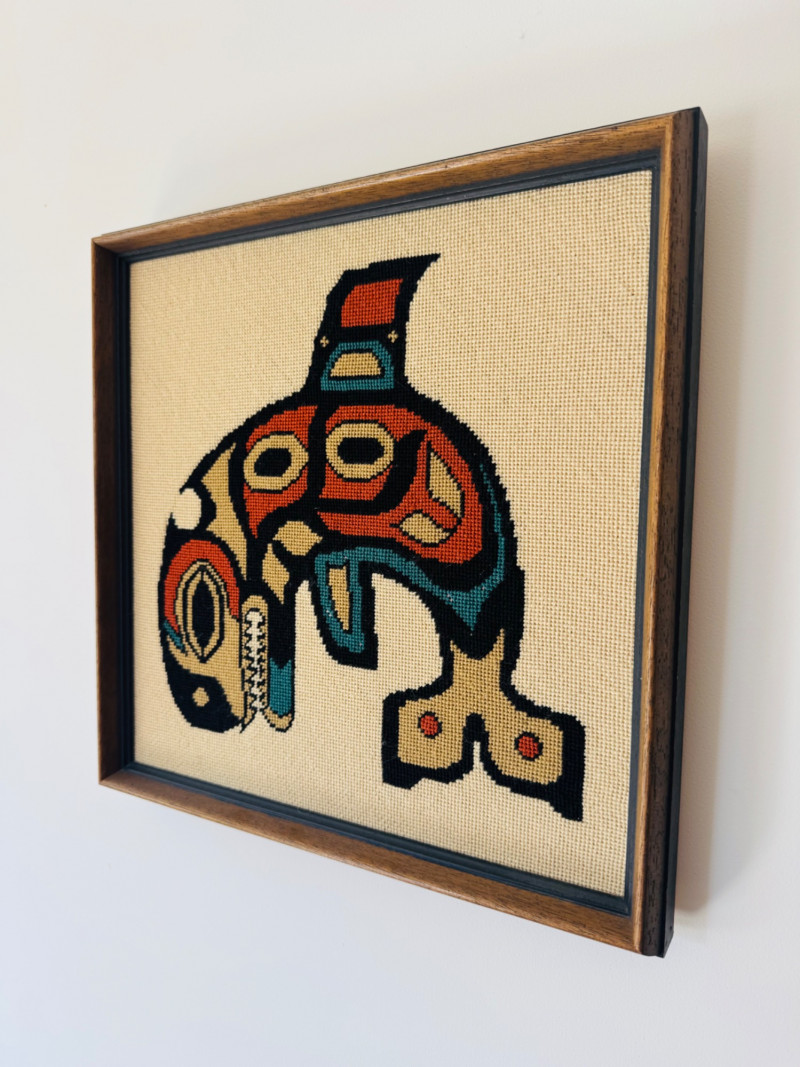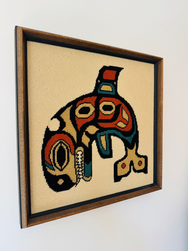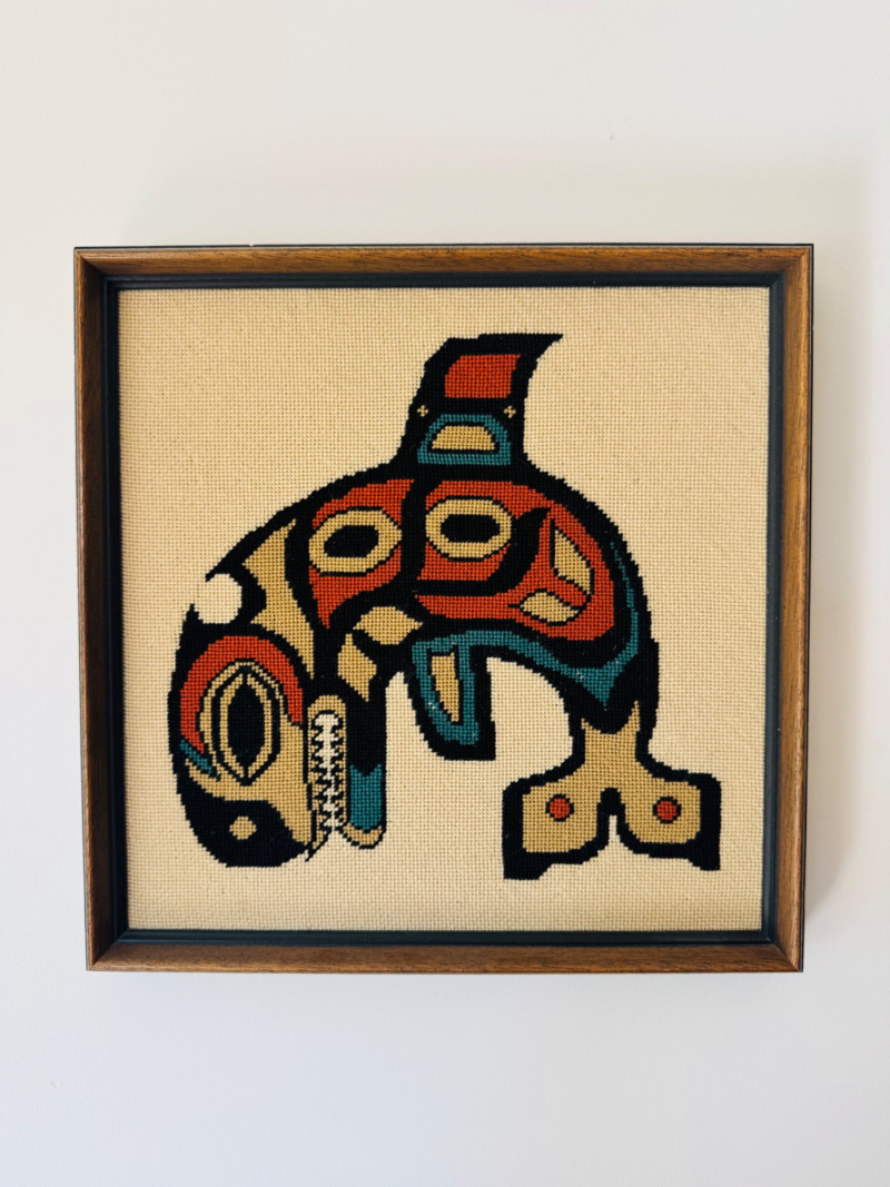 Handmade Needlepoint Orca Wall Art – NW Coast Style, 15” Framed. 15” x 15”