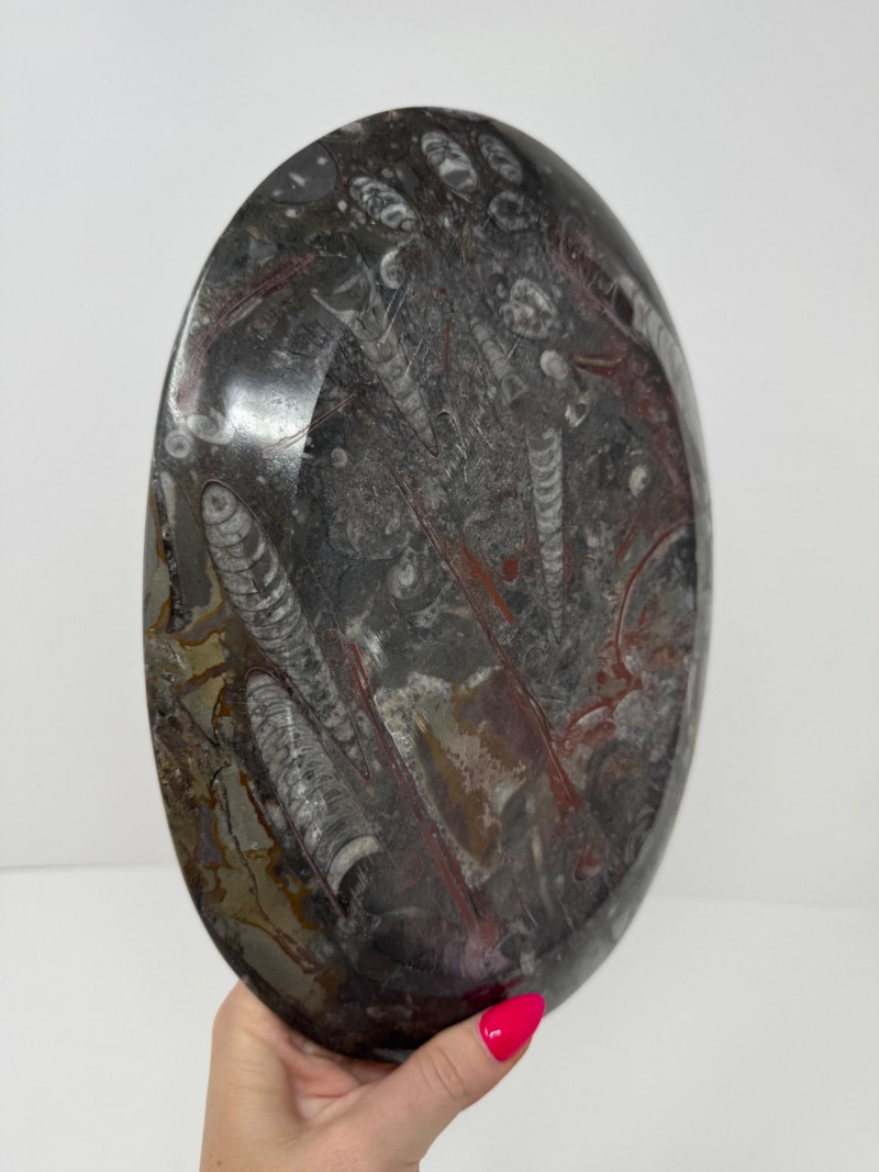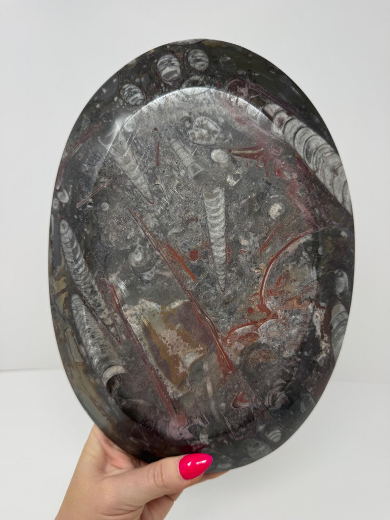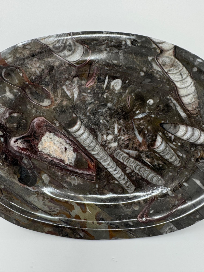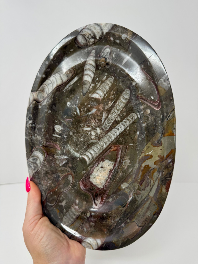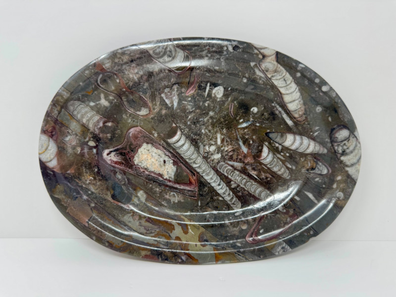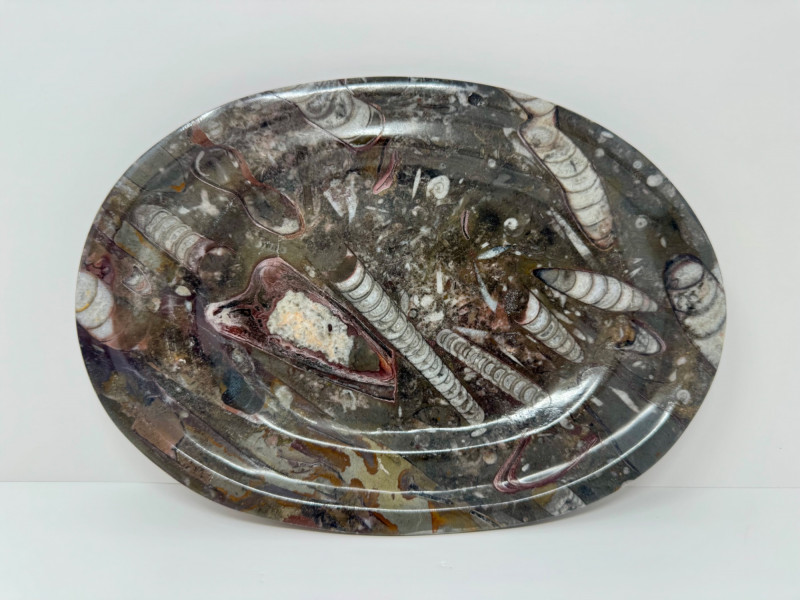 Fossil Stone Platter – Polished Ammonite Sea Shells. Measures approx. 11” long x 8” wide.