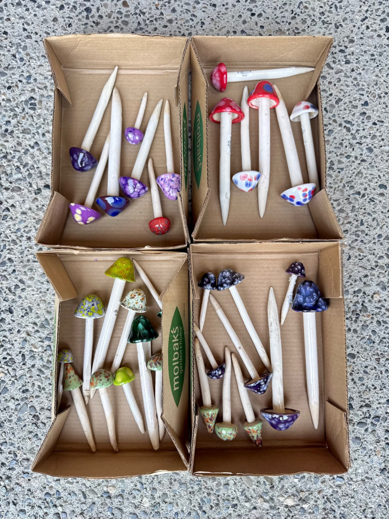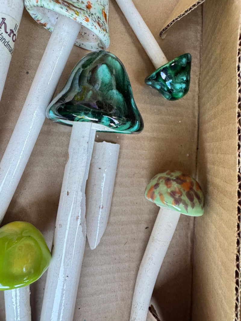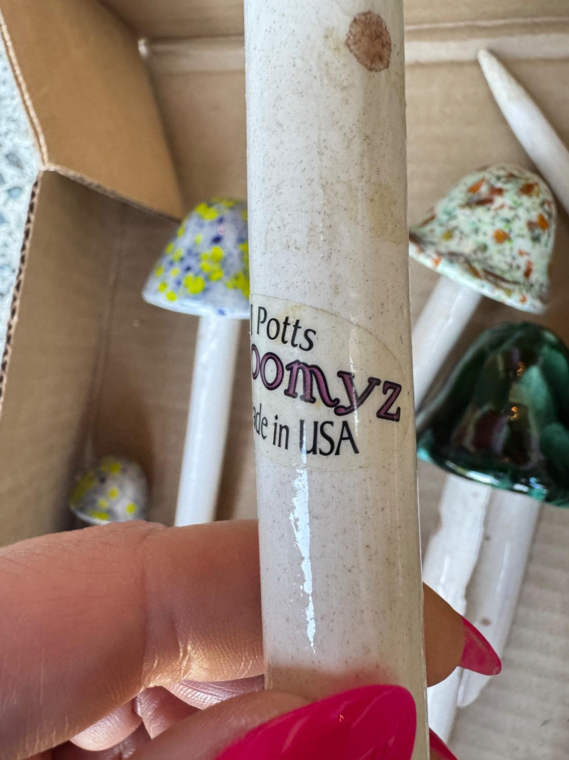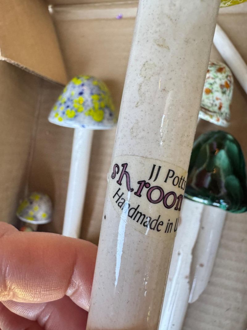 JJ Potts Handmade Ceramic Garden Shroomyz - Set 2. 3.5”- 8.5” Condition Notes: One mushroom requires repair Crack noted in another cap