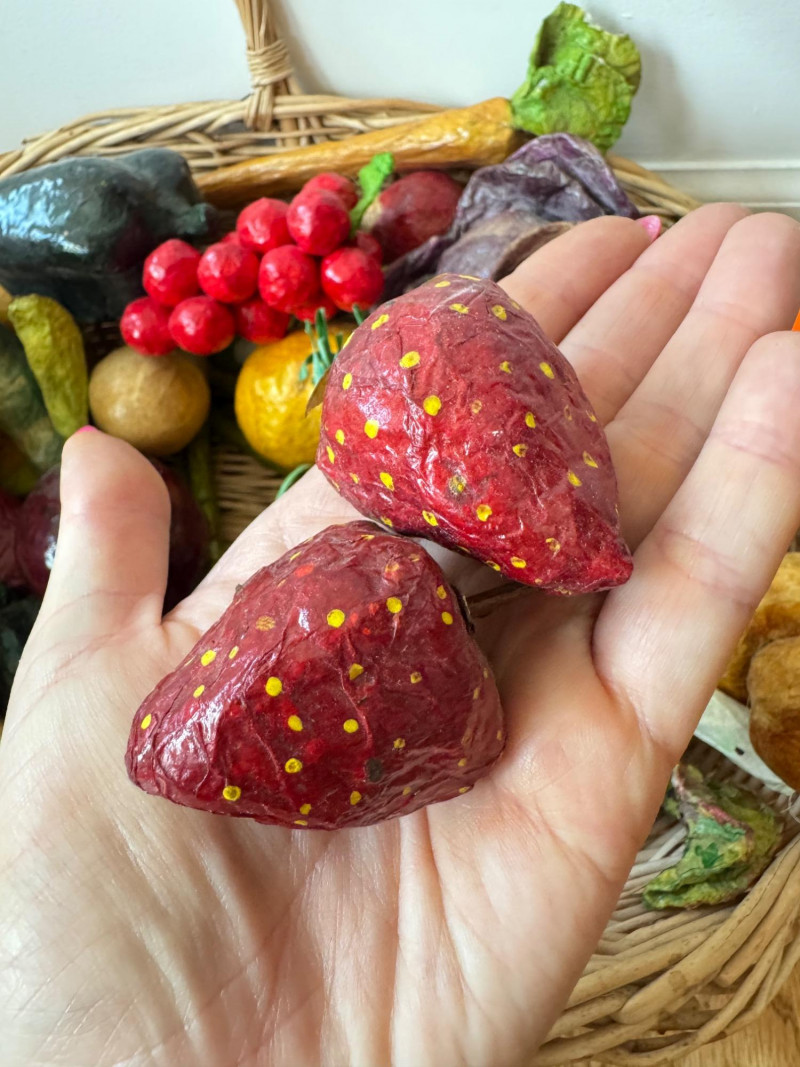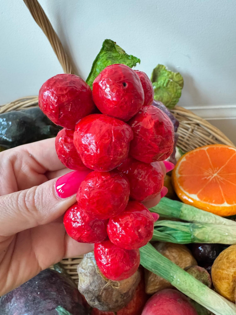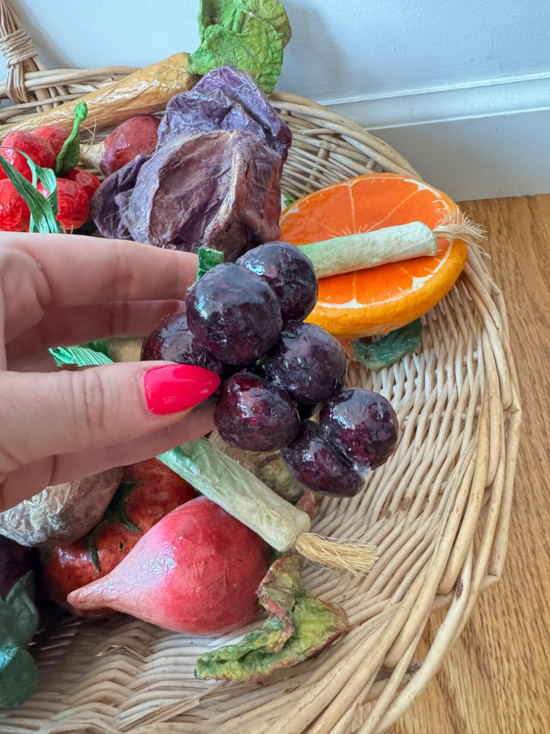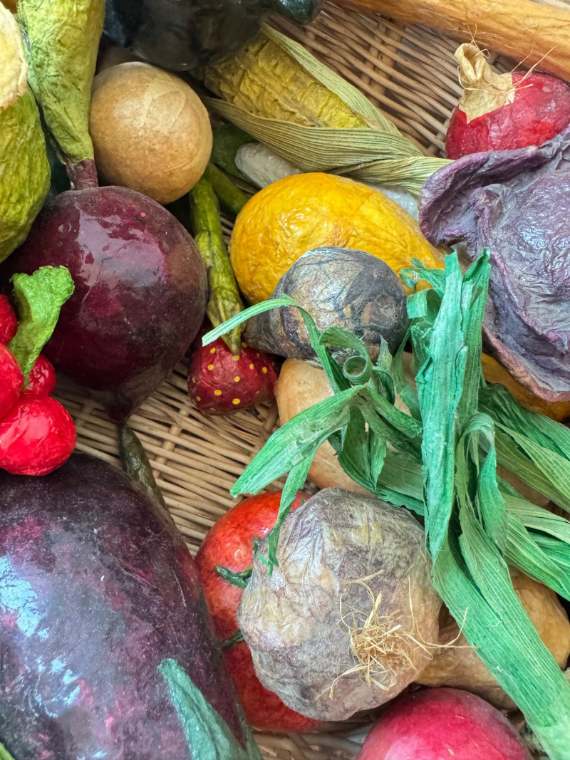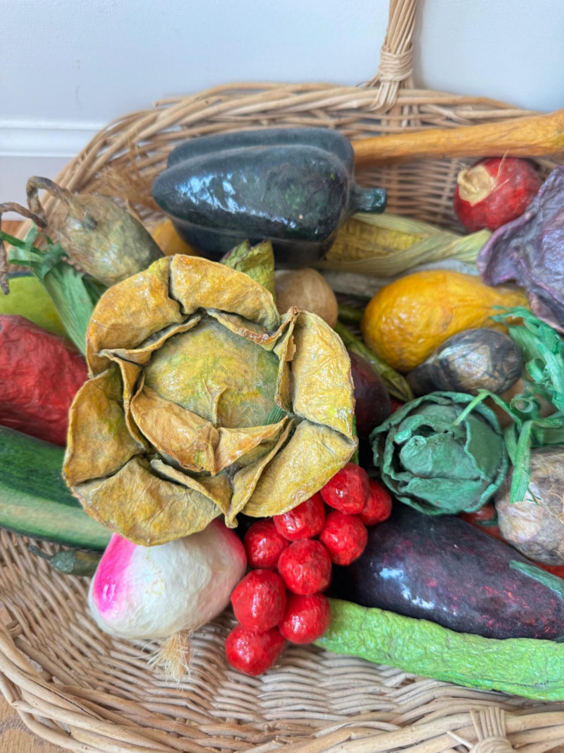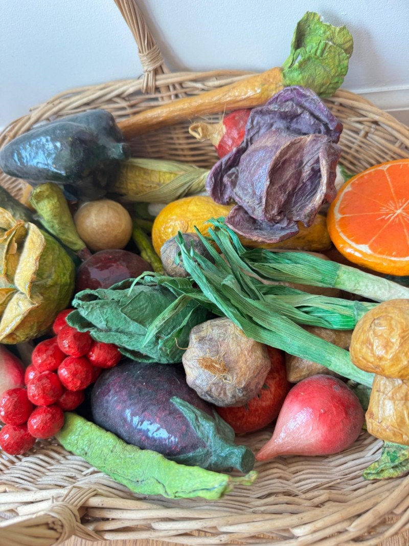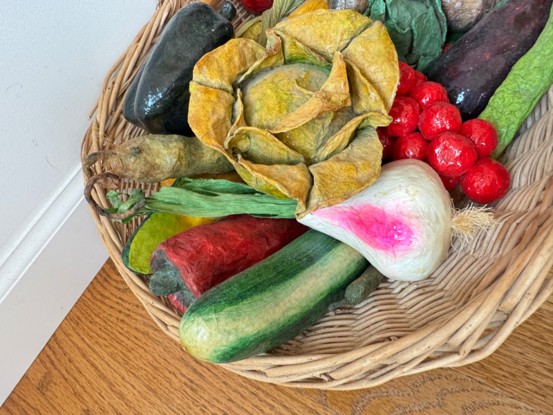 Lot # 99 - Paper Mâché Fruit & Vegetable Collection In Woven Basket