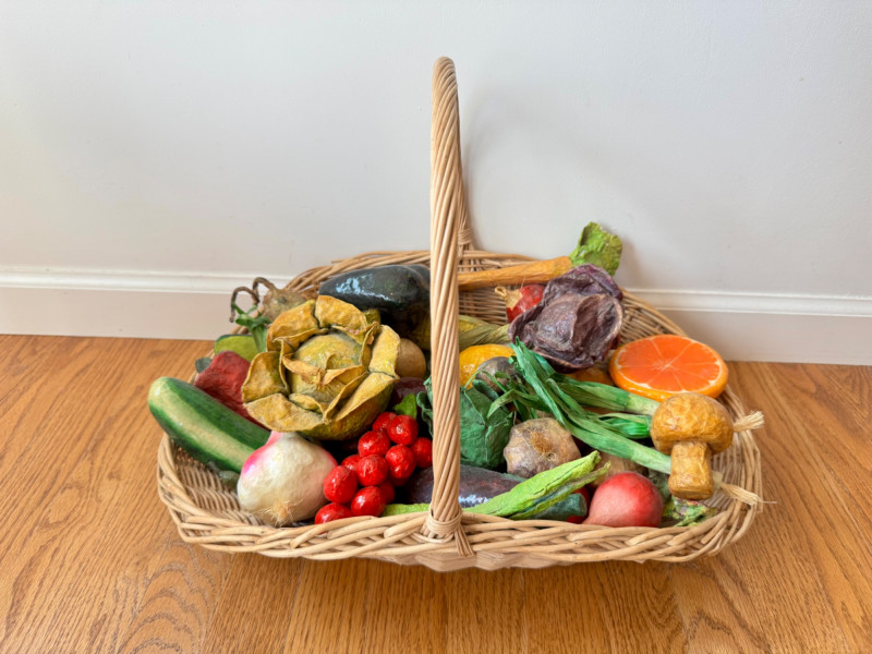 Paper Mâché Fruit & Vegetable Collection In Woven Basket. Basket measures approx. 19” long x 13” tall (with handle).