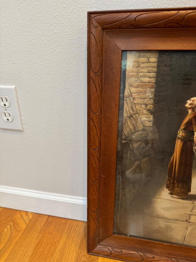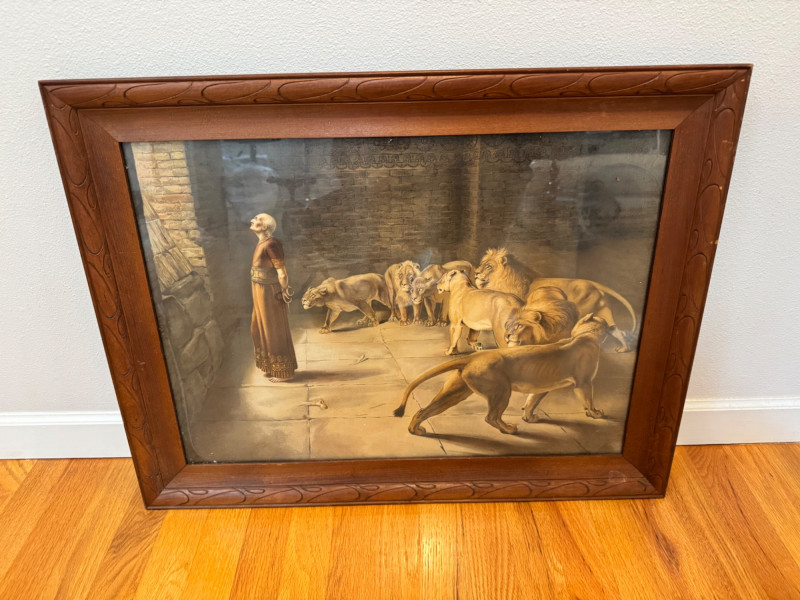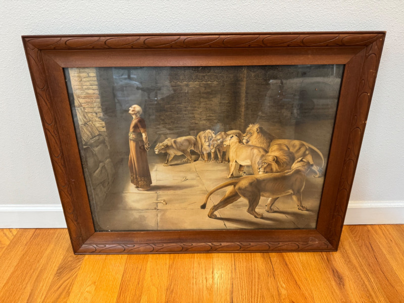 "Daniel in the Lion’s Den” Vintage Art Print – Wooden Carved Frame.