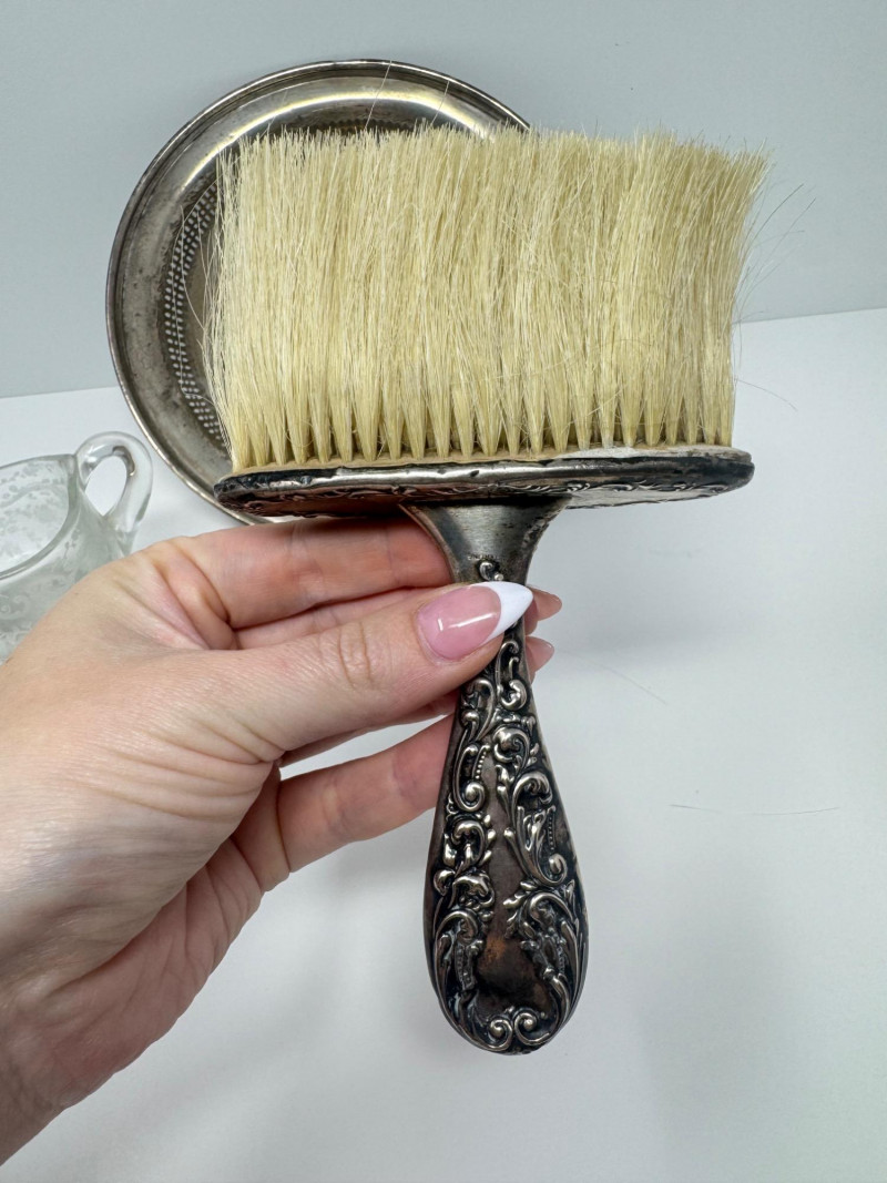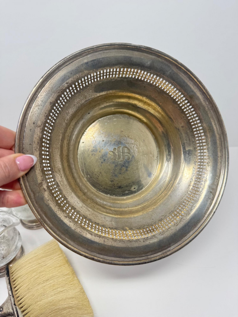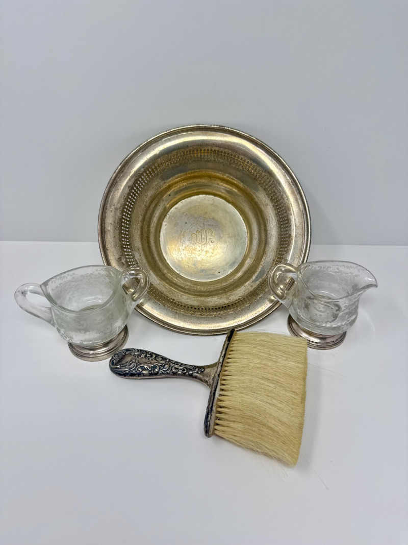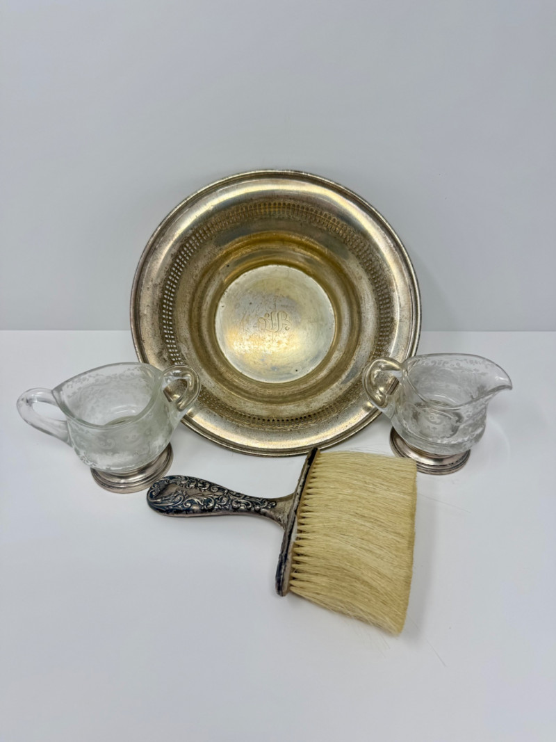 Sterling Silver Bowl, Brush & Glass Creamer/Sugar Set – 210.12g Bowl. Disclaimer: We do not test the metals of the items listed for auction. By placing a bid, you acknowledge and agree that you are purchasing the item "as is" and without any guarantee of metal quality. We do not offer refunds based on metal content or purity.