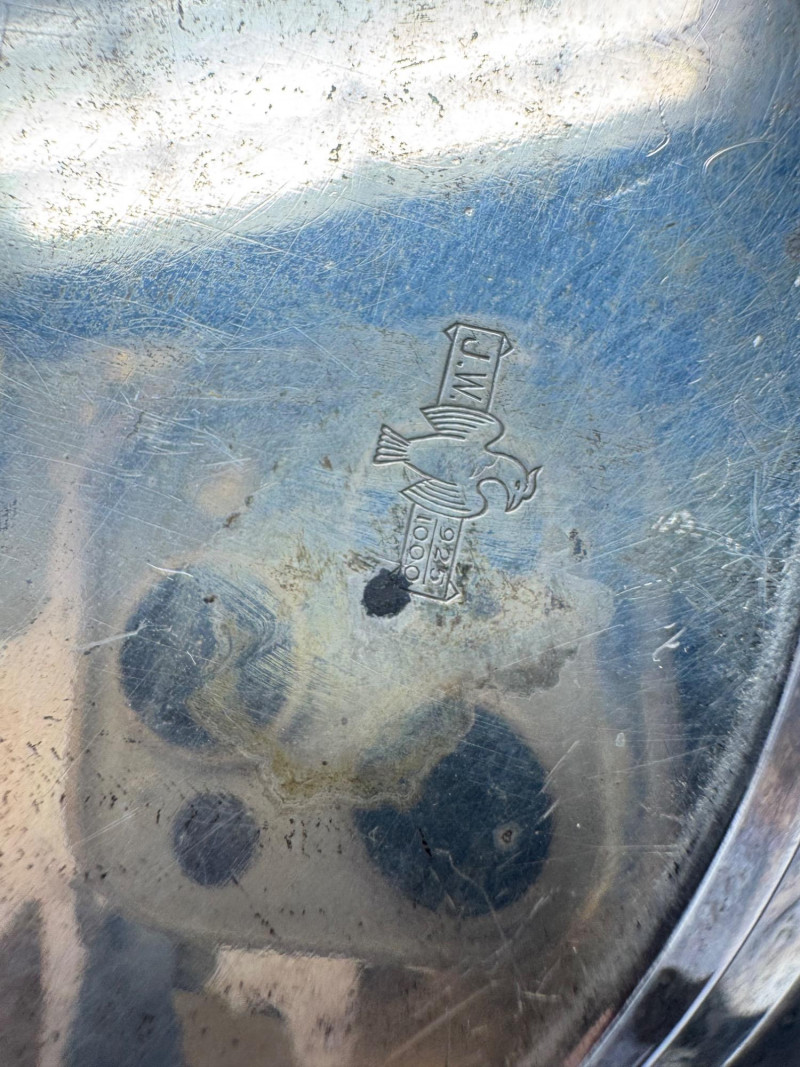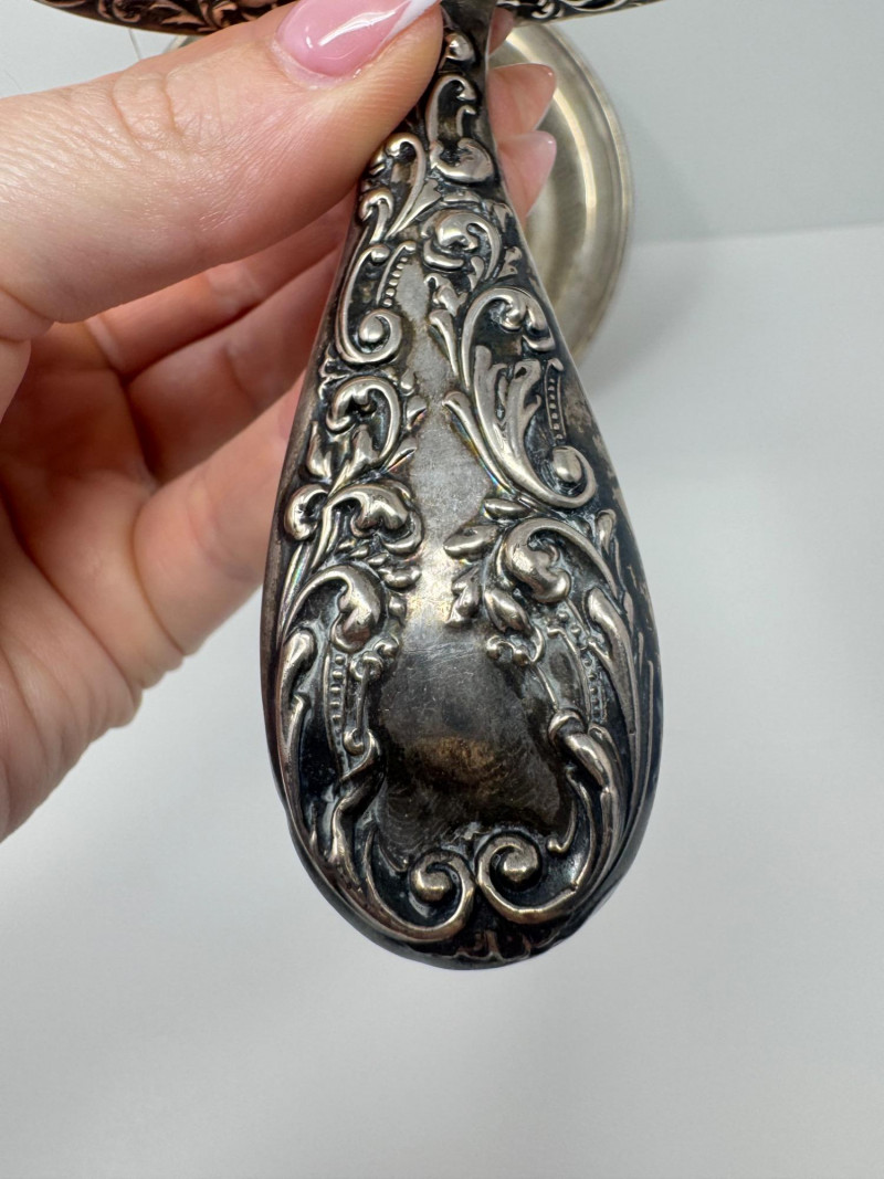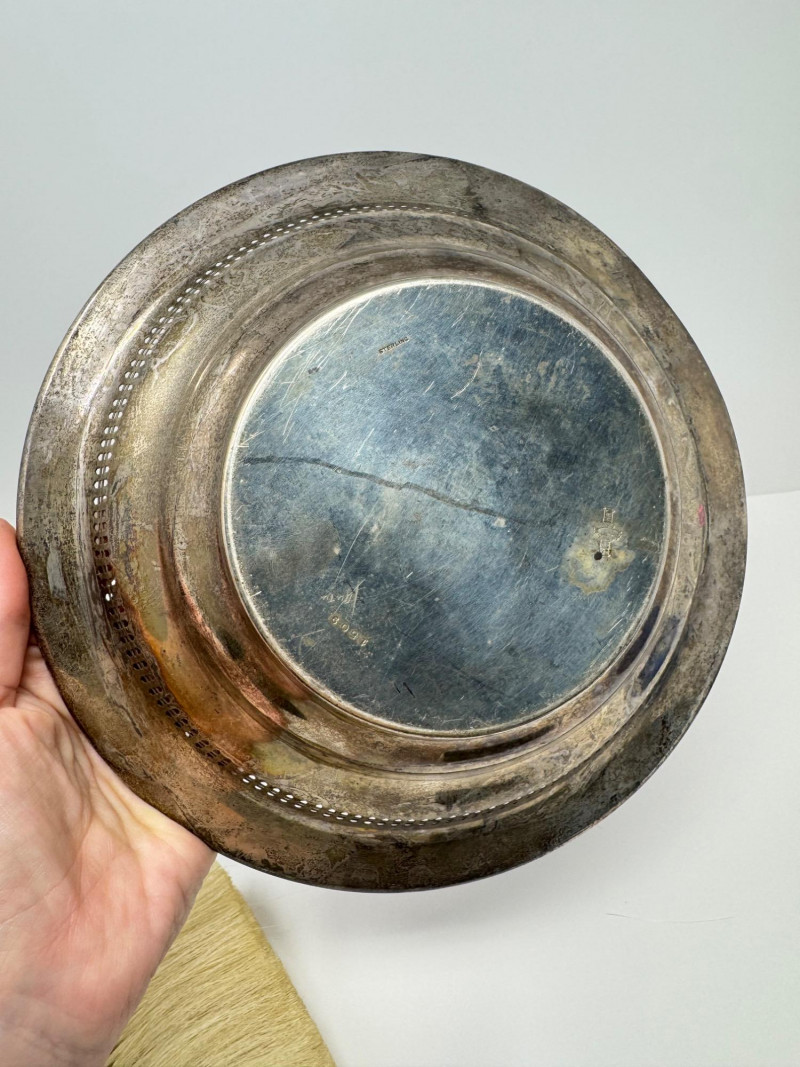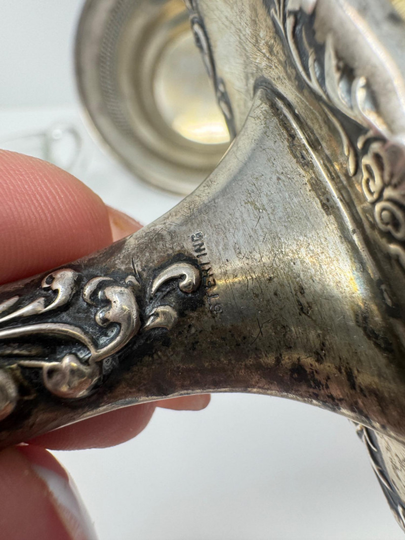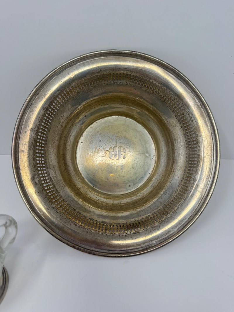 Sterling Silver Bowl, Brush & Glass Creamer/Sugar Set – 210.12g Bowl. Disclaimer: We do not test the metals of the items listed for auction. By placing a bid, you acknowledge and agree that you are purchasing the item "as is" and without any guarantee of metal quality. We do not offer refunds based on metal content or purity.