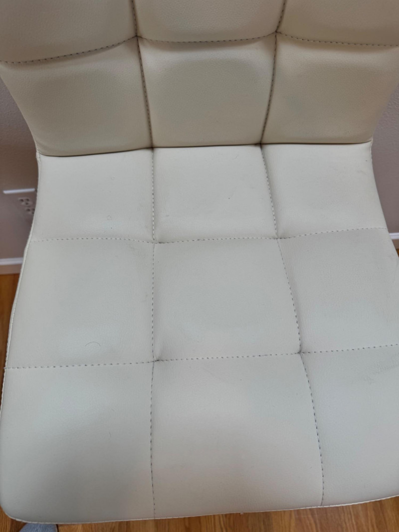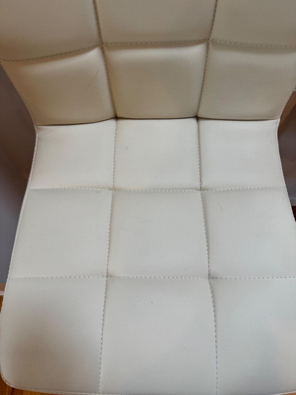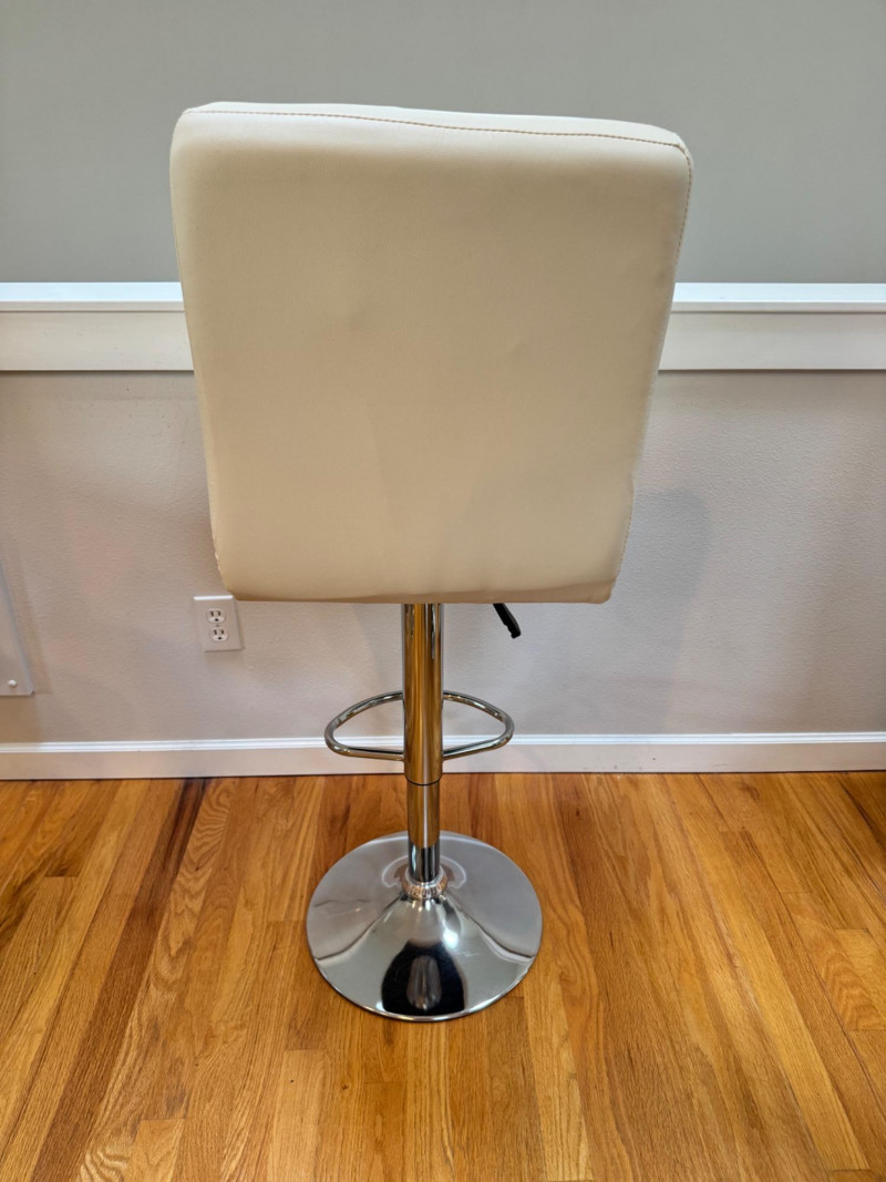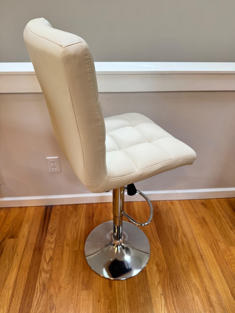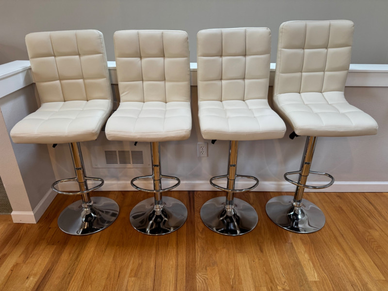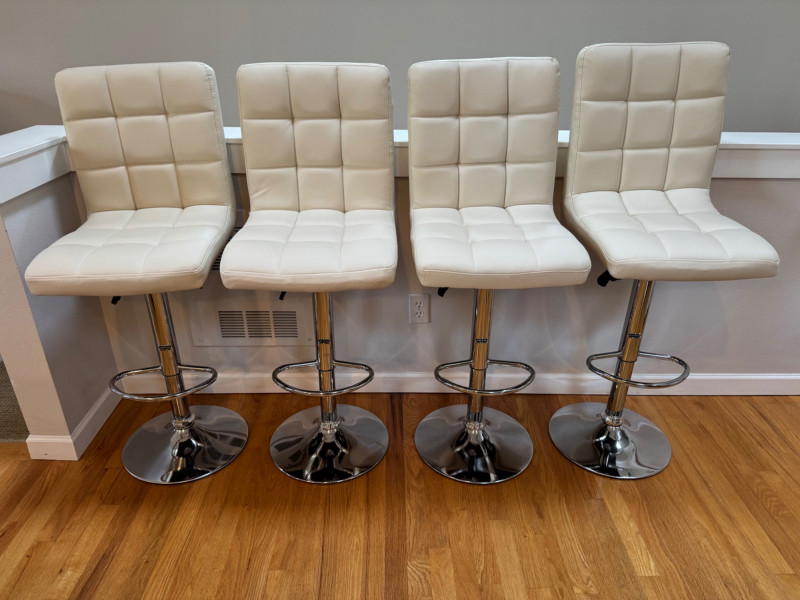 Set of 4 Adjustable White Leather-Look Bar Stools w/ Chrome Base.