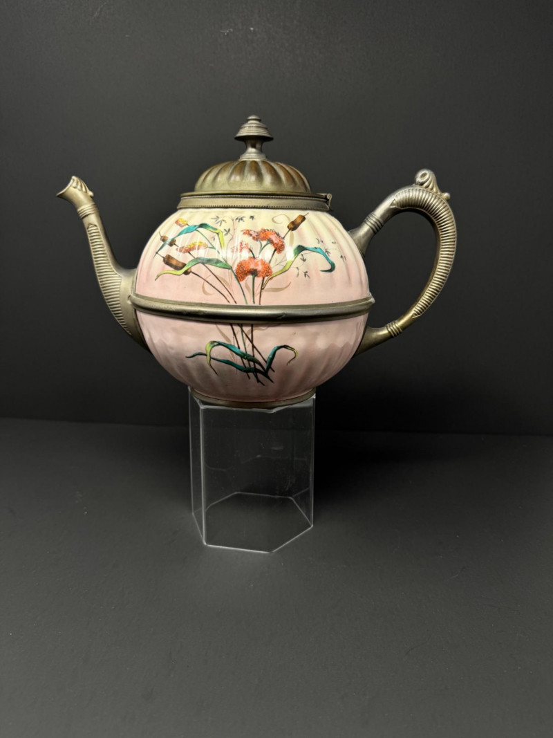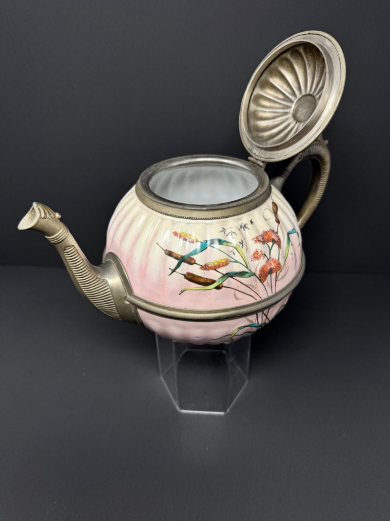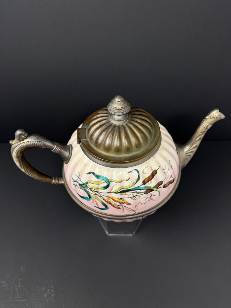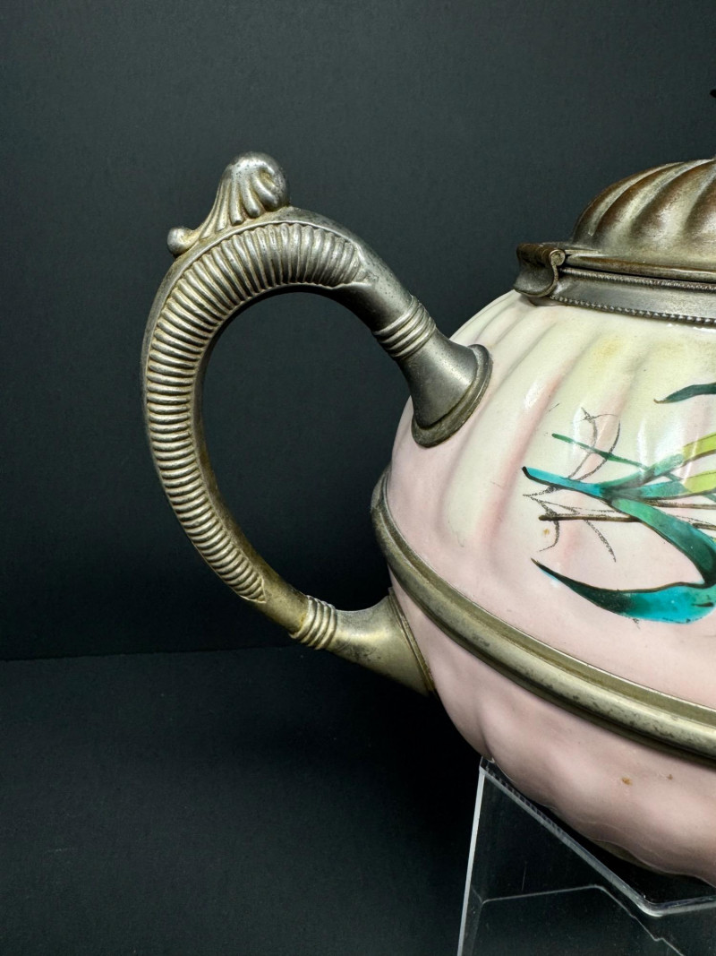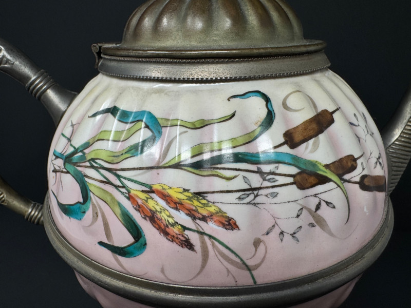 Lot # 29 - Vintage Enamelware Teapot w/ Pewter Trim – Hand-Painted Floral Design