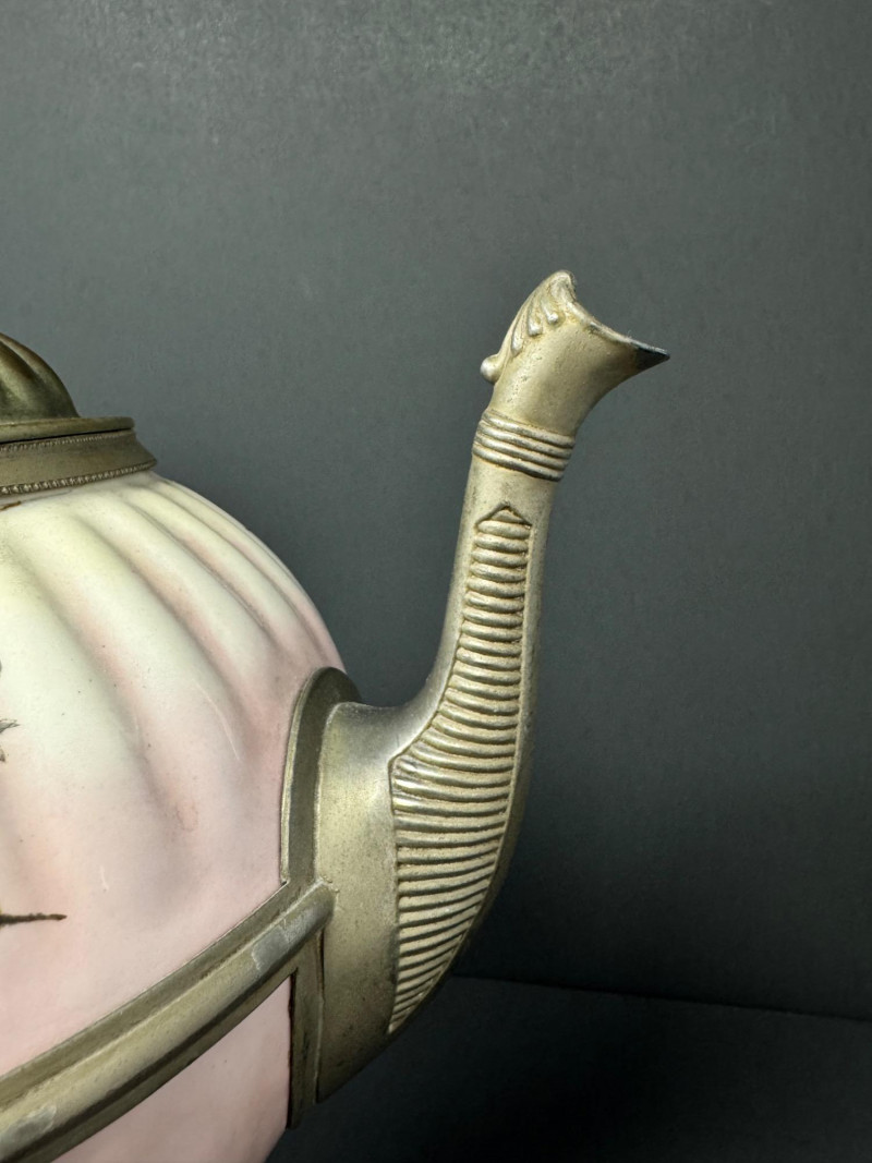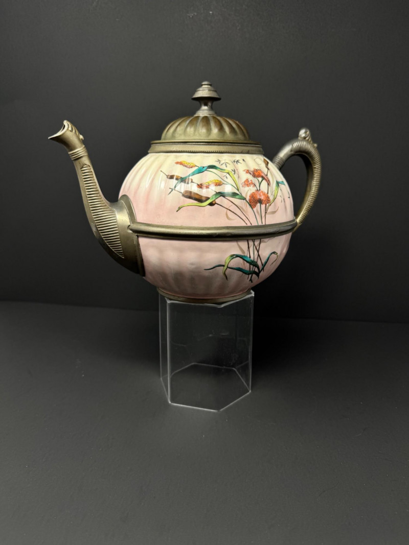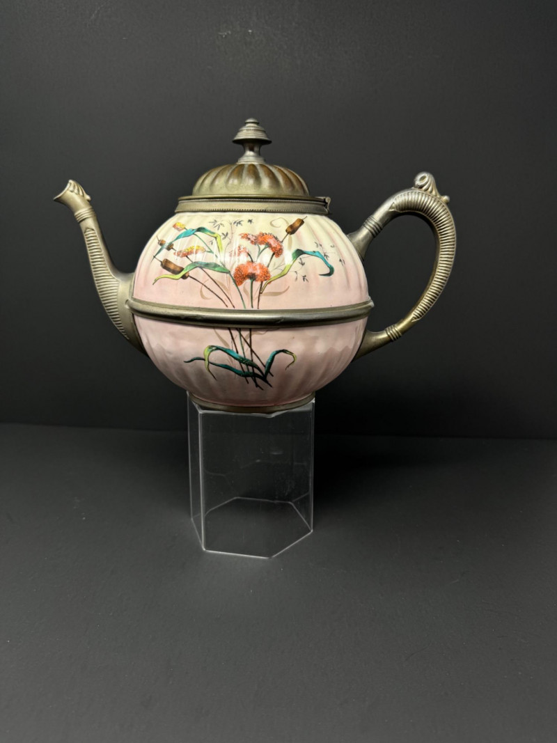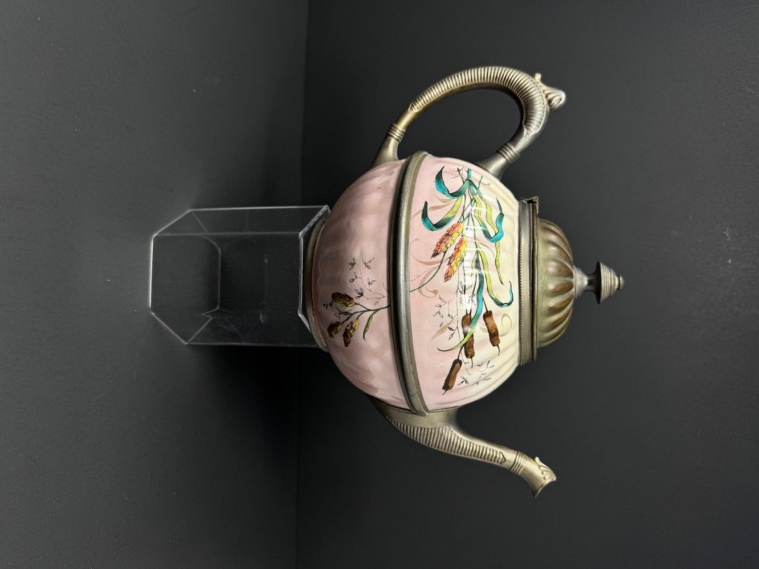 Lot # 29 - Vintage Enamelware Teapot w/ Pewter Trim – Hand-Painted Floral Design