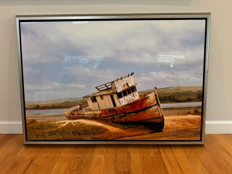 Large Framed Print Of The Iconic Point Reyes Abandoned Boat. Dimensions: 39 ½” W x 27 ½” H