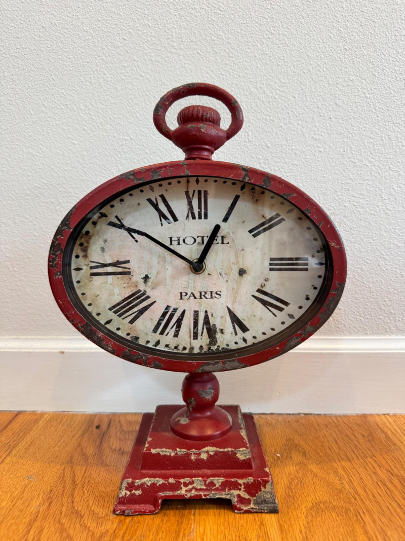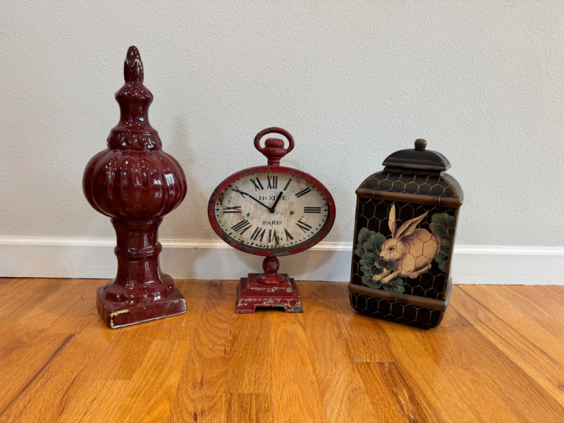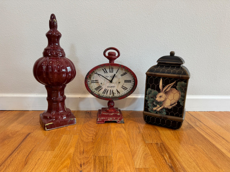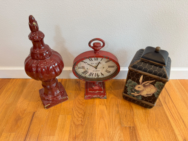 Vintage Decorative Trio – Paris Clock, Ceramic Finial, Bunny Canister.