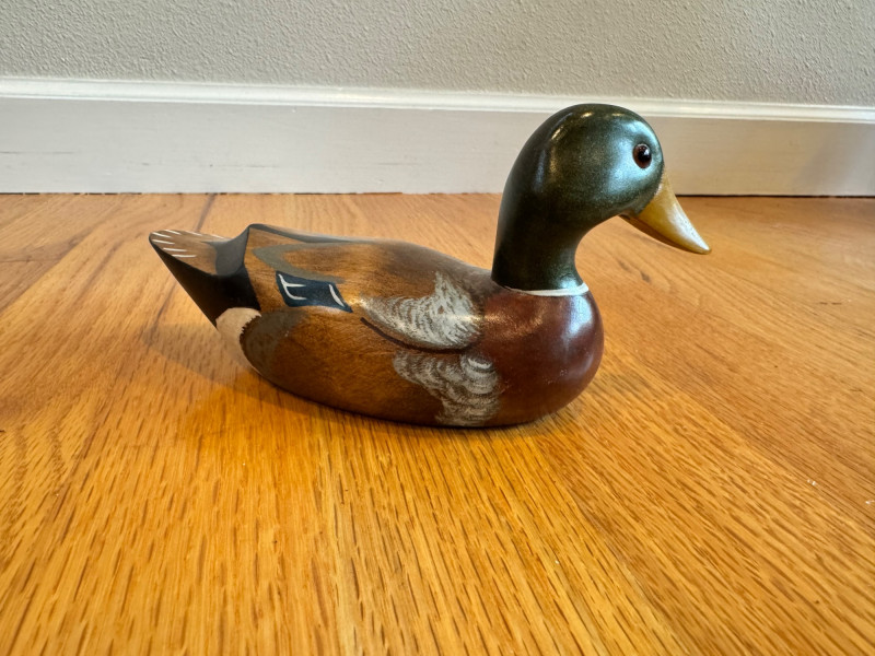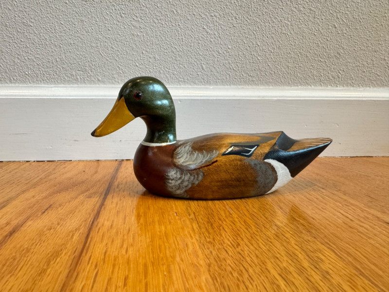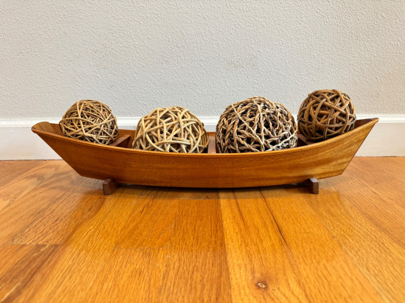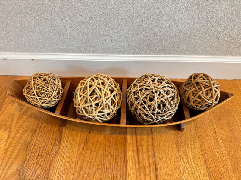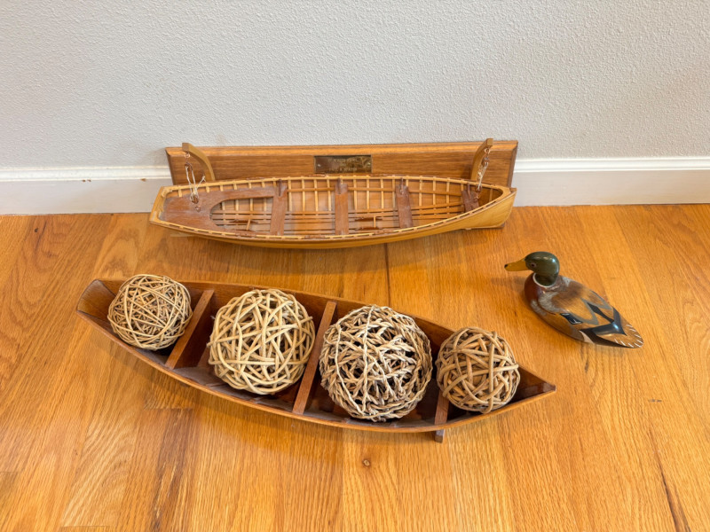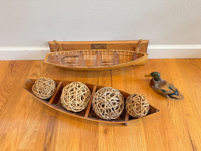 Wood Décor Lot – Paul S. Spates Canoe, Carved Duck, Boat & Rattan Orbs.