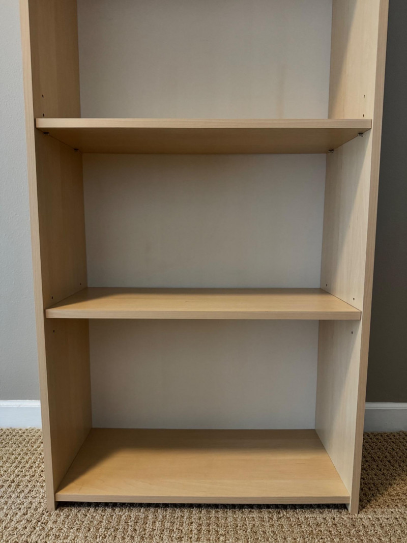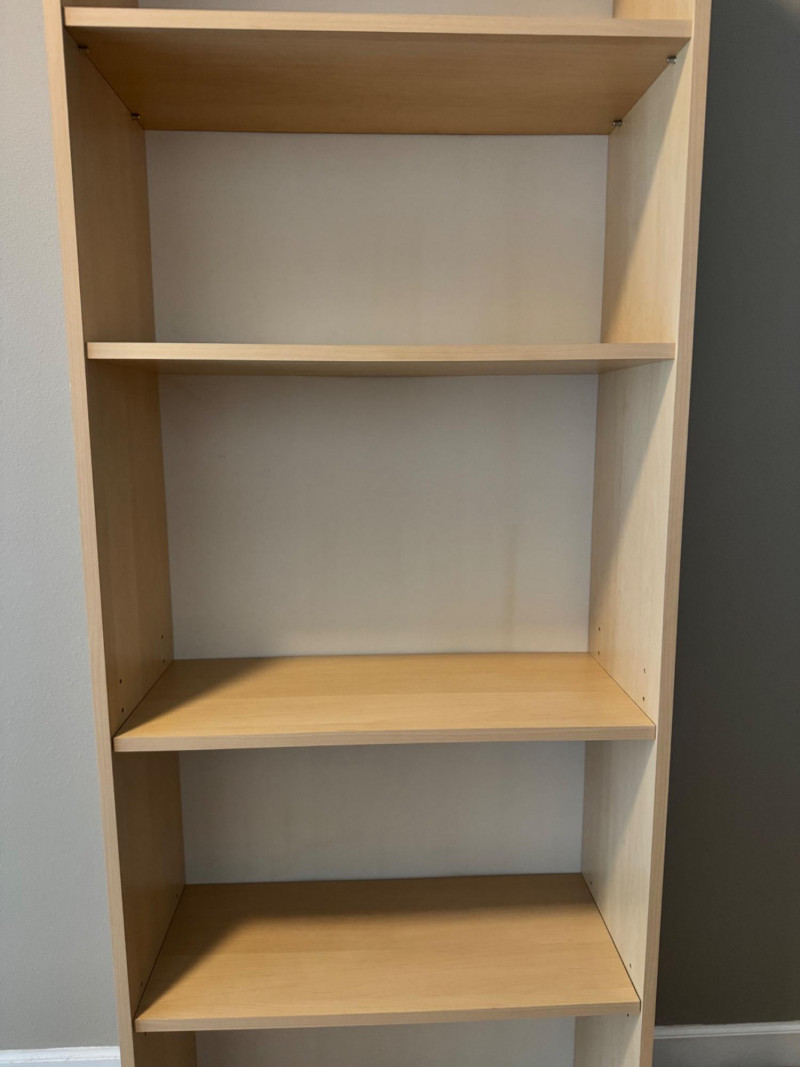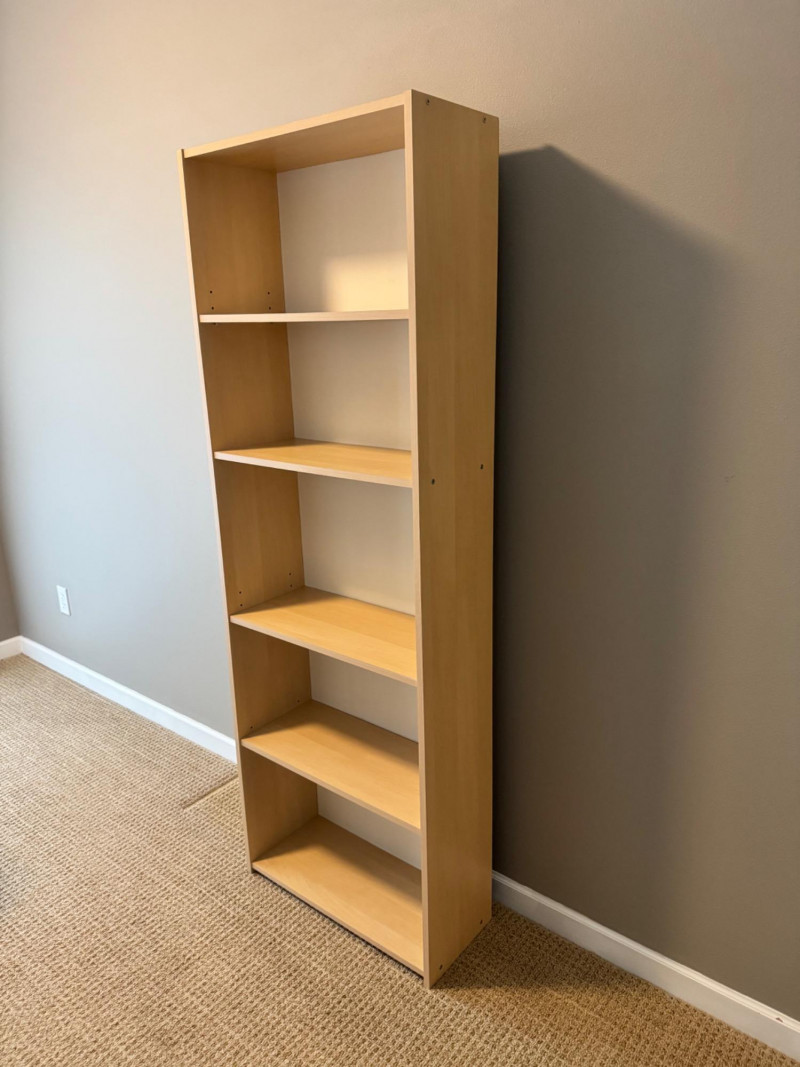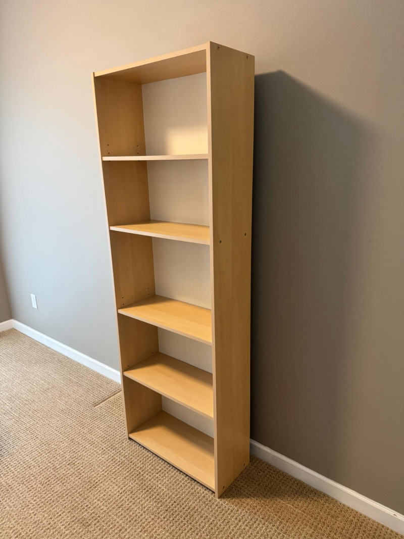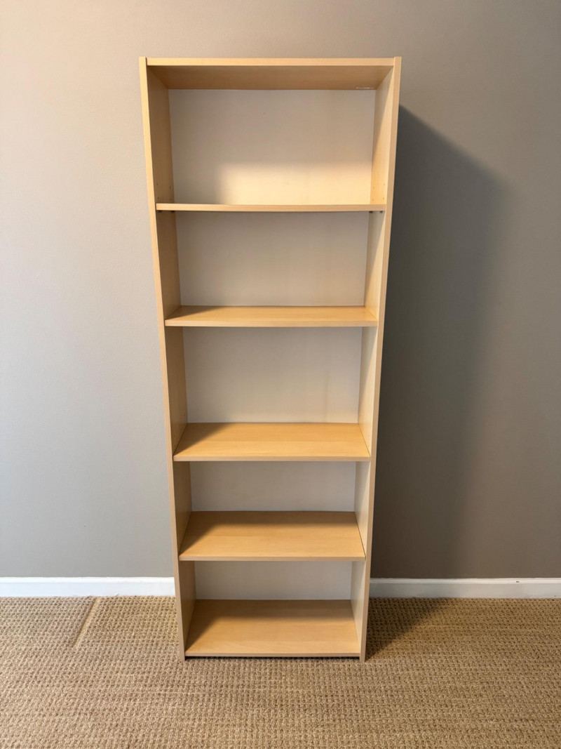 Tall Adjustable 5-Shelf Bookcase – Light Wood Finish. 67.5”H x 23.25”W x 10”D Bidding on this lot is an agreement that: (1.) You will have at least 2 capable, able bodied persons to lift and load at a minimum. (2.) You will bring a hand truck and/or any other tools needed to remove this item. If these steps are not followed your item will be forfeit and no refund given.