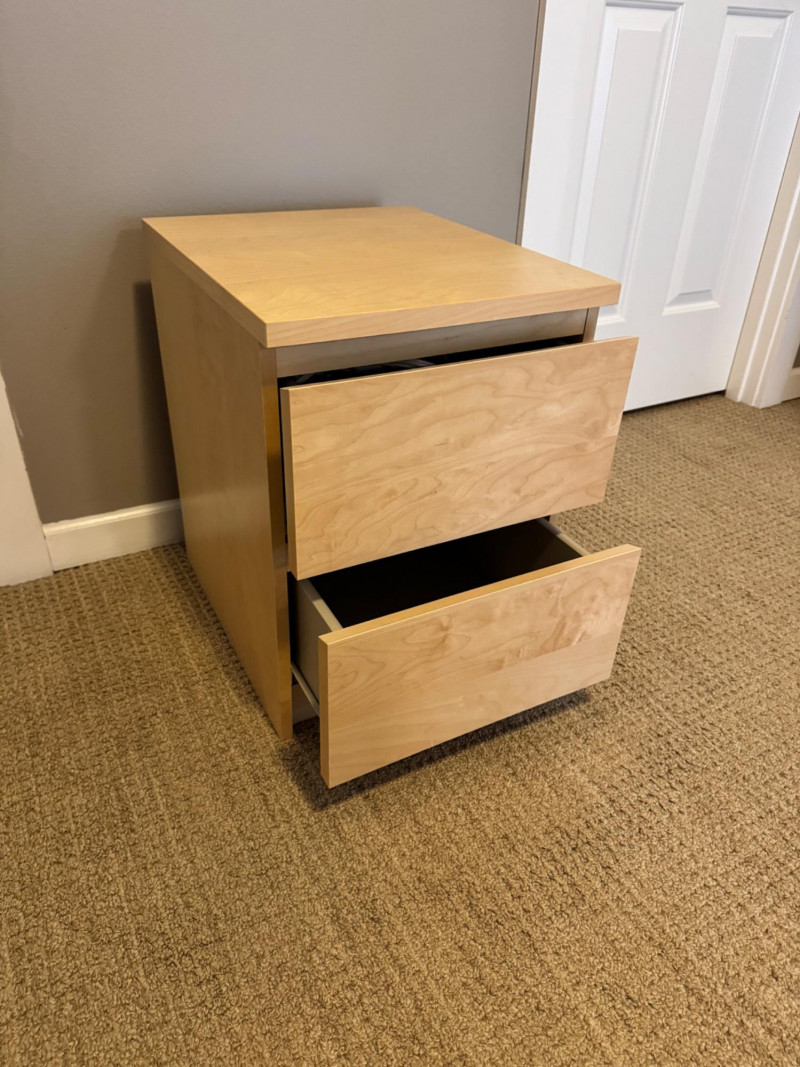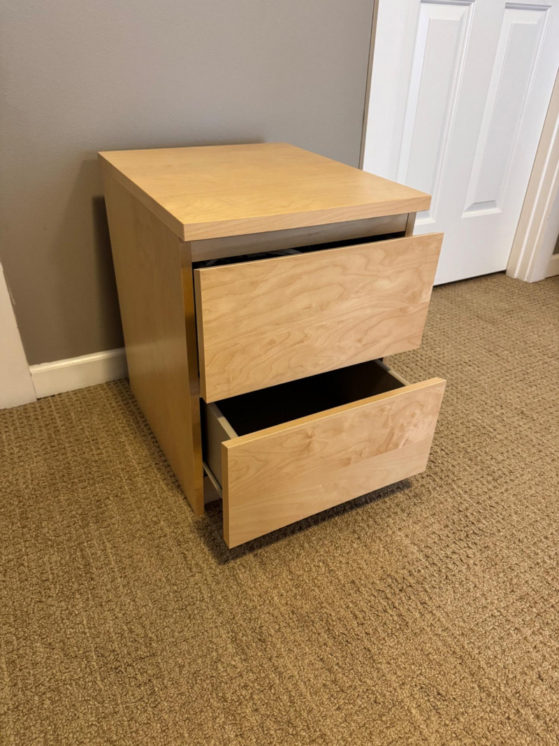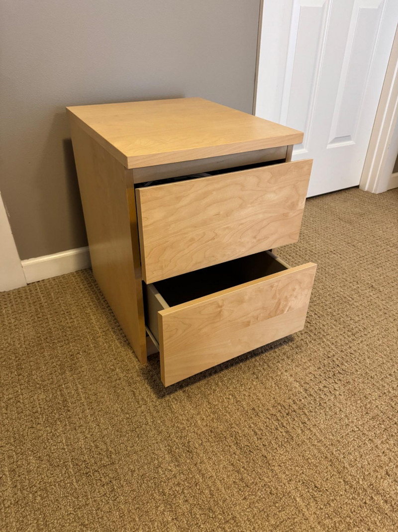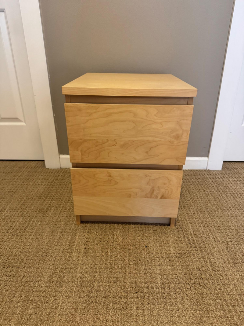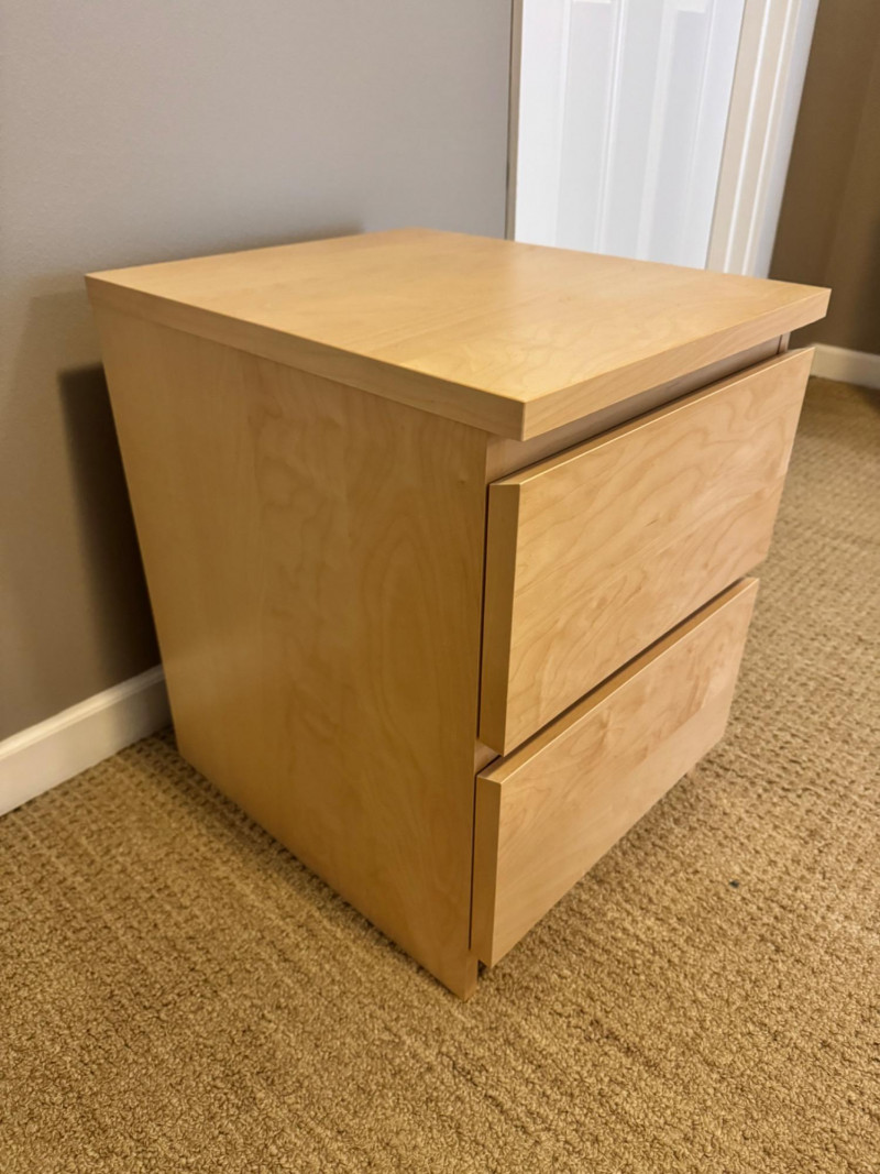 2-Drawer Nightstand – Light Wood, MALM Style. Dimensions: 21.5”H x 16”W x 19”D