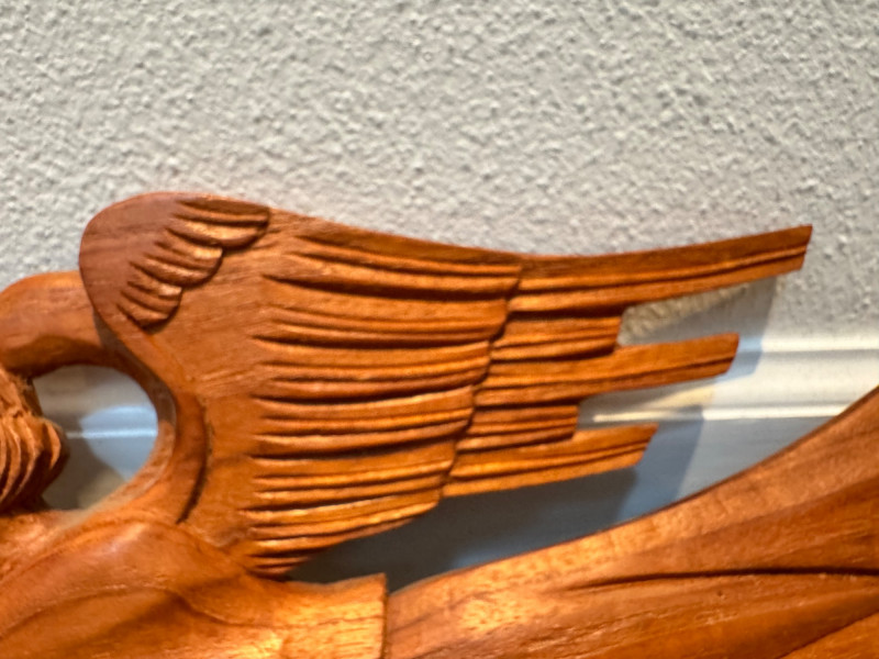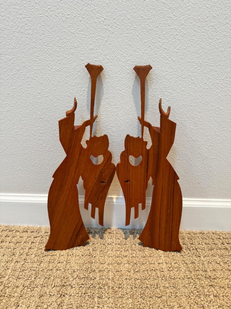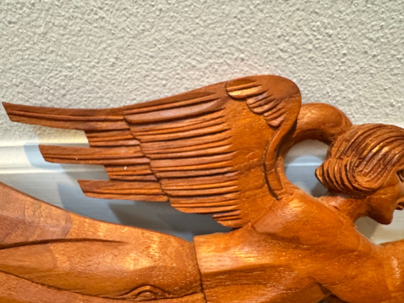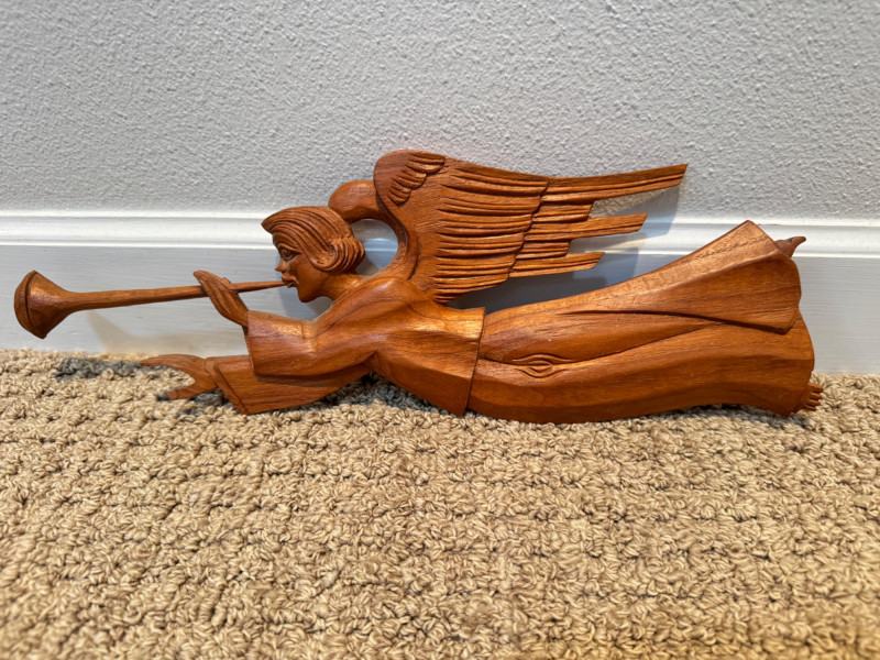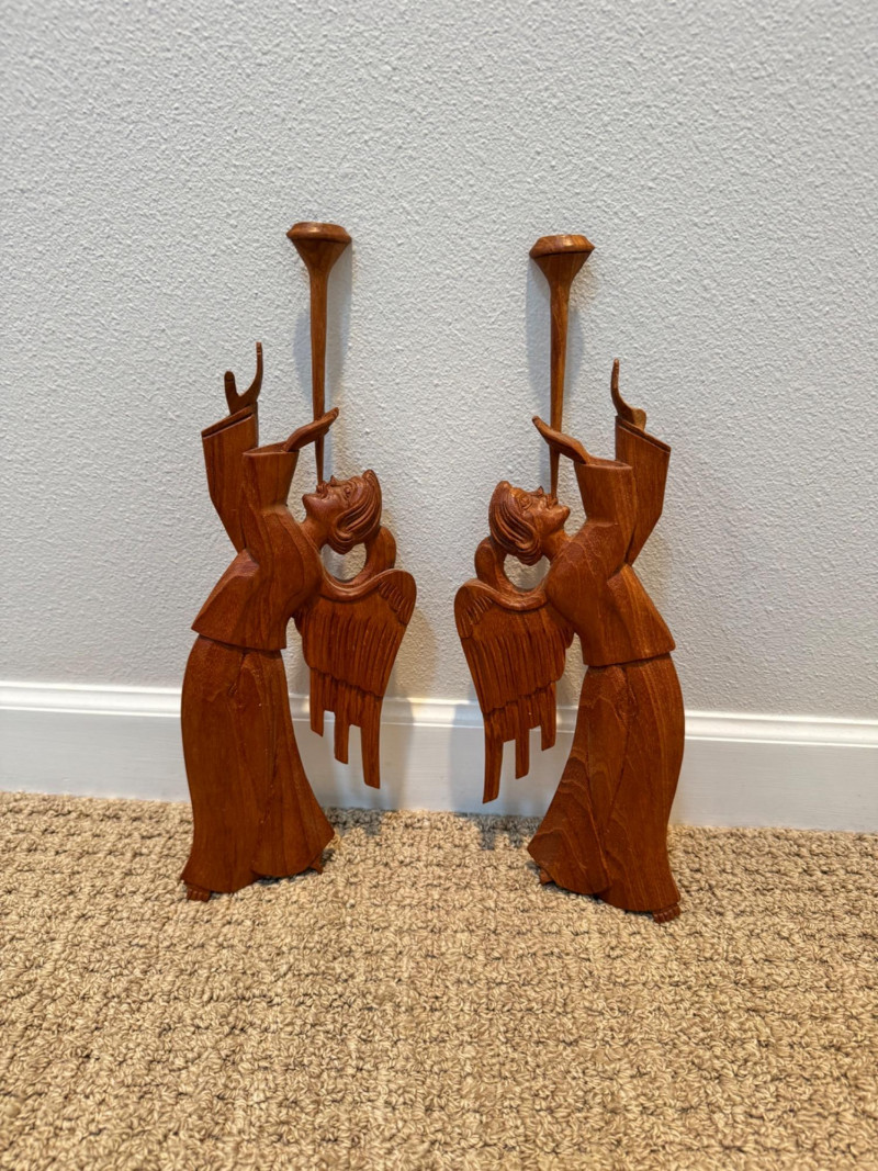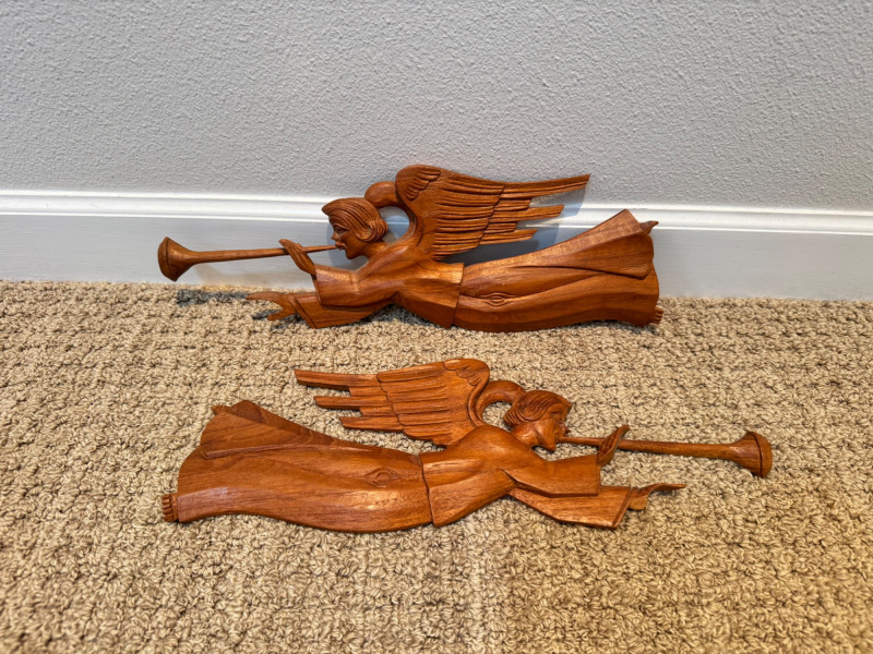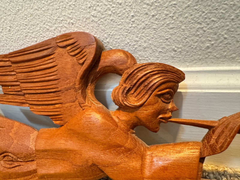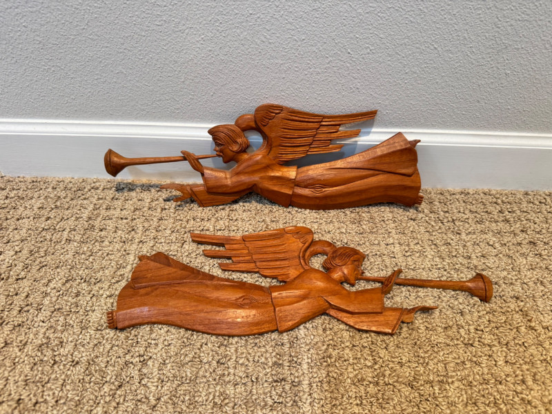 Vintage Pair of Hand-Carved Folk Art Flying Angels w/ Trumpets.