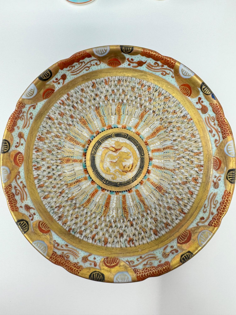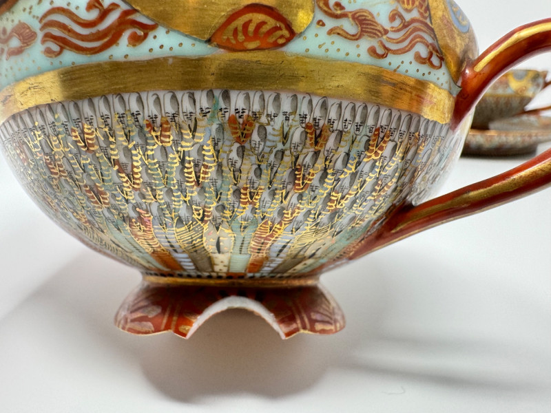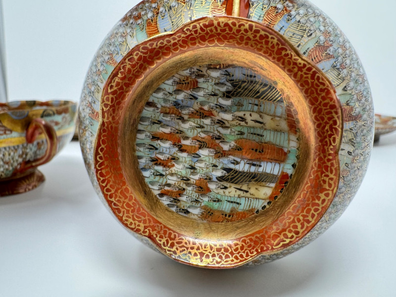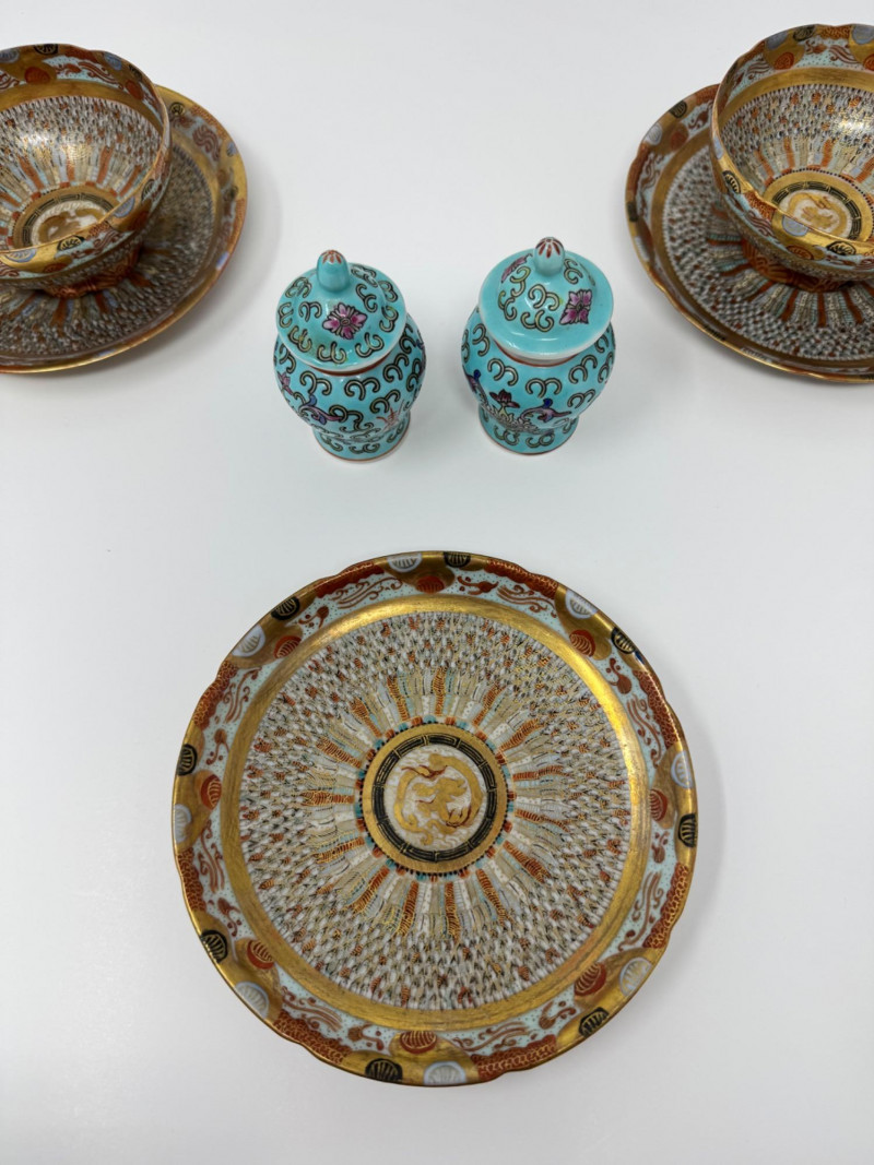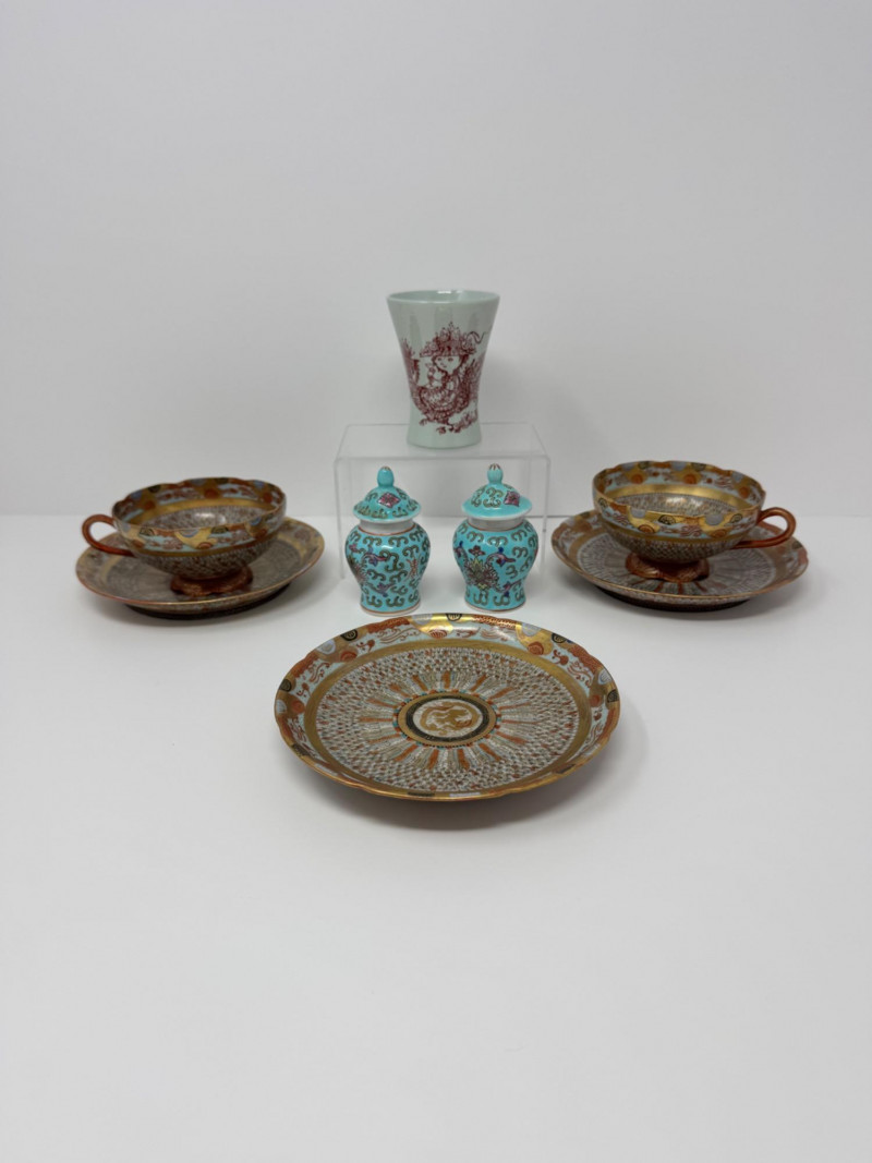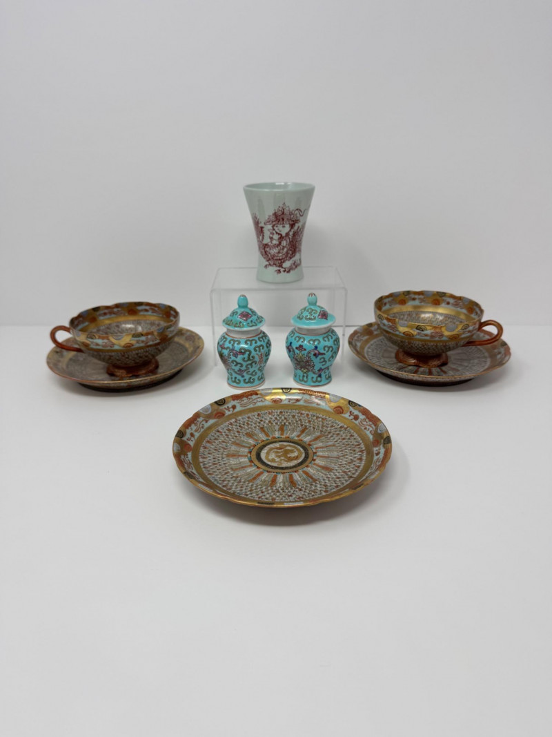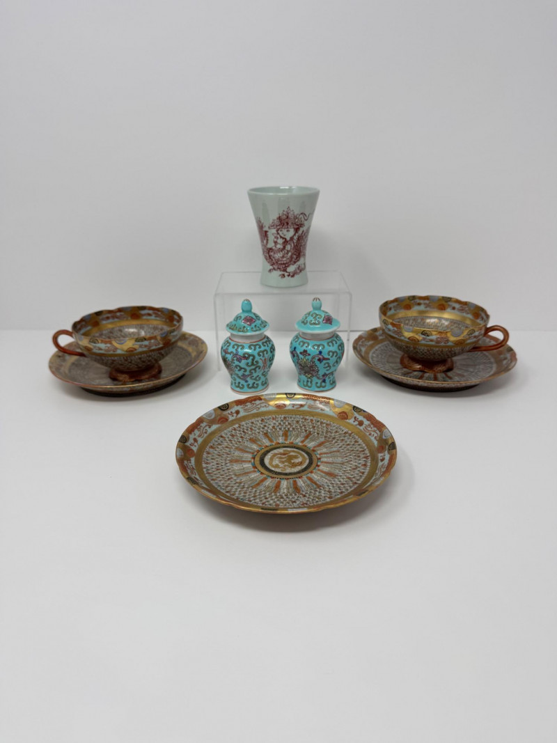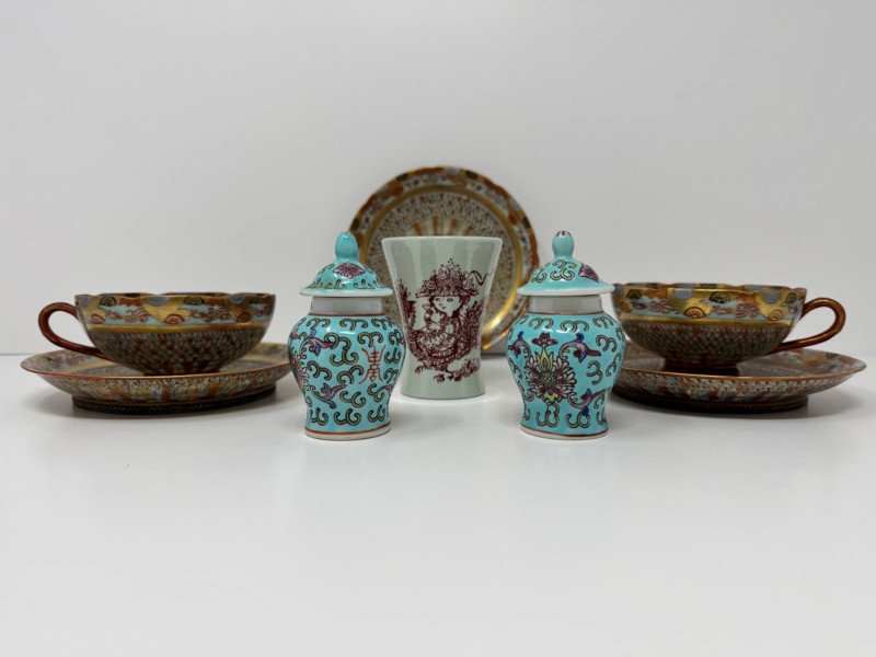 Kutani ‘Thousand Faces’ Cups/Saucers, Famille Rose Ginger Jar & Vase.
