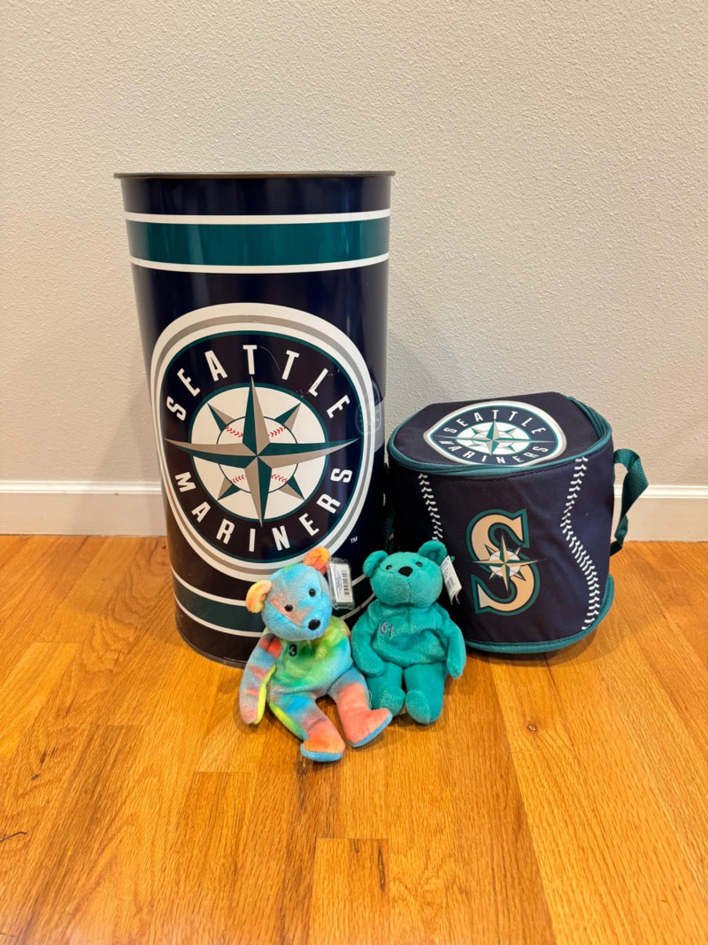 Lot # 108 - Seattle Mariners Collectibles – Bammers Bears, Cooler Bag & Metal Bin