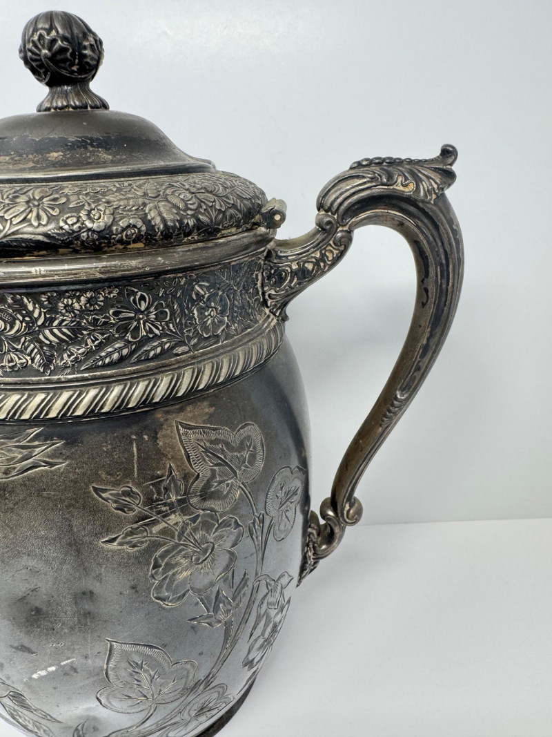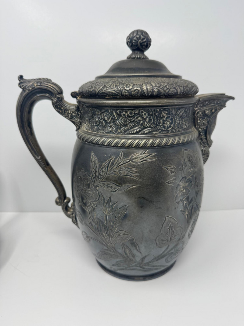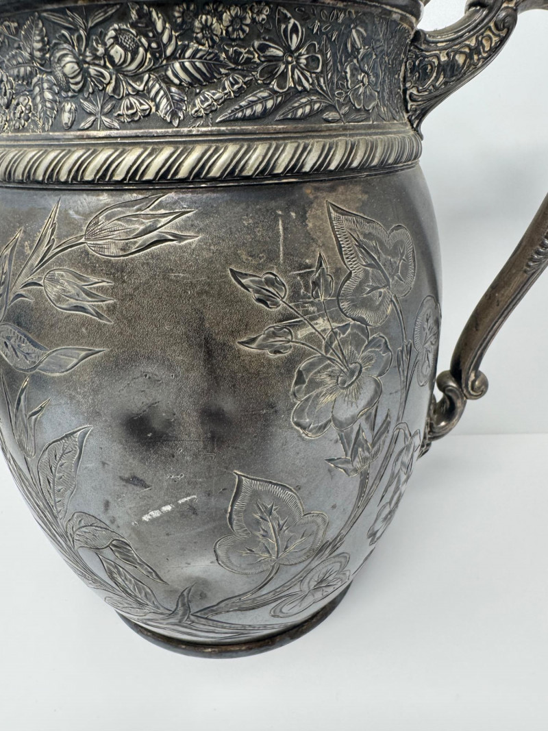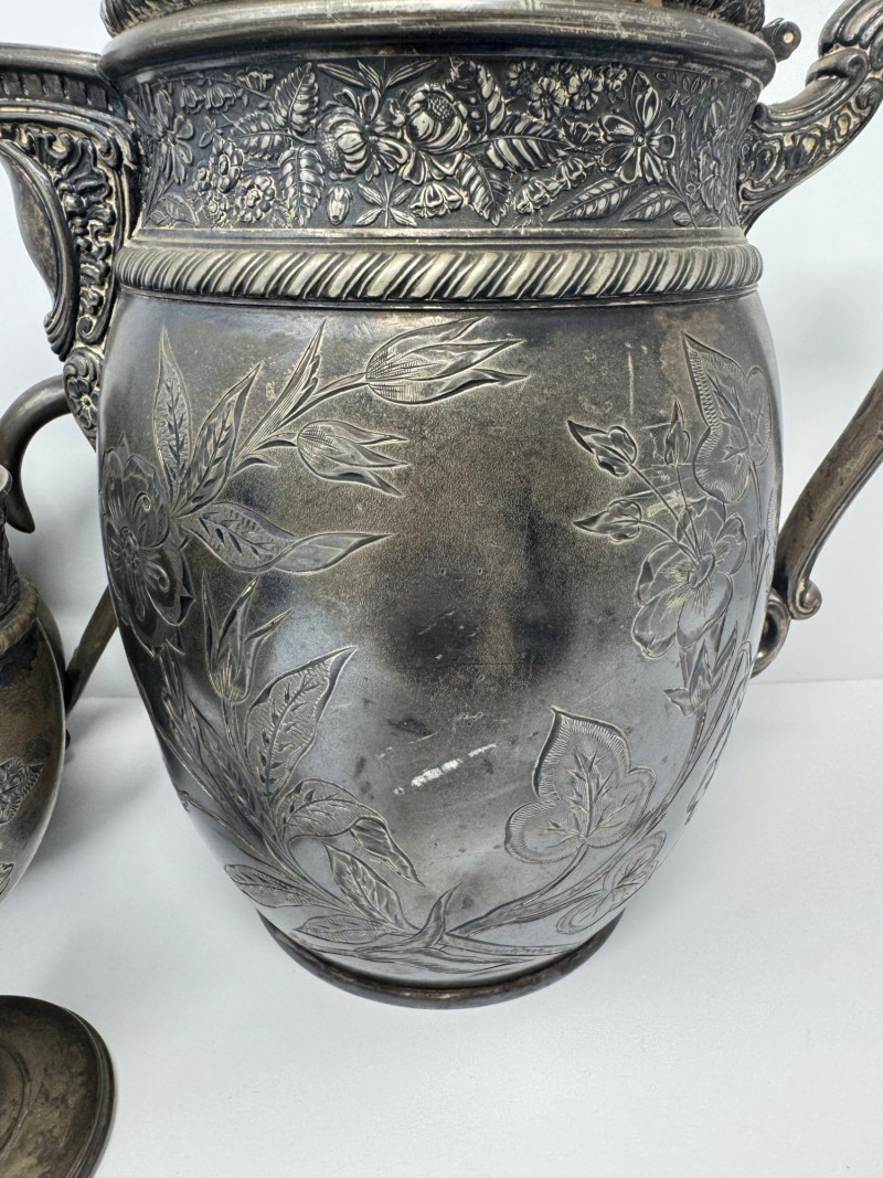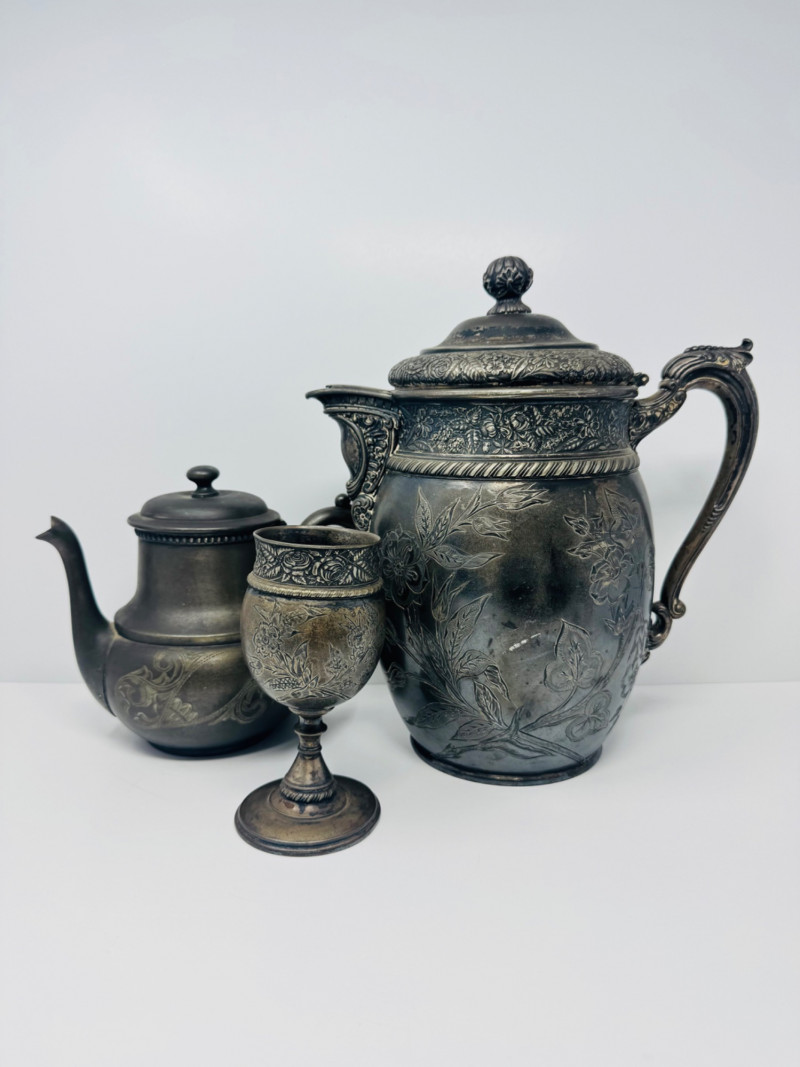 Antique Rogers & Bro Triple Plate Pitcher, Teapot & Goblet Lot. Large water pitcher with floral engraving, 12” tall, shows heavy denting.