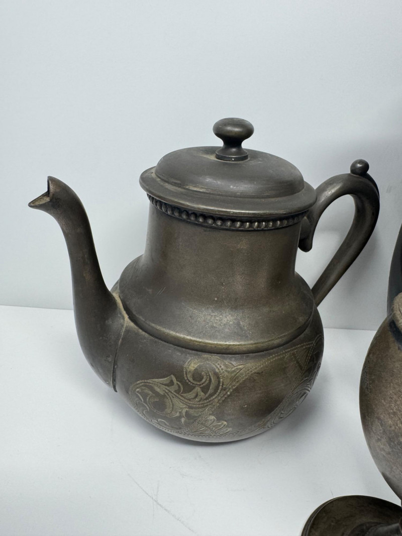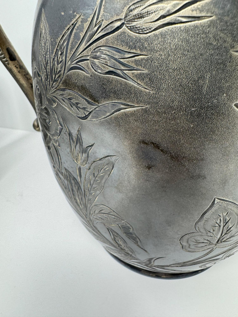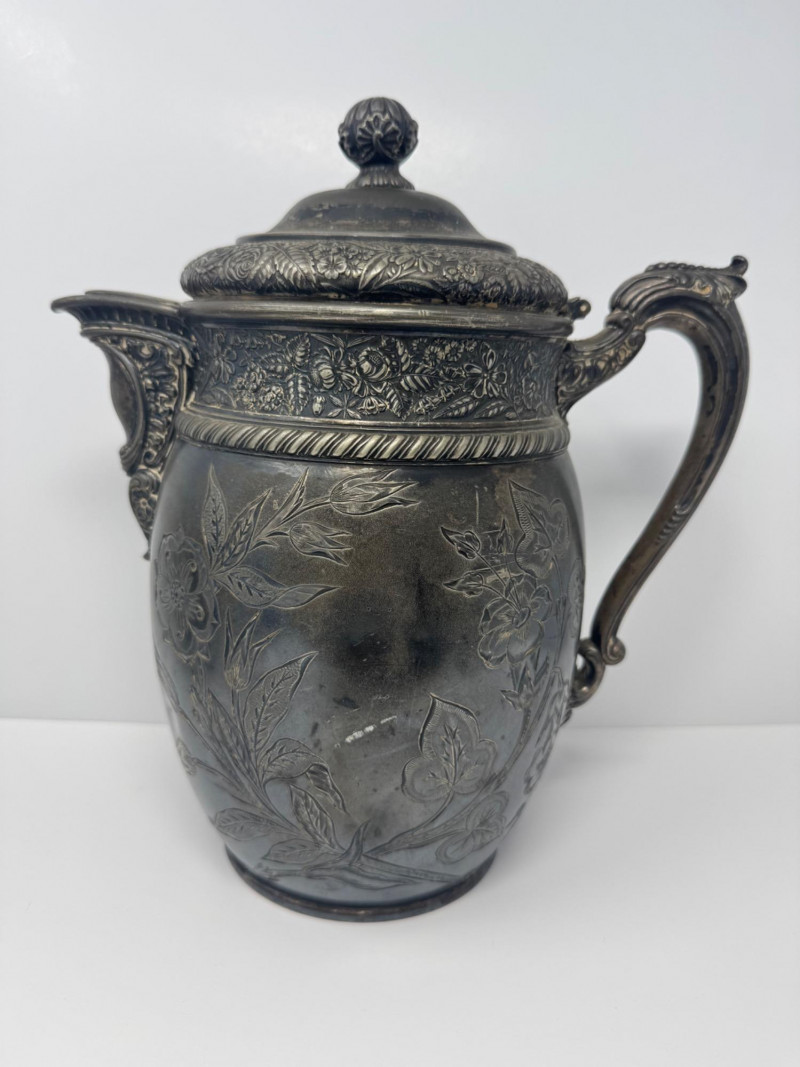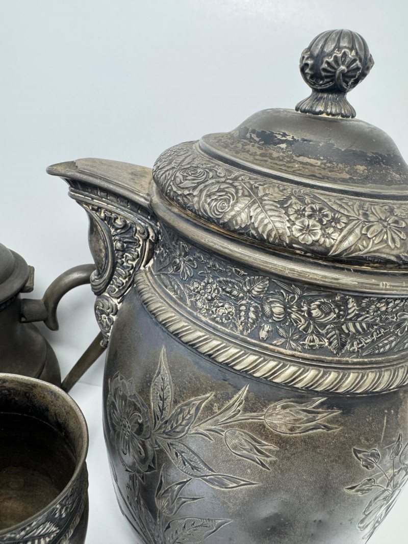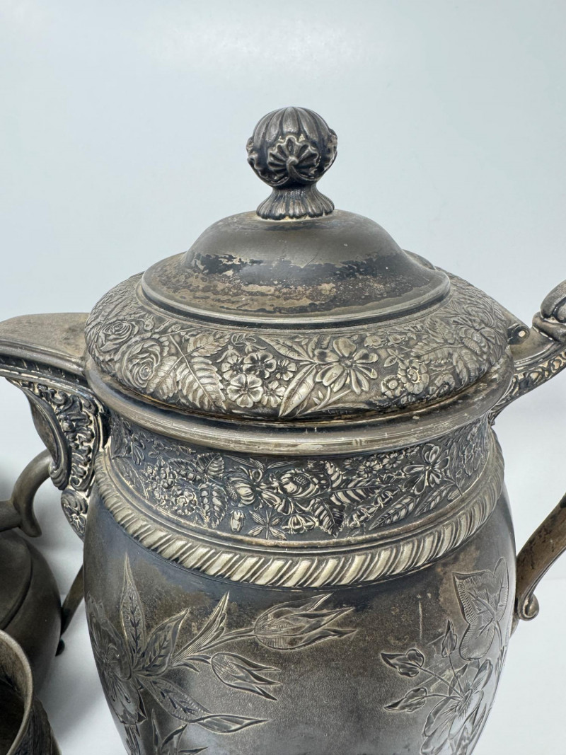 Antique Rogers & Bro Triple Plate Pitcher, Teapot & Goblet Lot. Large water pitcher with floral engraving, 12” tall, shows heavy denting.