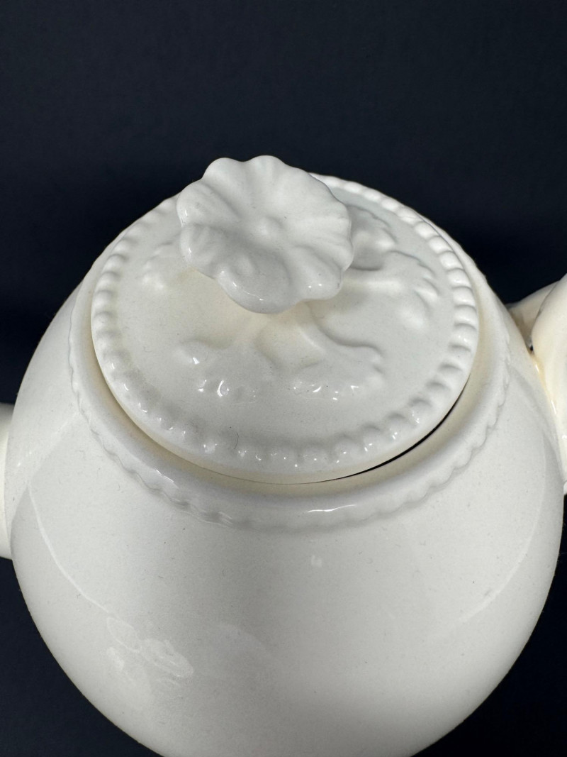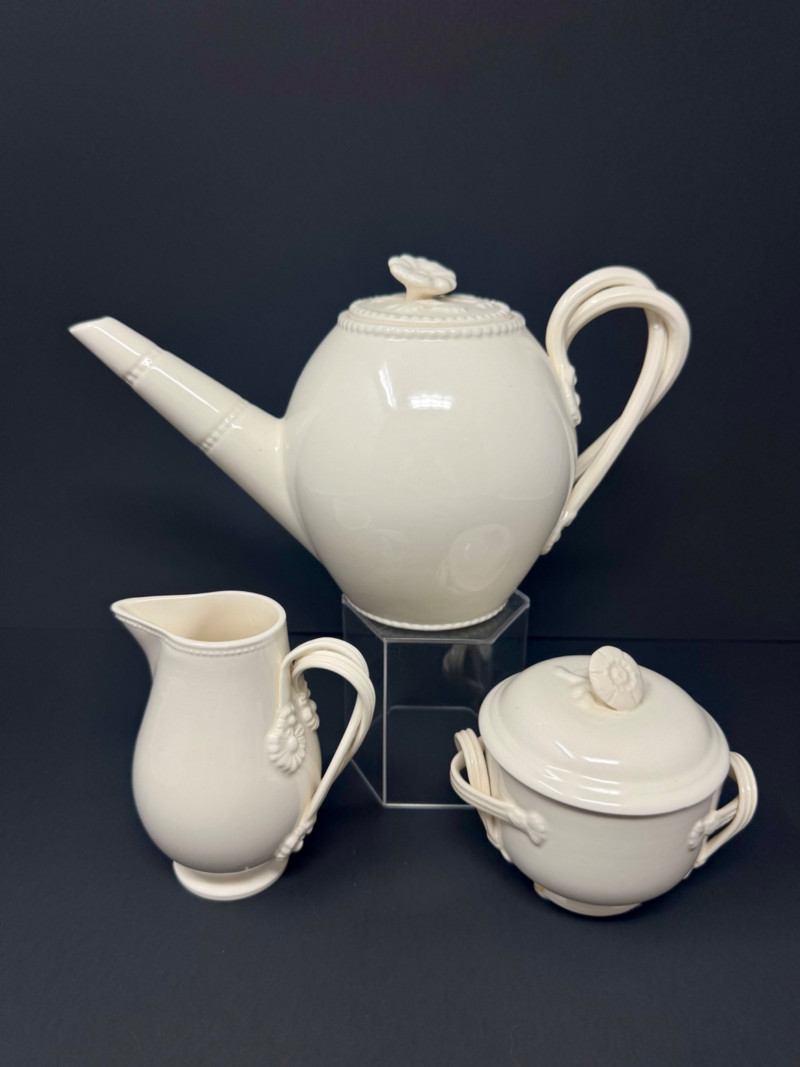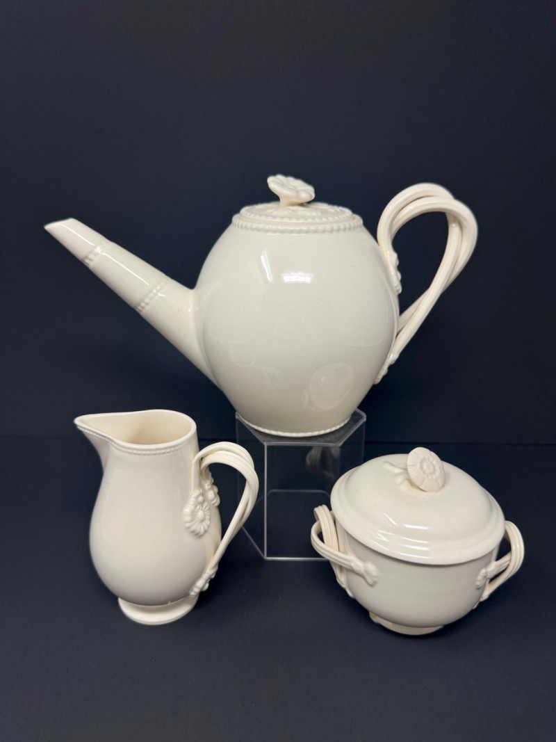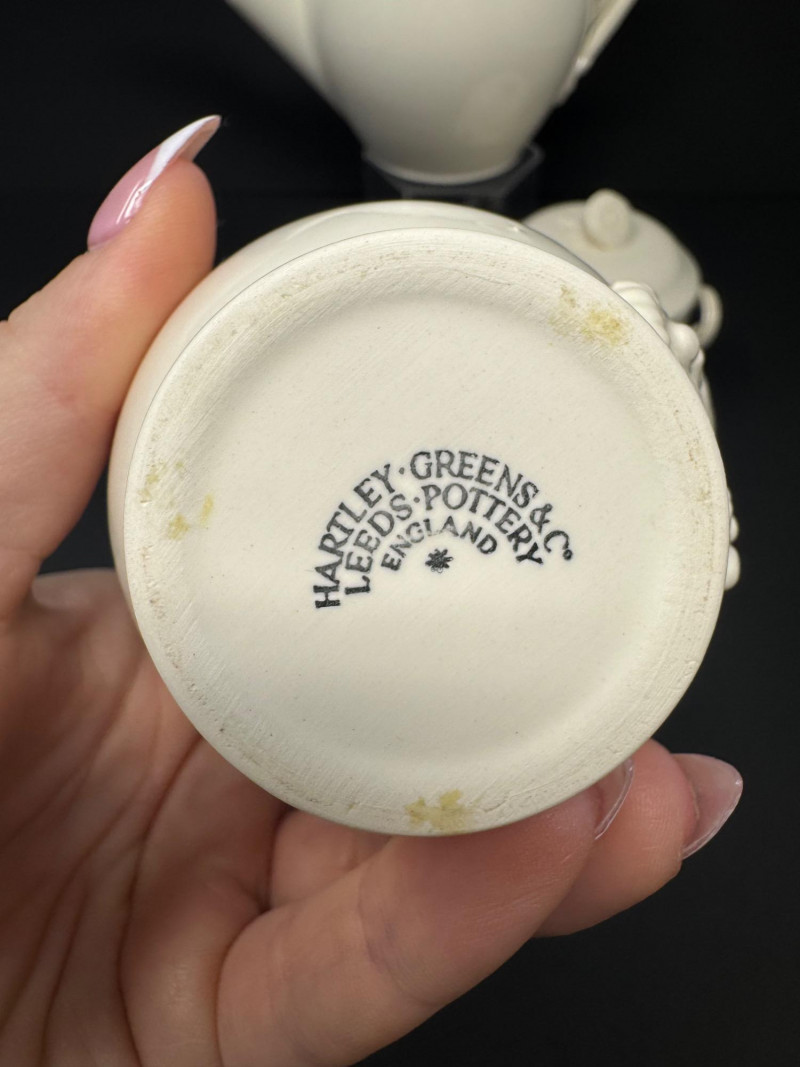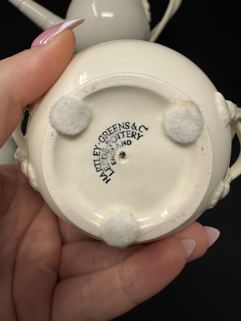 Hartley Greens Leeds Pottery Creamware Teapot Set - Signed. Includes: signed teapot (5.5" tall, 9.5" wide), lidded sugar bowl, and creamer.
