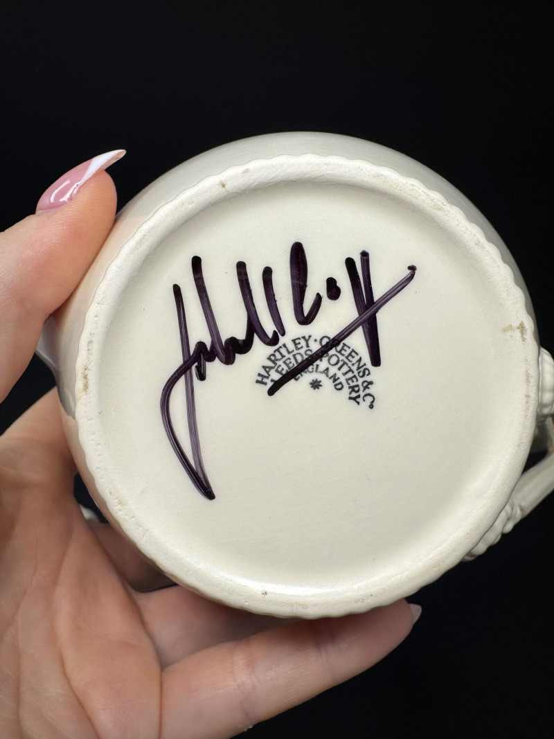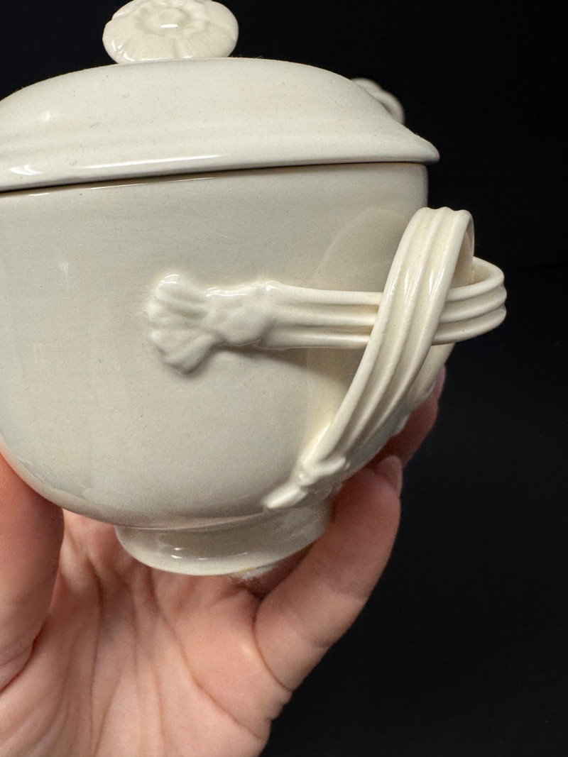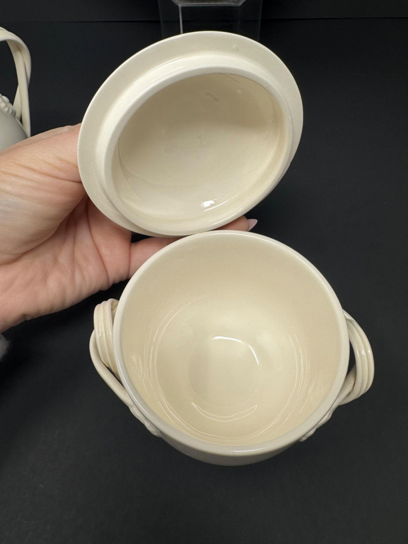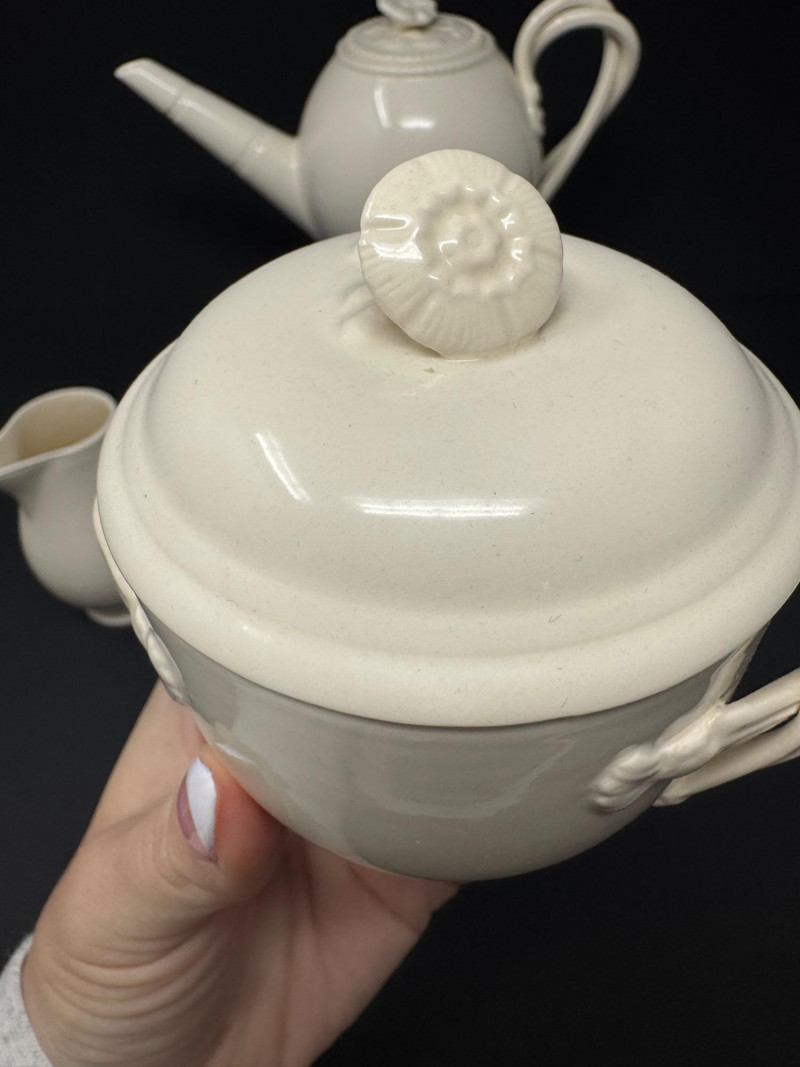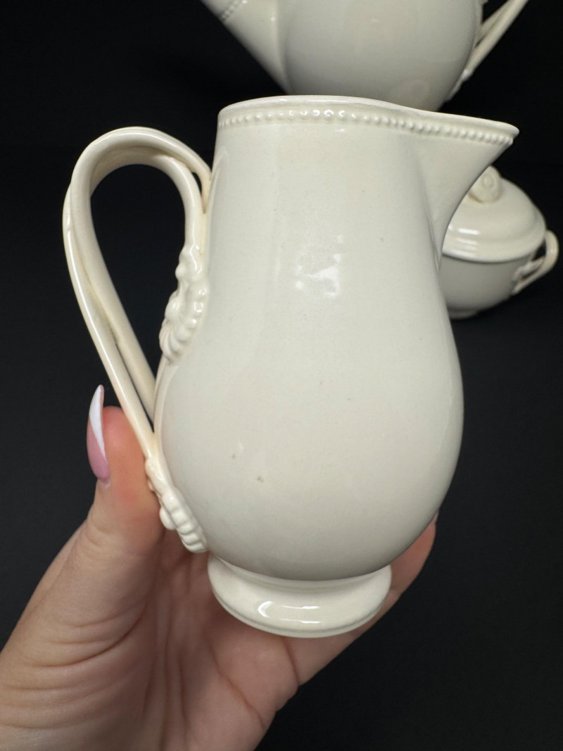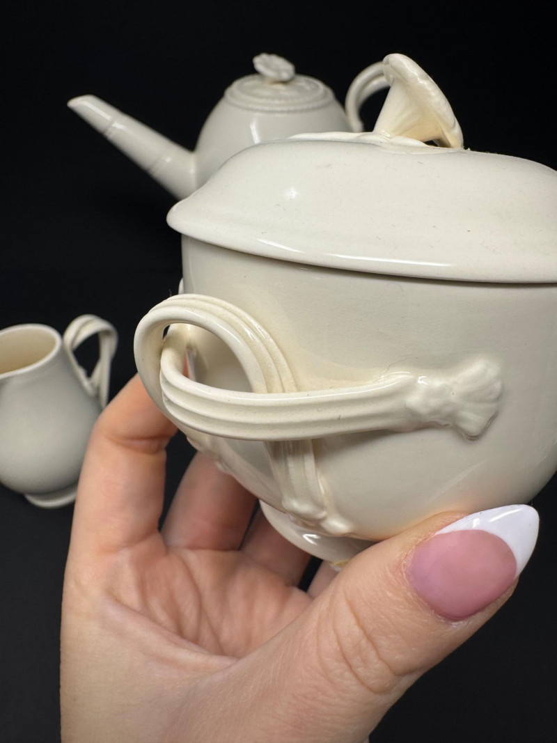 Hartley Greens Leeds Pottery Creamware Teapot Set - Signed. Includes: signed teapot (5.5" tall, 9.5" wide), lidded sugar bowl, and creamer.
