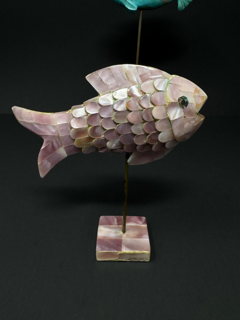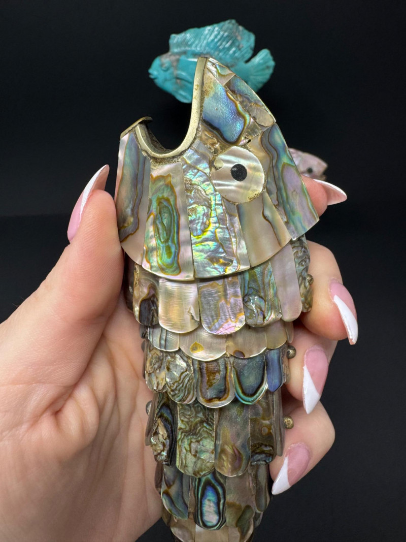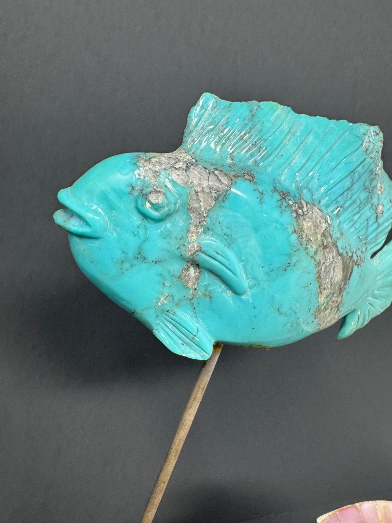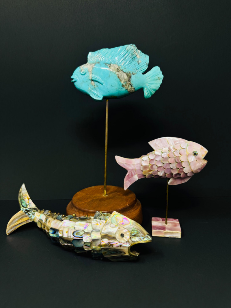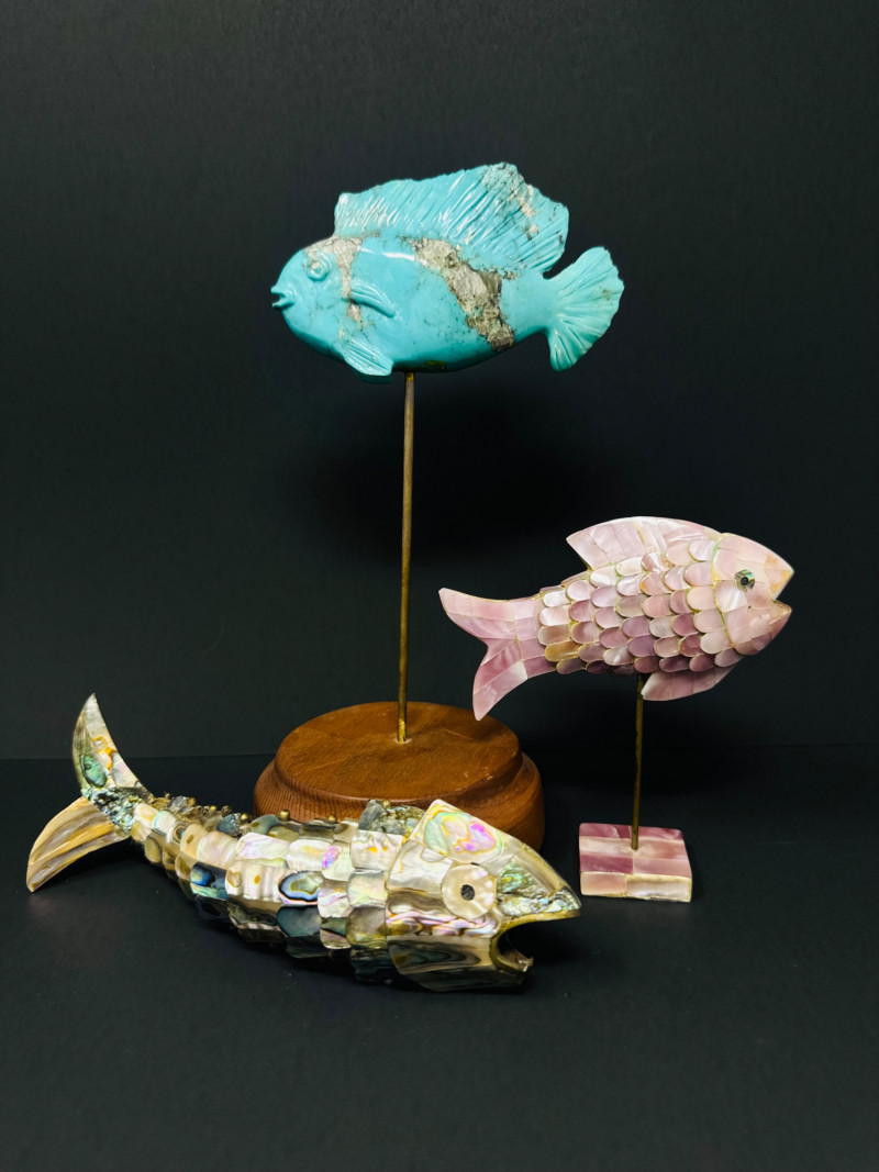 Stone & Shell Carved Fish Lot – Turquoise Tone, Pink, Abalone.
