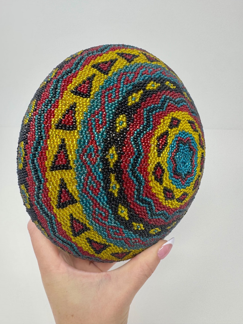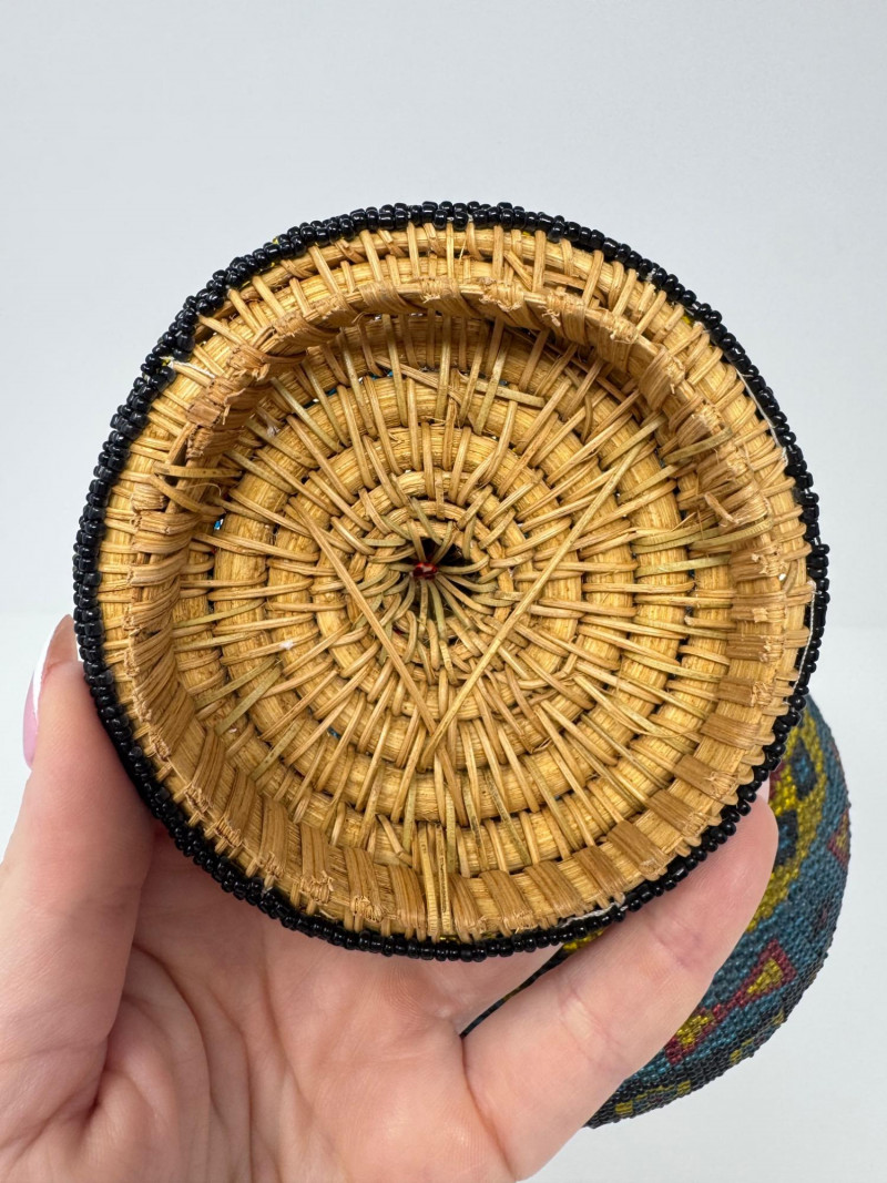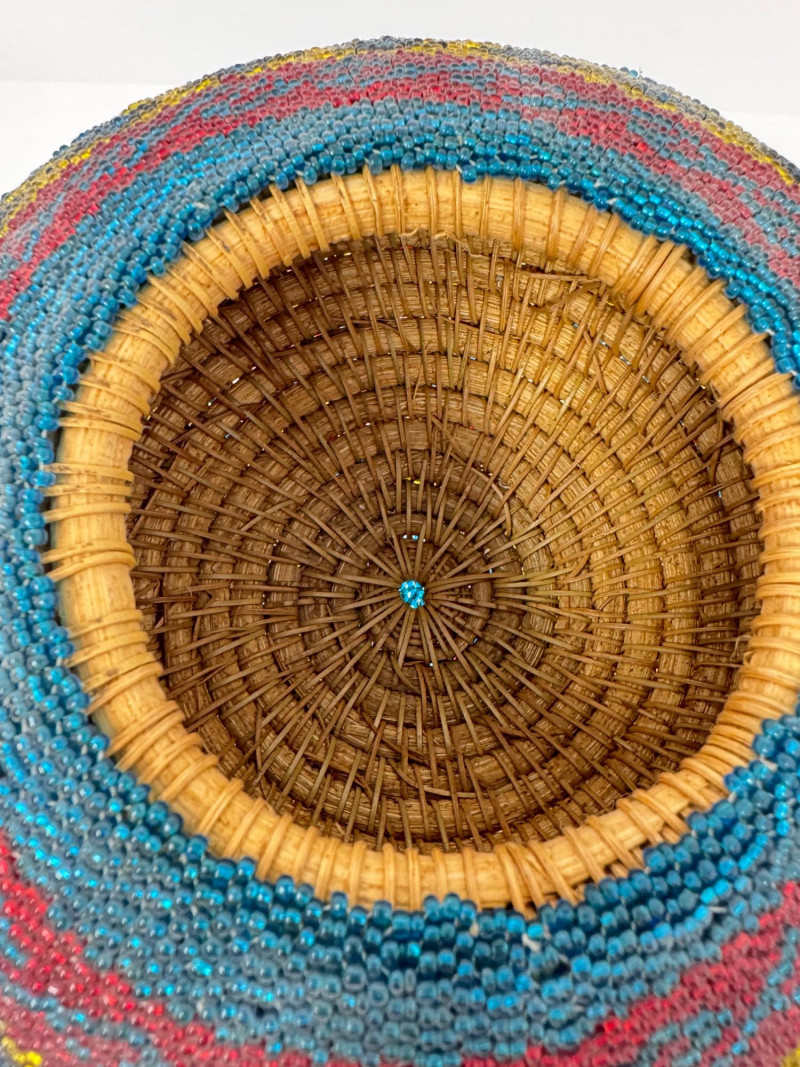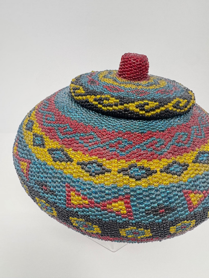 Lot # 9 - Handmade Round Lidded Basket w/ Rainbow Bead Pattern