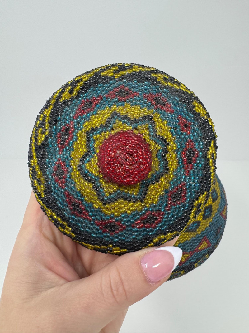 Handmade Round Lidded Basket w/ Rainbow Bead Pattern. Measures approx. 5.5" tall x 7" wide
