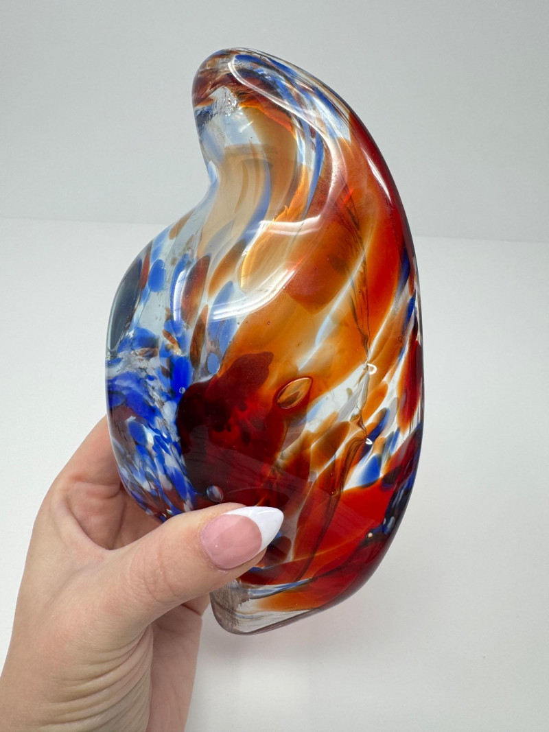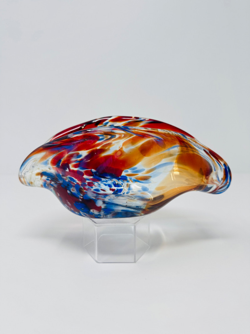 Blown Art Glass Shell Form Bowl - Red, Blue, & Amber Swirl. Measures approx. 3" tall x 7" wide