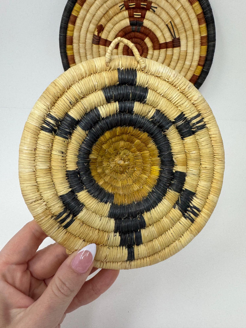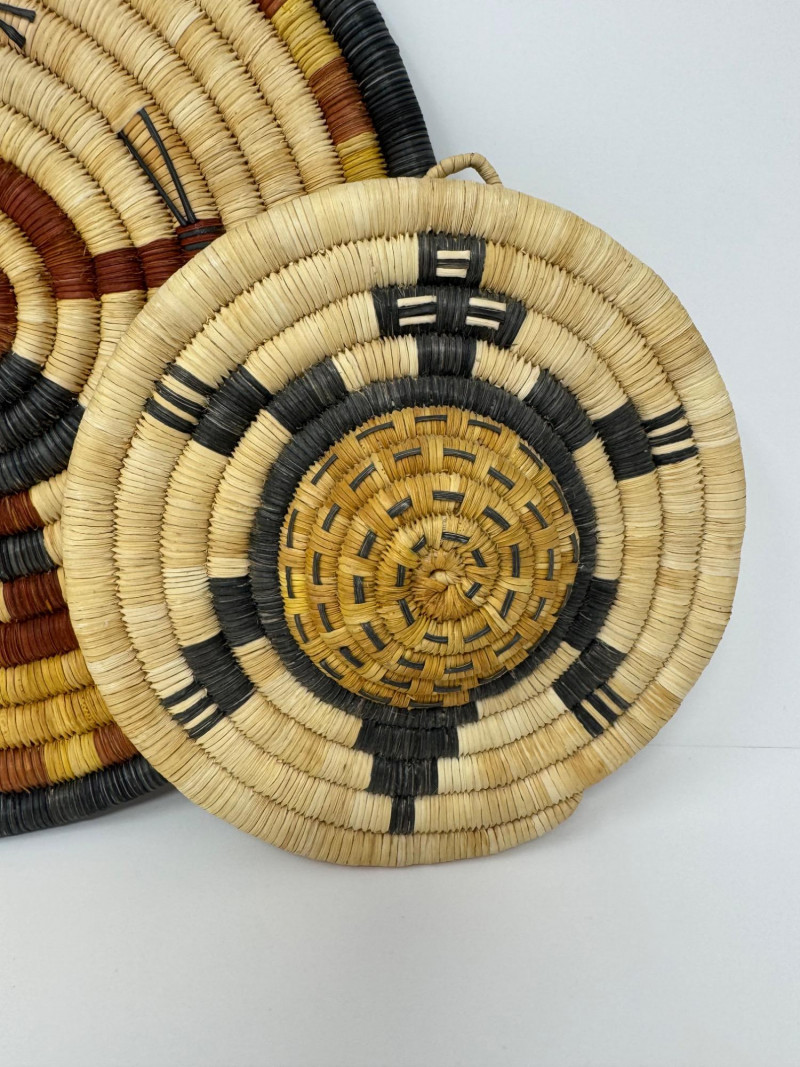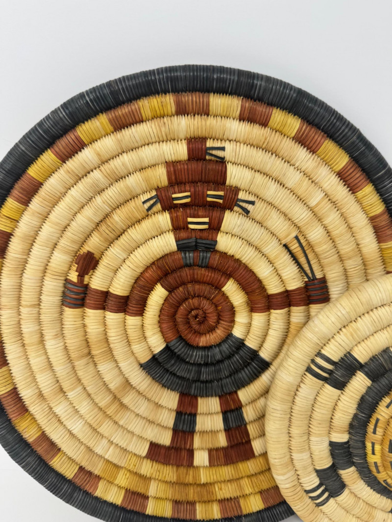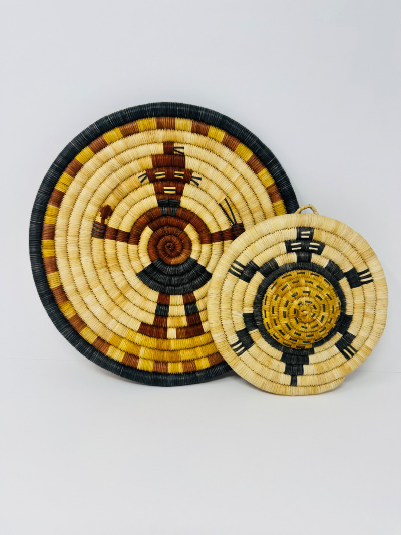 Hopi Coiled Plaque Basket Set w/ Mudhead Kachina & Geometric. Sizes approx. 10" and 6" diameter