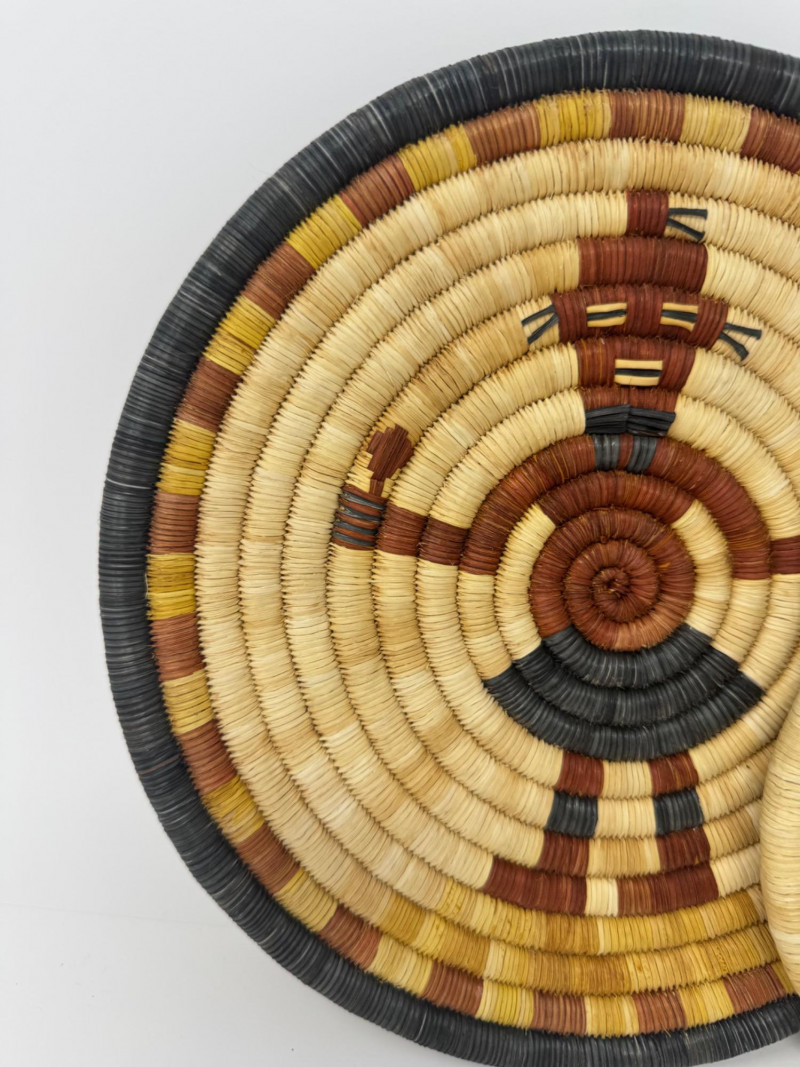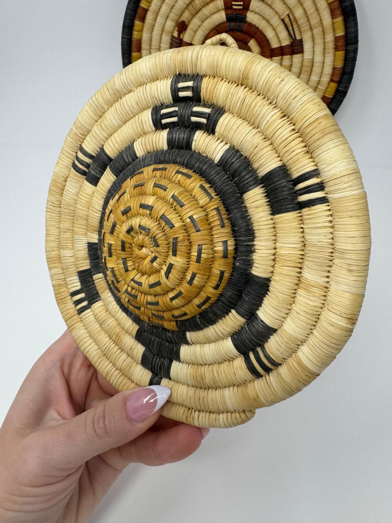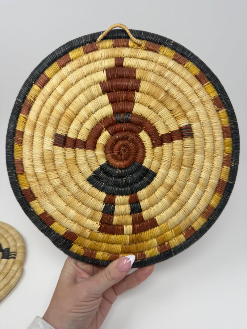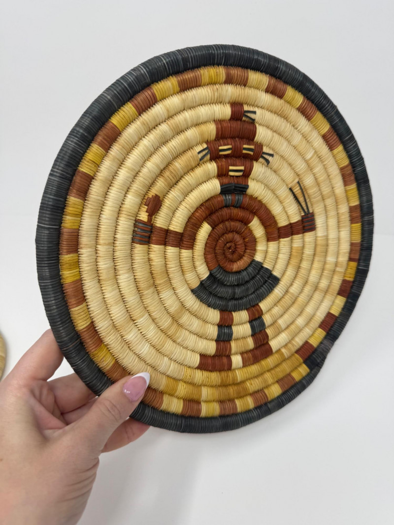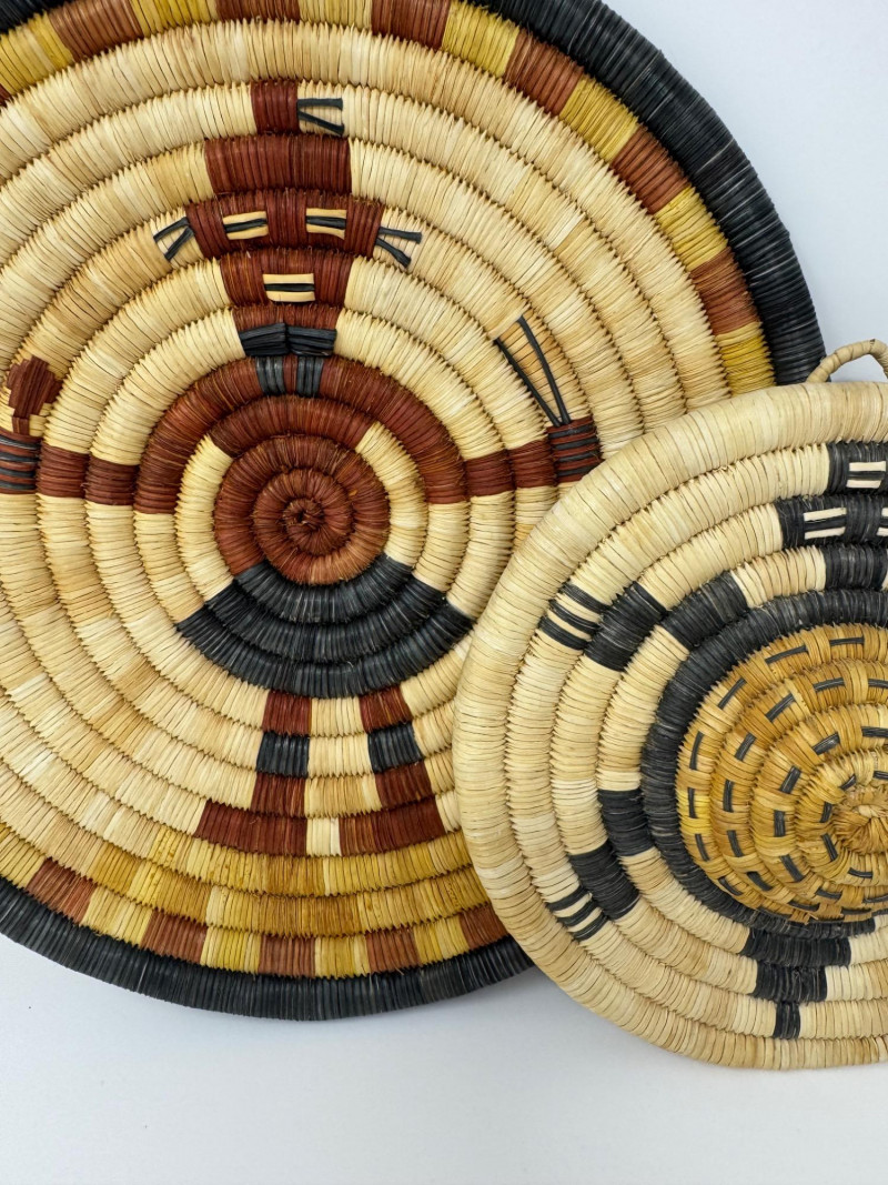Hopi Coiled Plaque Basket Set w/ Mudhead Kachina & Geometric. Sizes approx. 10" and 6" diameter