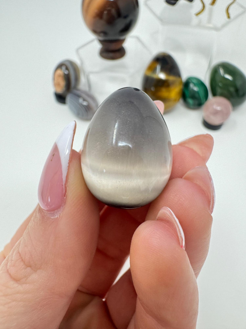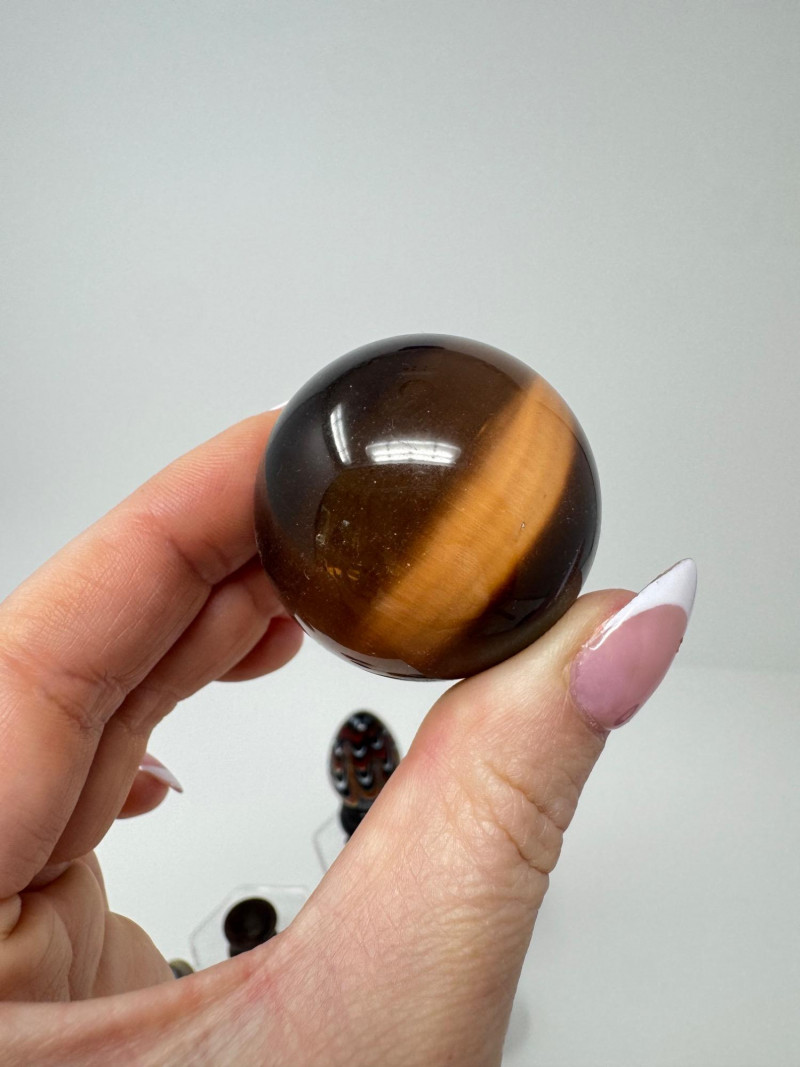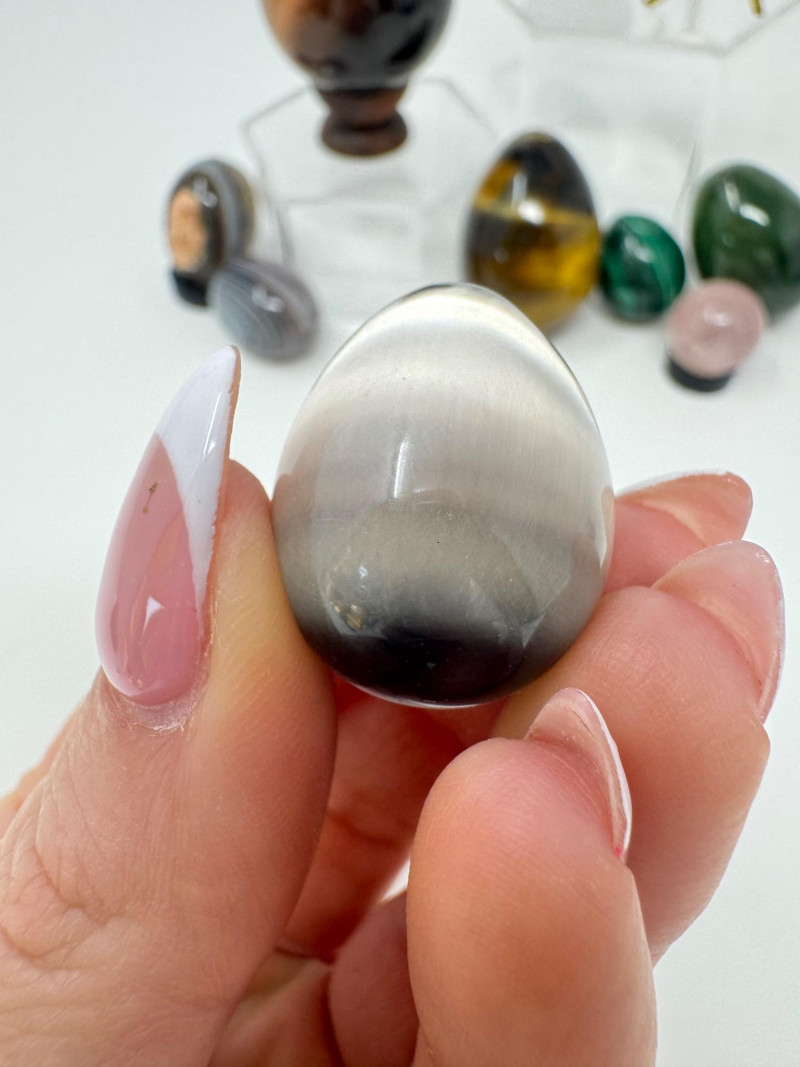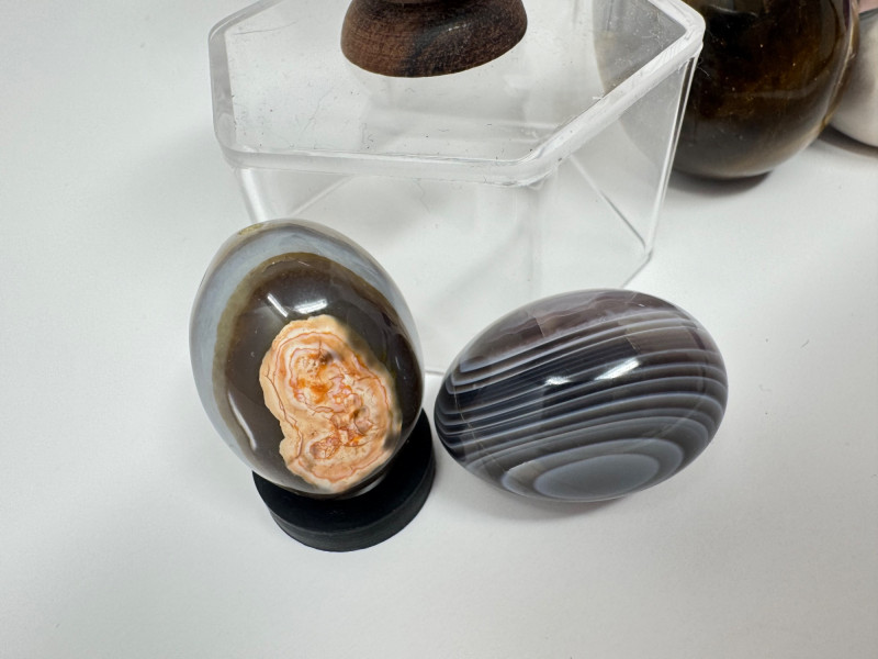 10 Polished Stone Eggs & Spheres – Tiger Eye, Malachite, Agate. Approx. 1–2" each. Please note: These mineral specimens have not been professionally tested or identified. They are offered "as-is" based on visual assessment. All items are sold "as is" with no guarantees regarding quality, content, or purity. By placing a bid, you acknowledge and agree to these terms. Refunds will not be issued based on these factors.