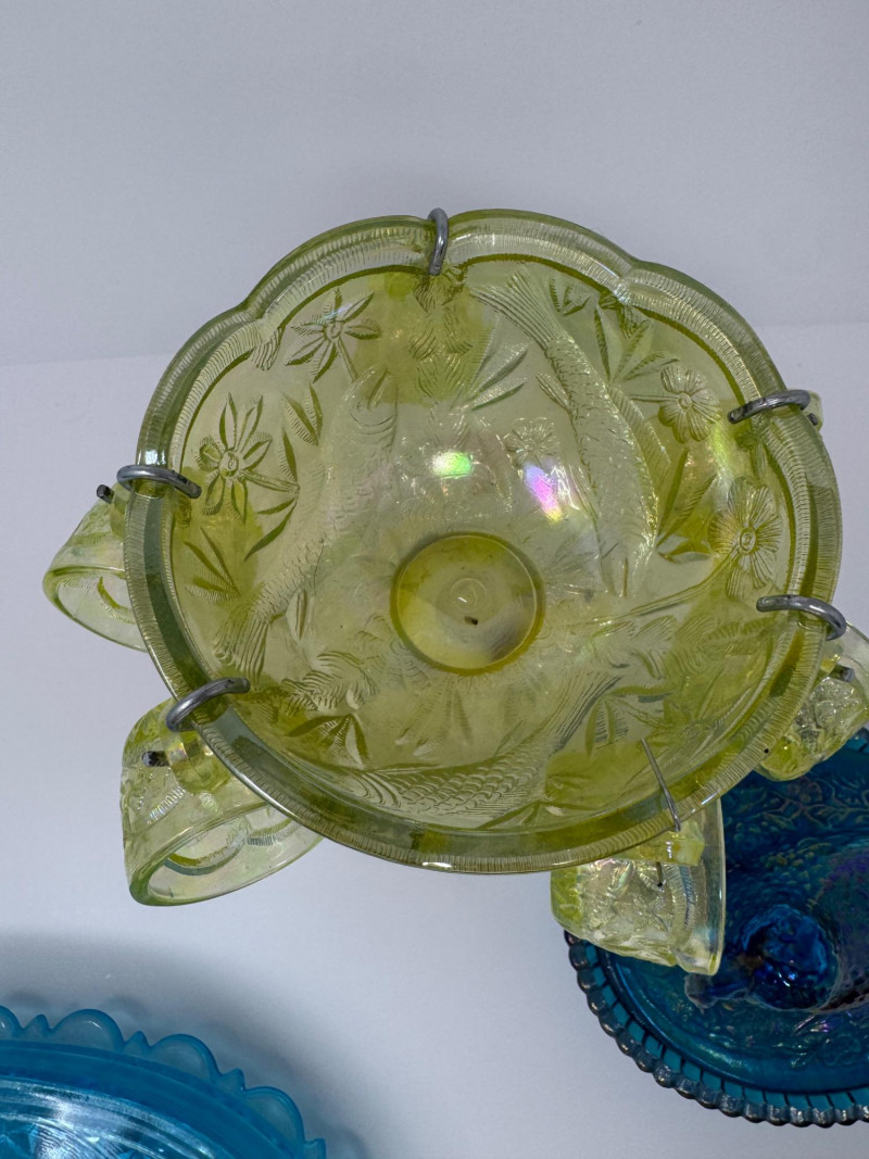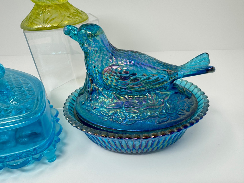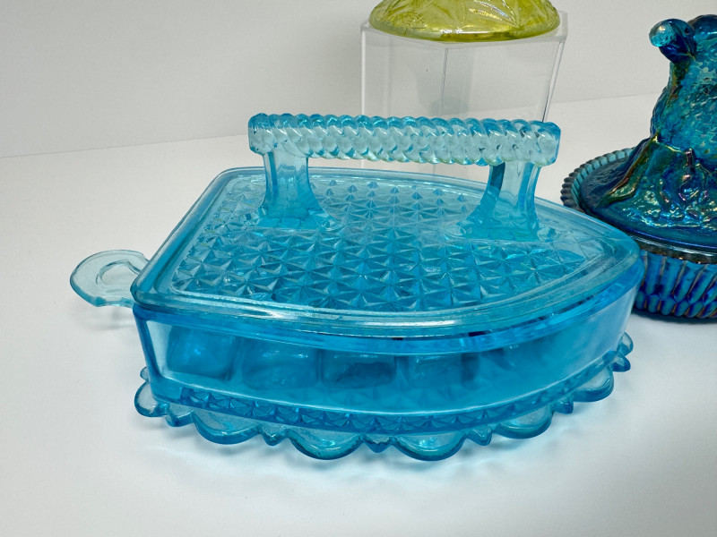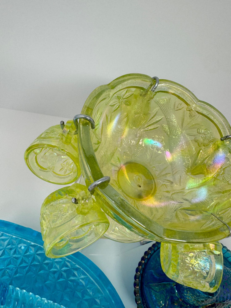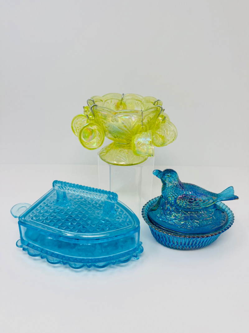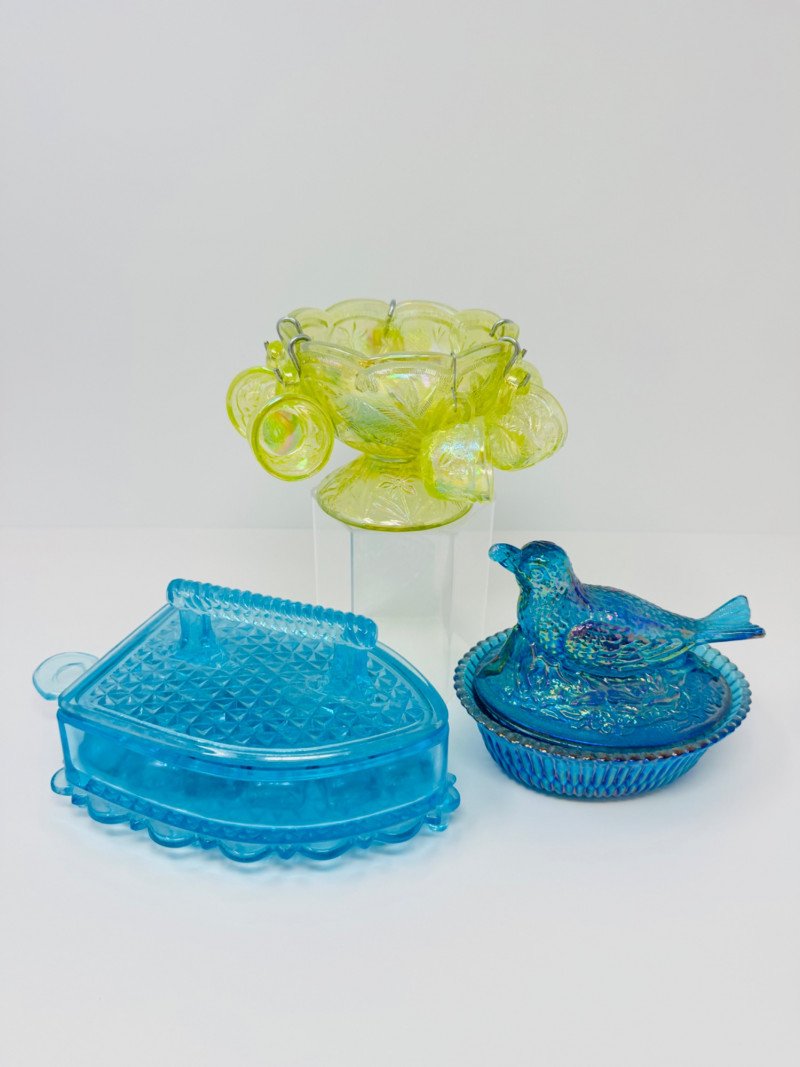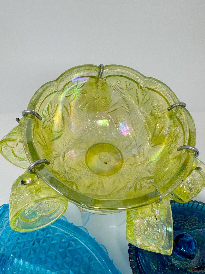 Vintage Blue Flat Iron Dish, Bird Candy Dish & Yellow Punch Bowl Set. Early American Pressed Glass - Sky Blue Flat Iron Butter Dish Bird & Berry on Nest Candy Dish - Bird on nest design with berry detail Mini Yellow Vaseline Carnival Punch Bowl Set