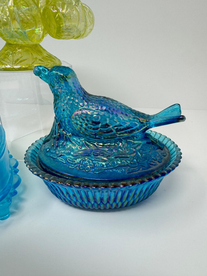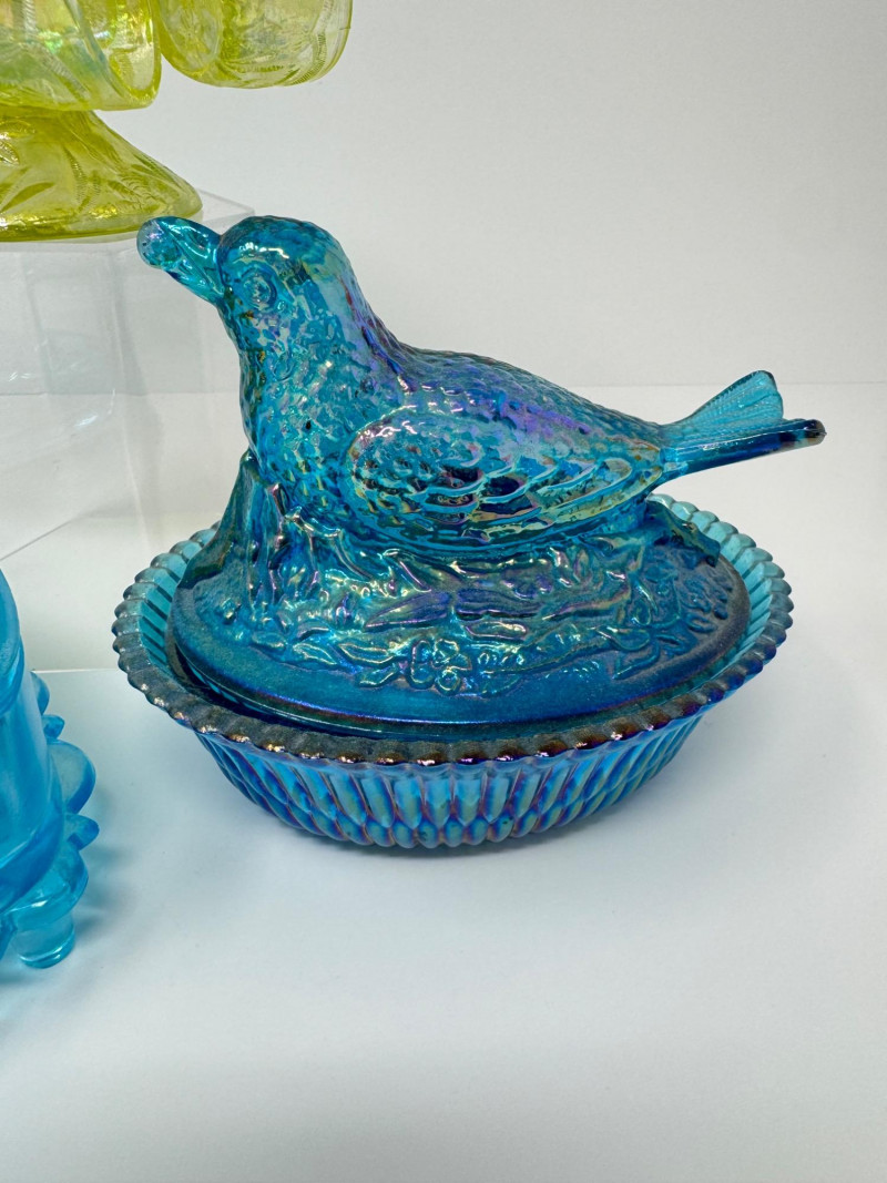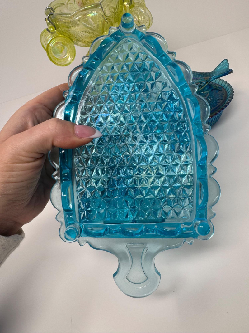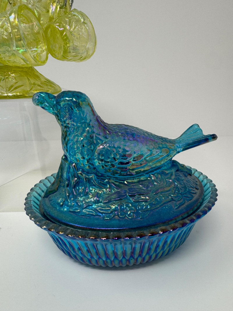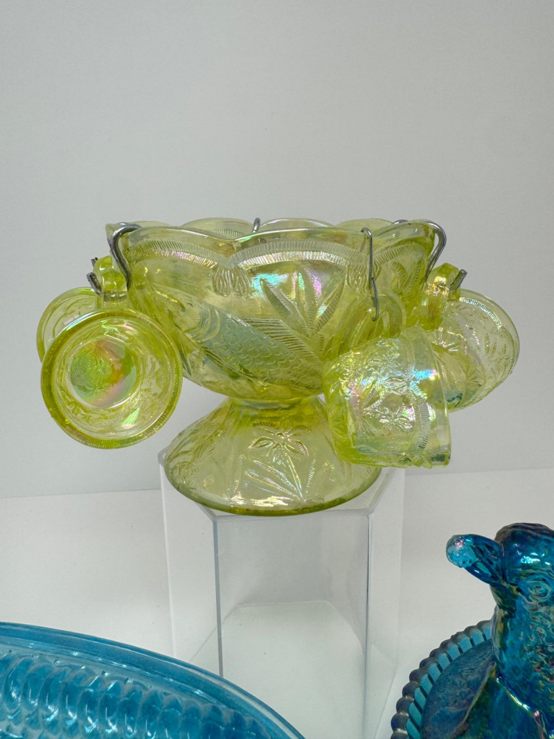 Vintage Blue Flat Iron Dish, Bird Candy Dish & Yellow Punch Bowl Set. Early American Pressed Glass - Sky Blue Flat Iron Butter Dish Bird & Berry on Nest Candy Dish - Bird on nest design with berry detail Mini Yellow Vaseline Carnival Punch Bowl Set