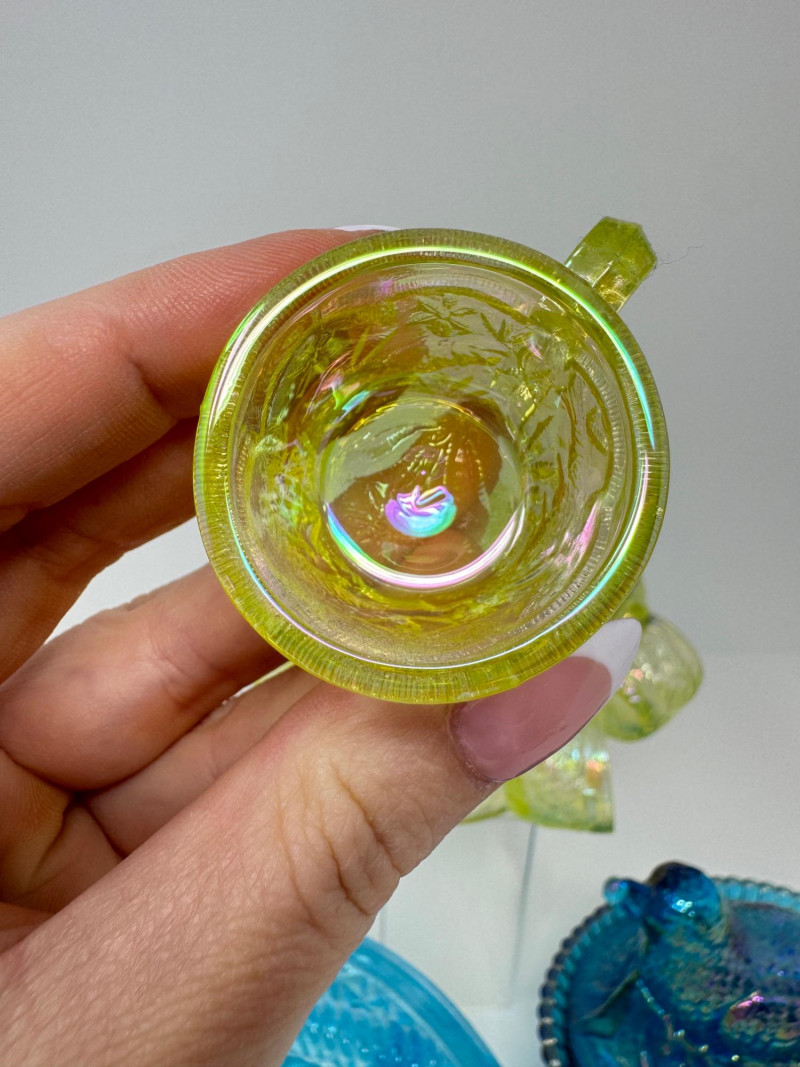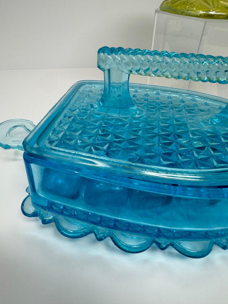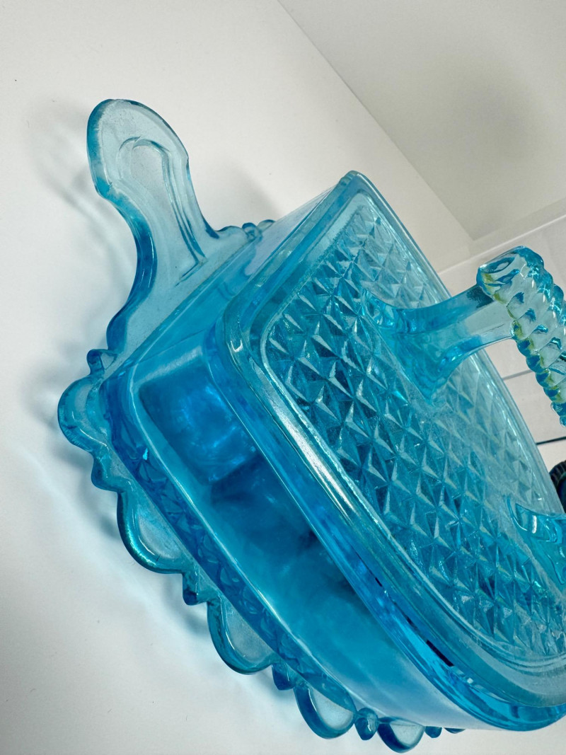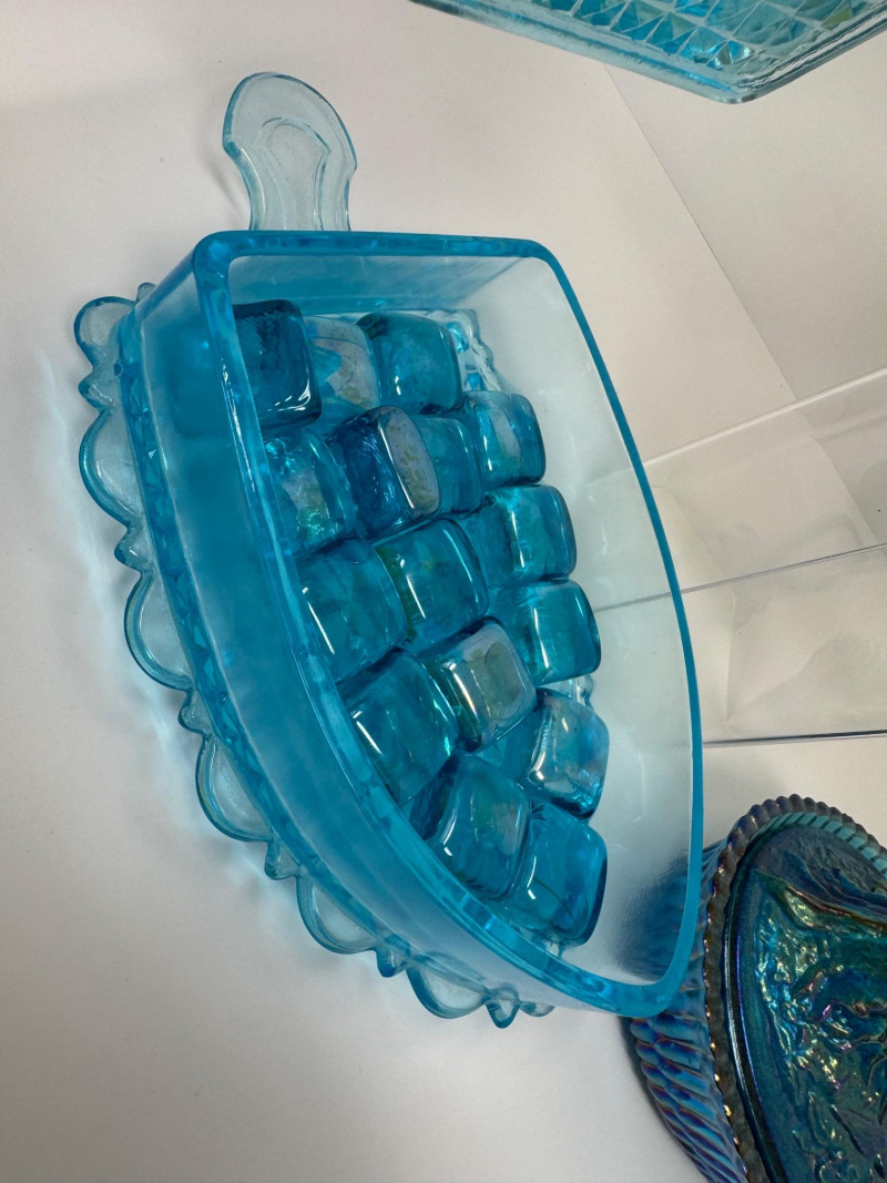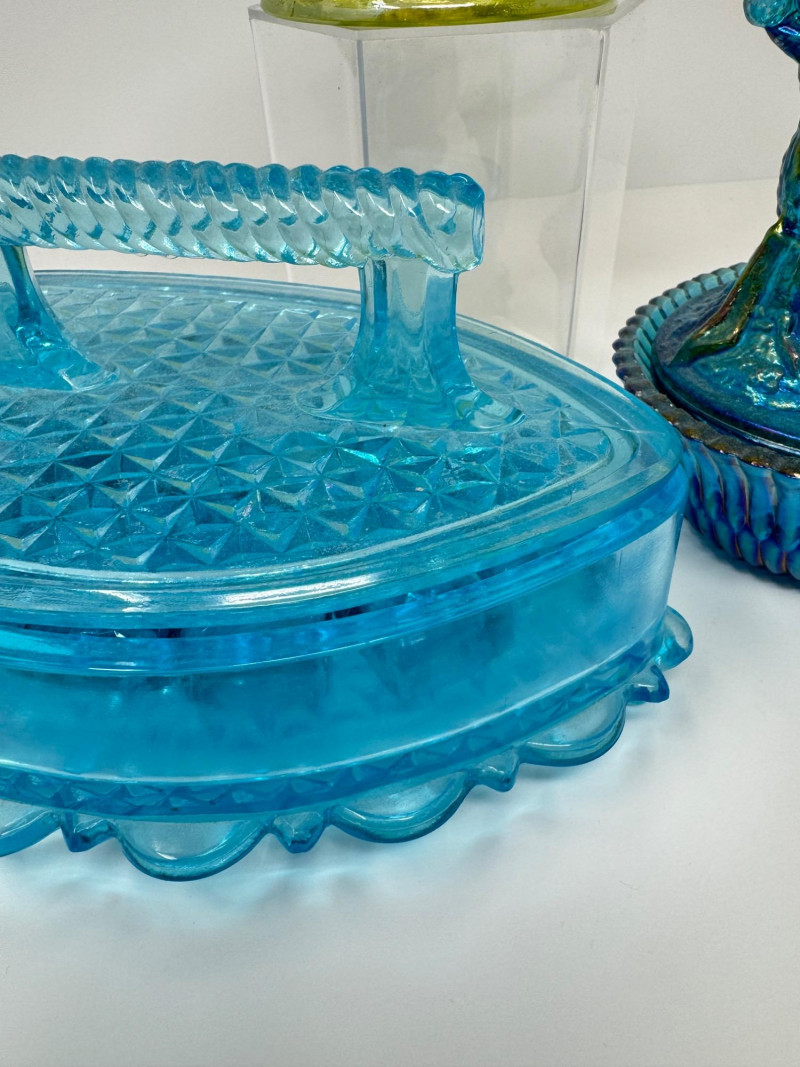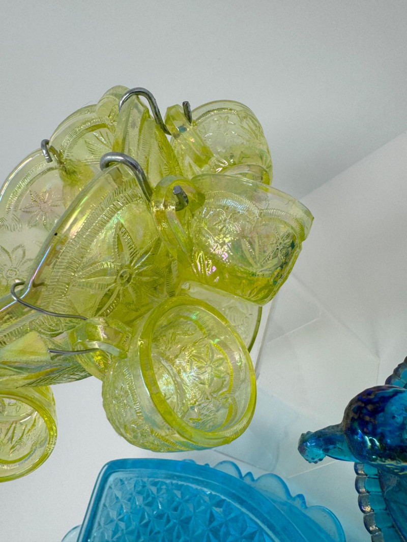 Vintage Blue Flat Iron Dish, Bird Candy Dish & Yellow Punch Bowl Set. Early American Pressed Glass - Sky Blue Flat Iron Butter Dish Bird & Berry on Nest Candy Dish - Bird on nest design with berry detail Mini Yellow Vaseline Carnival Punch Bowl Set