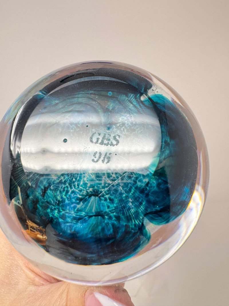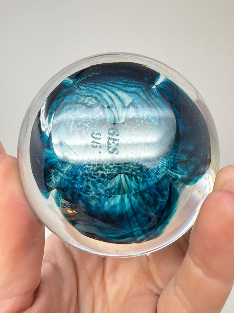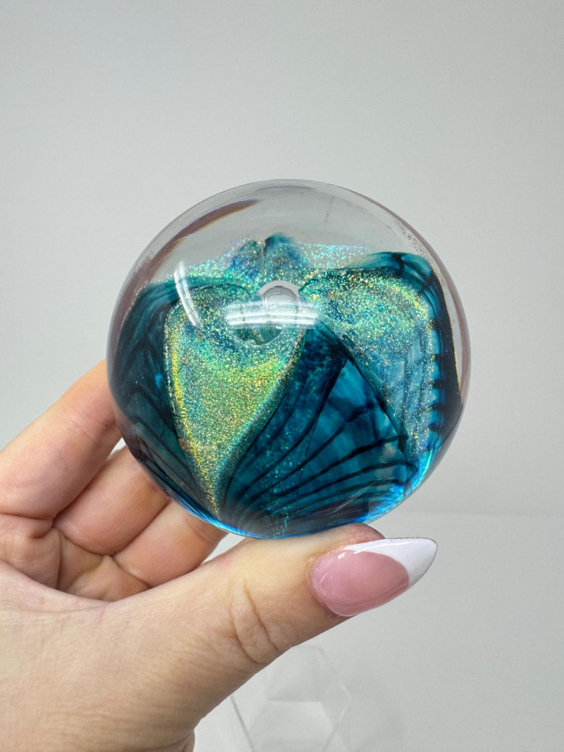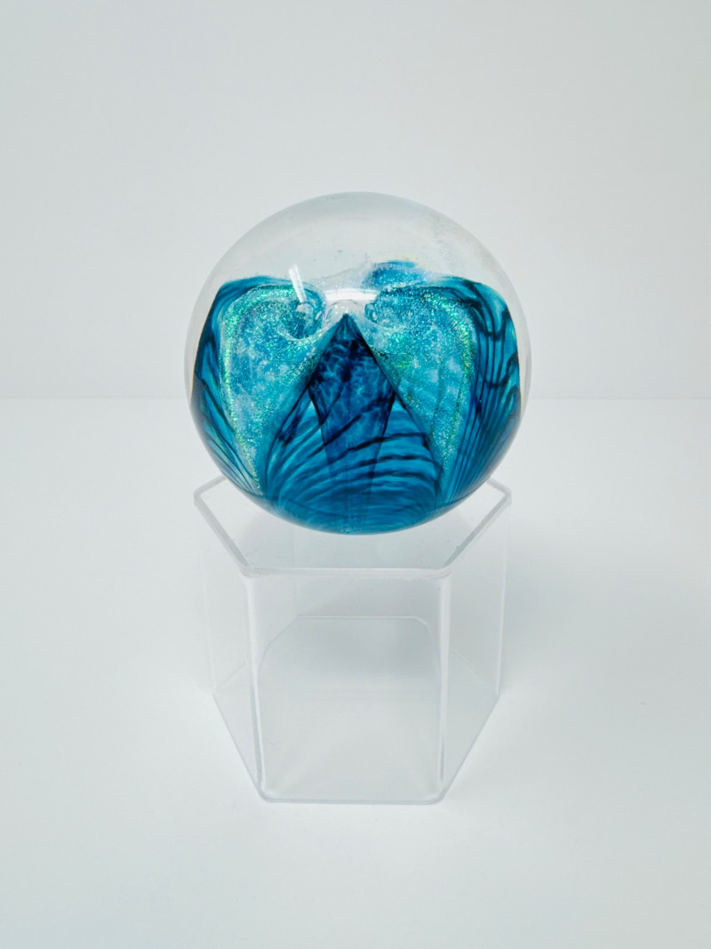 Glass Eye Studio Aqua Blue Paperweight w/ Gold Fleck Passion Flower. 2.5” Tall