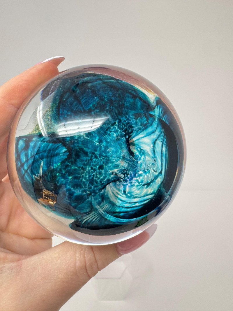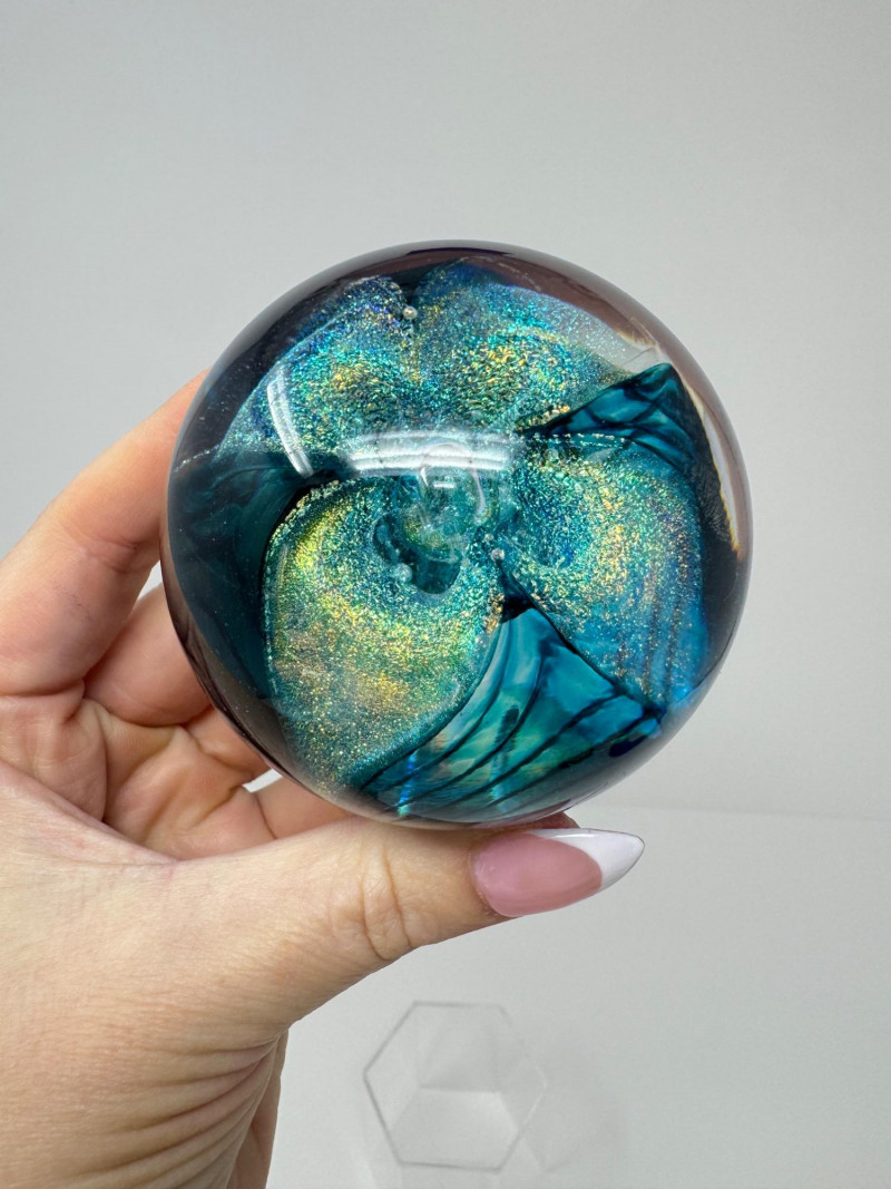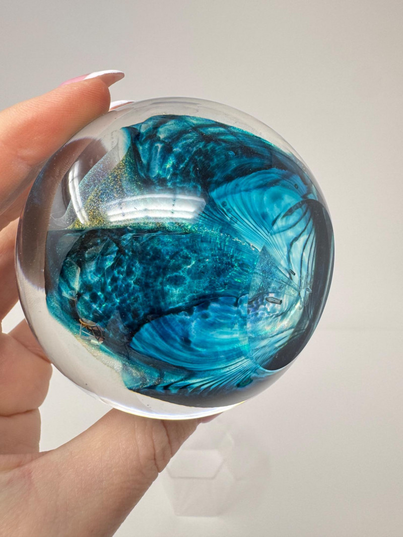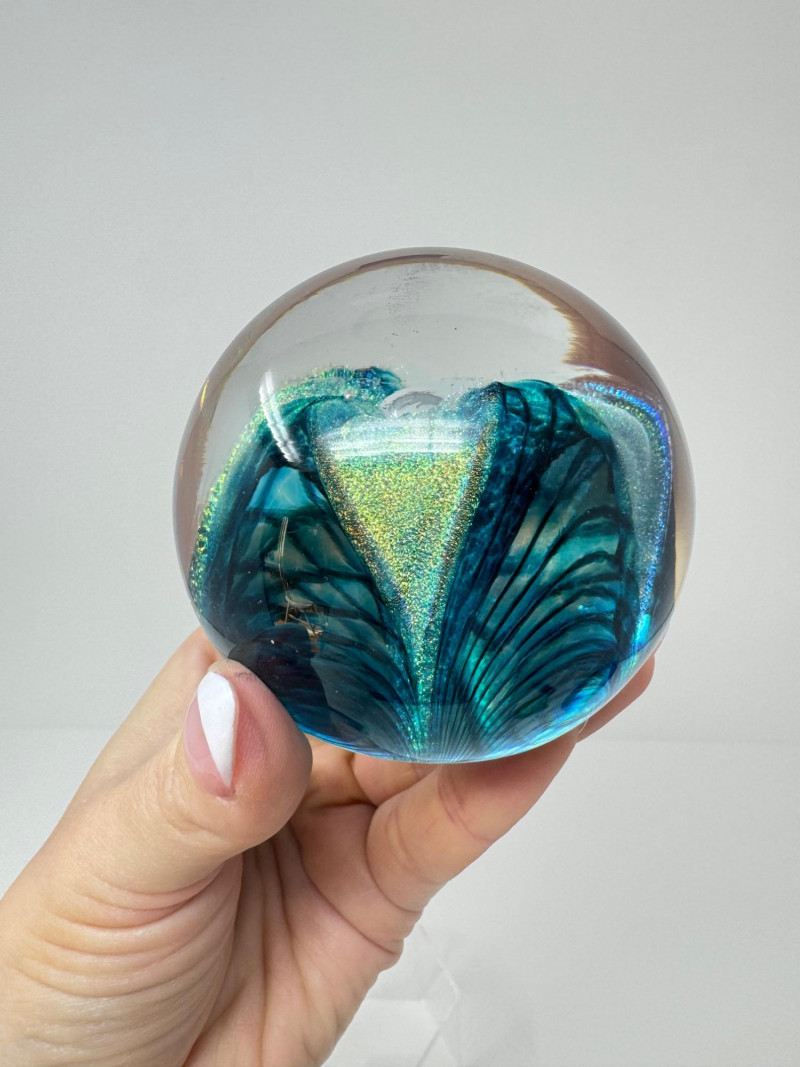 Glass Eye Studio Aqua Blue Paperweight w/ Gold Fleck Passion Flower. 2.5” Tall