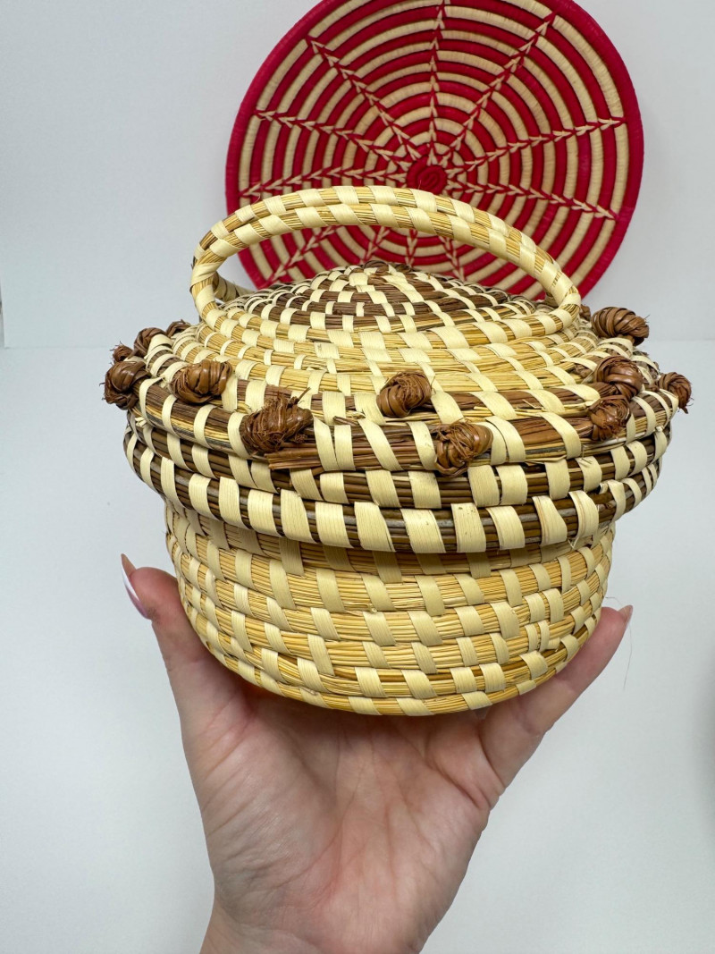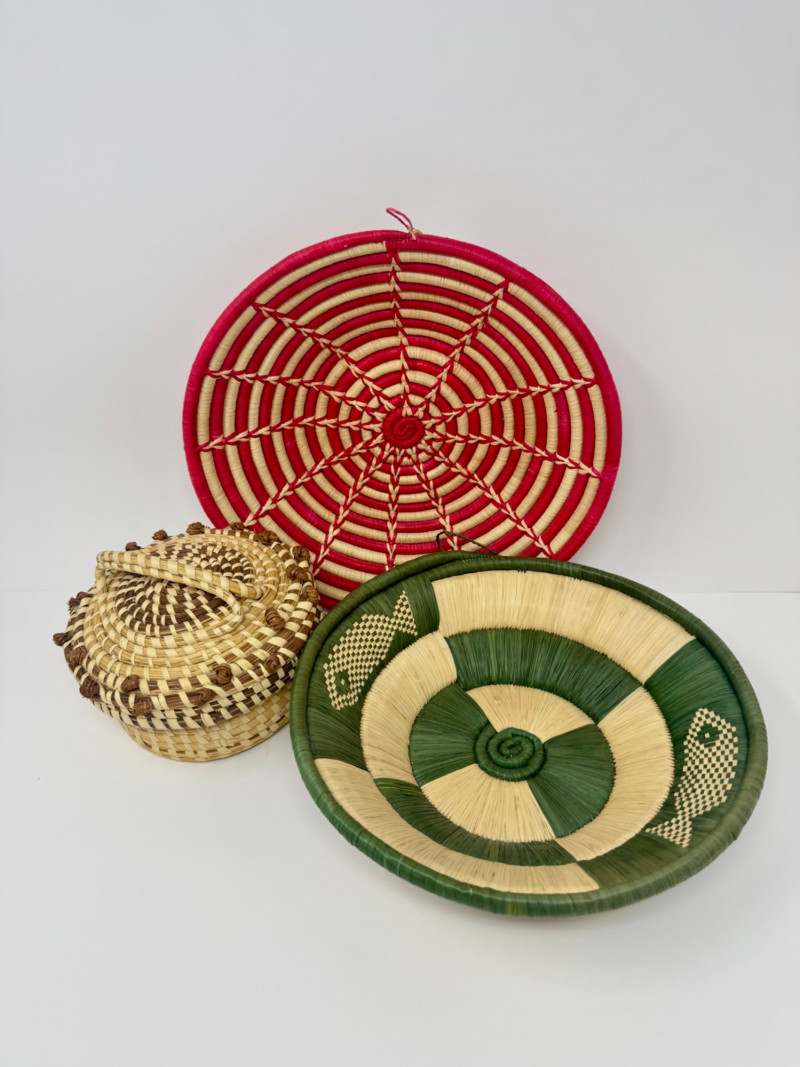 Set of 3 Handwoven Baskets – Sweetgrass, Uganda, & Fish Design.